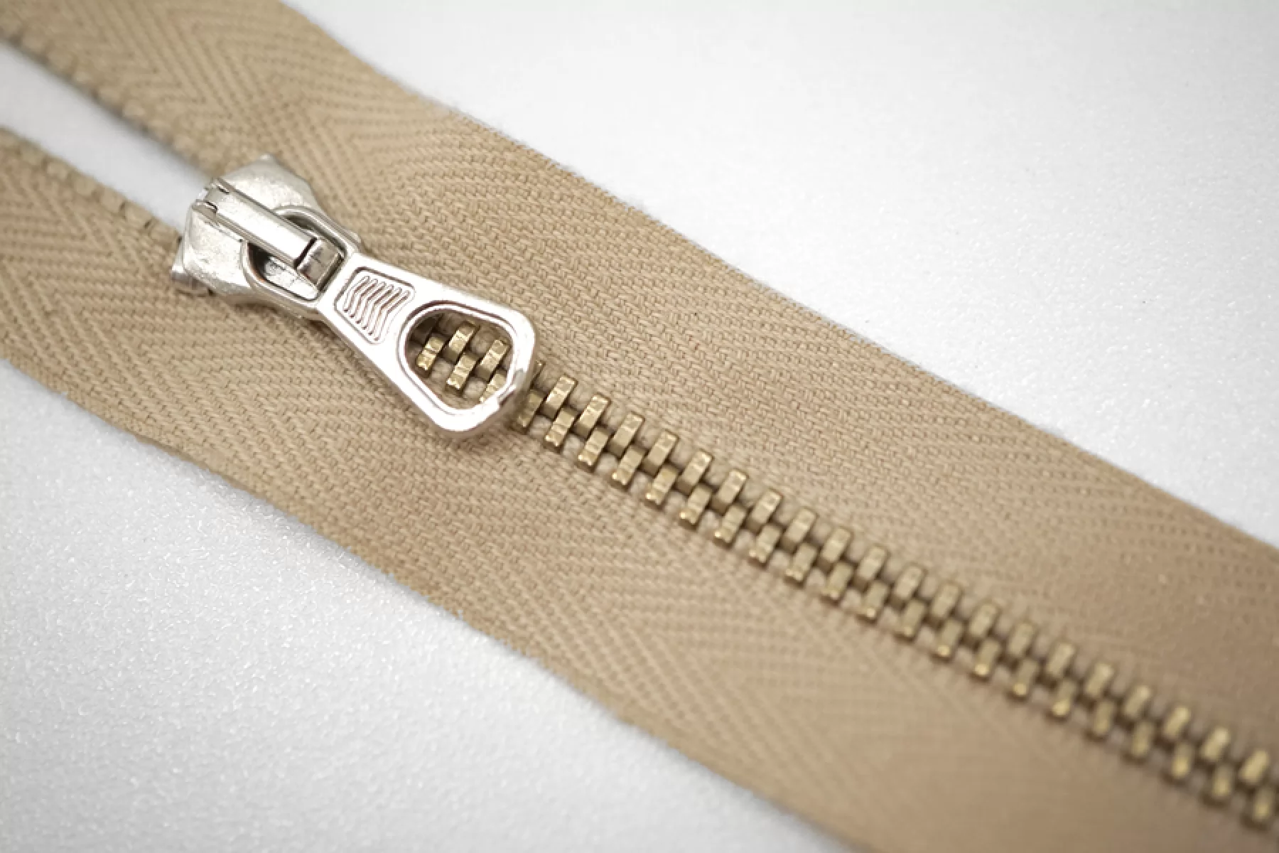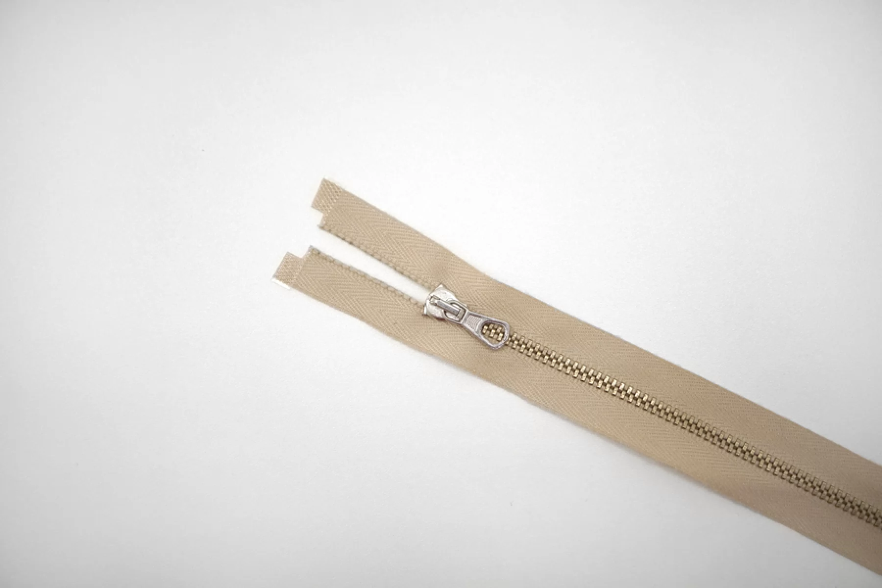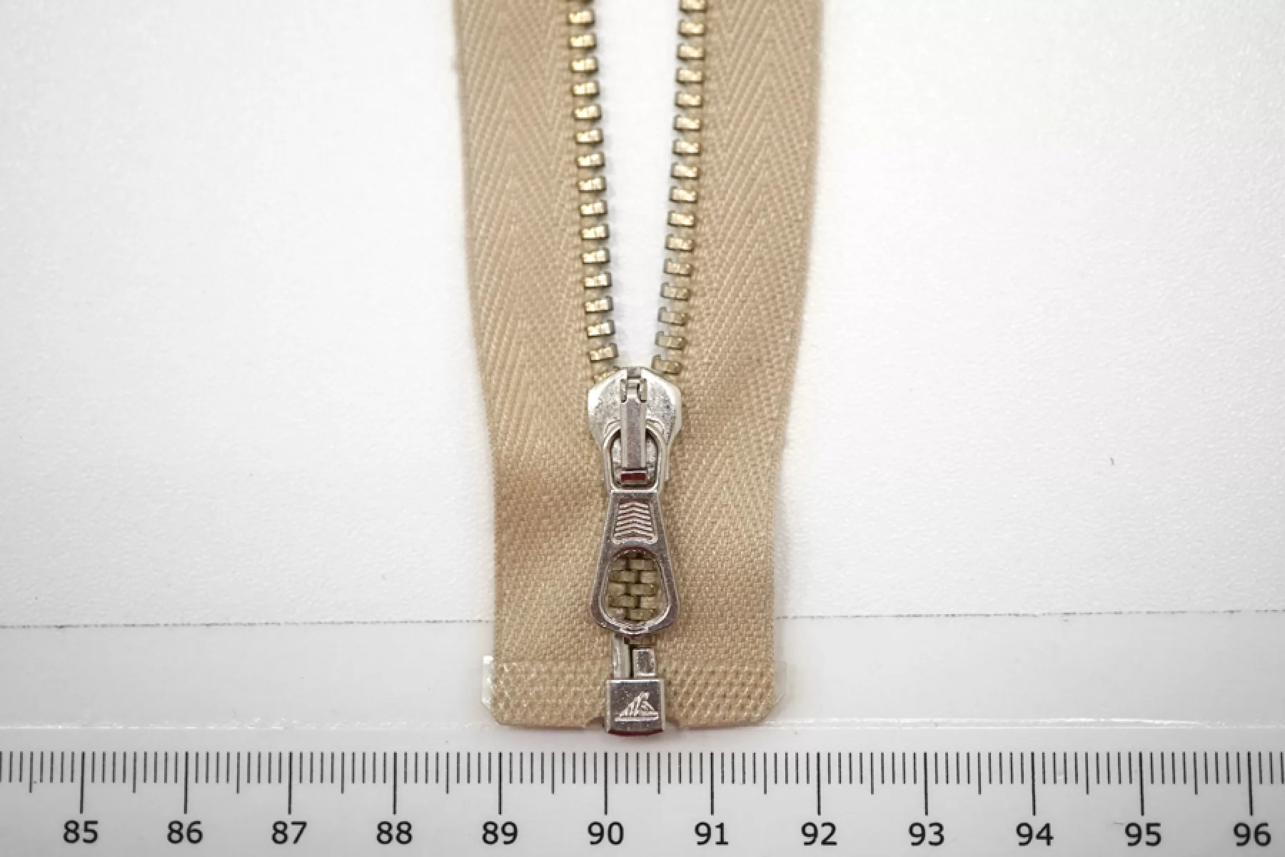 Молния металлическая от "Lampo" разъёмная, бежевого цвета, цвет зубцов золотистый, пулера и слайдера серебристый. Длина 48 см.