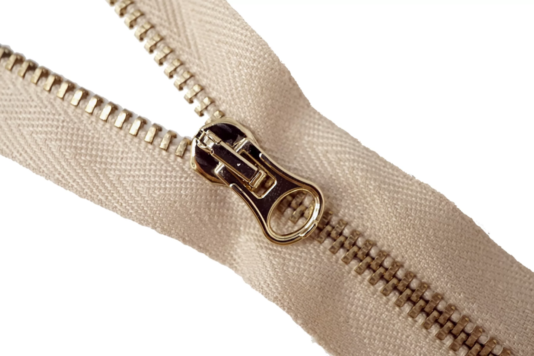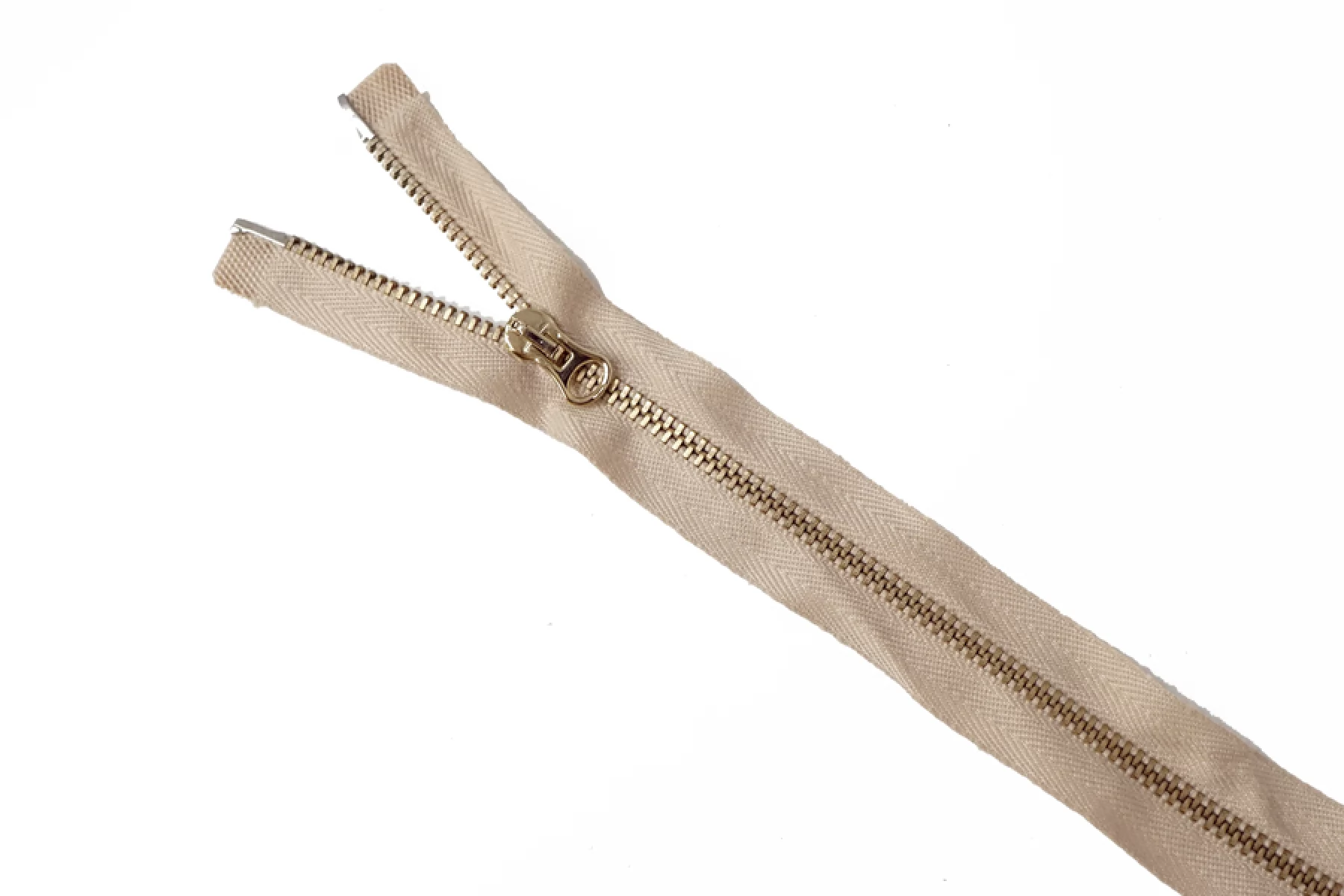 Молния металлическая от "Lampo" двухзамковая, разъёмная, бежевая, цвет зубцов металлический золотистый, слайдер и пулер золотистый. Длина 48 см. Ширина молнии 2,6 см. Ширина зубцов 5 мм.