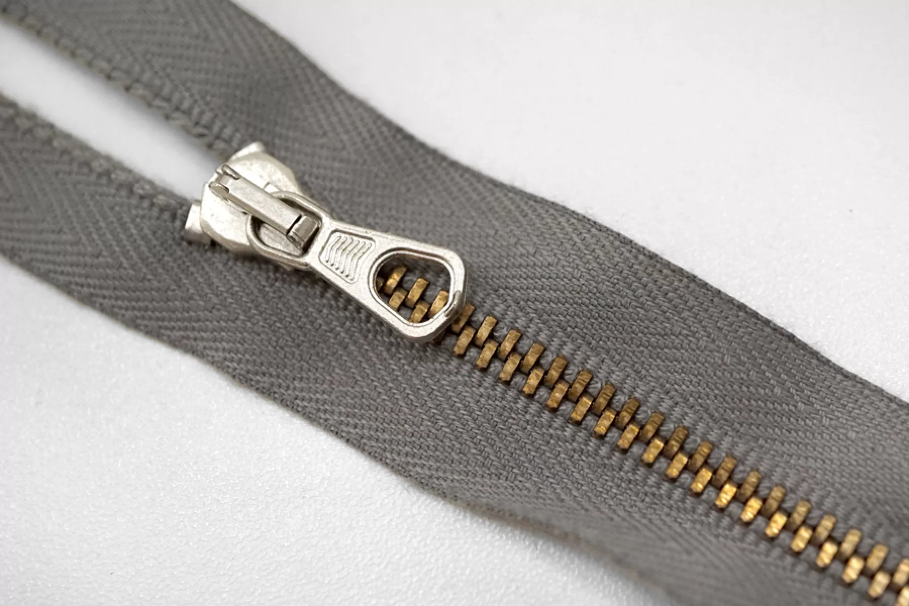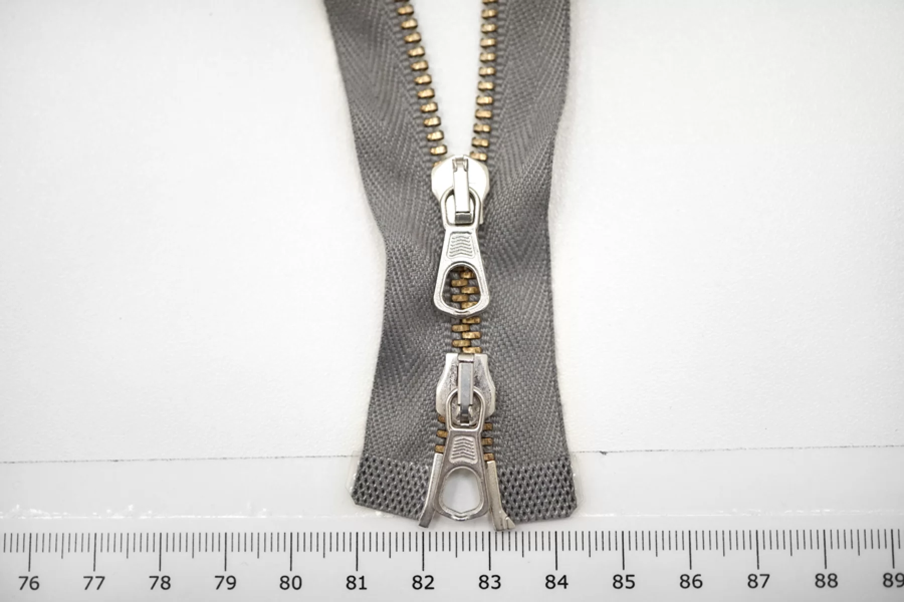 Молния металлическая от "Lampo" двухзамковая, разъёмная, серая, цвет зубцов золотистый, цвет пуллера и слайдера серебристый. Длина 46 см.