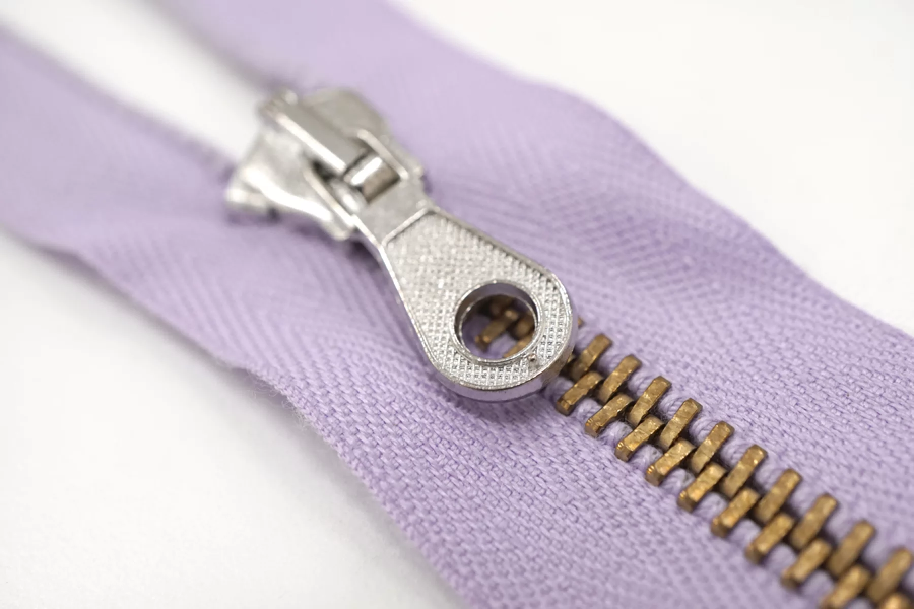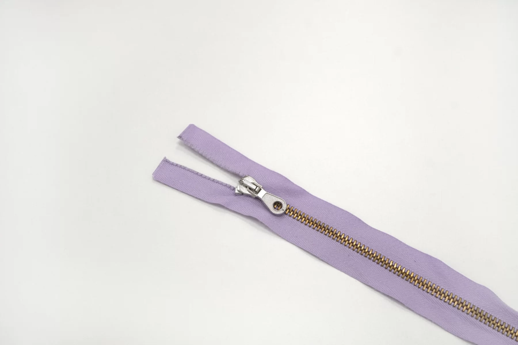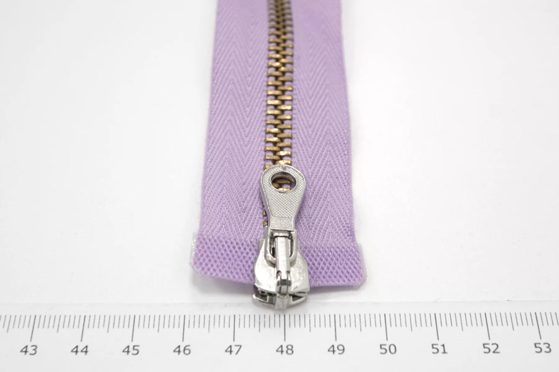 Молния металлическая от "Lampo" двухзамковая, разъёмная, сиреневая, цвет зубцов золотистый, слайдер и пулер серебристый. Длина 59 см.