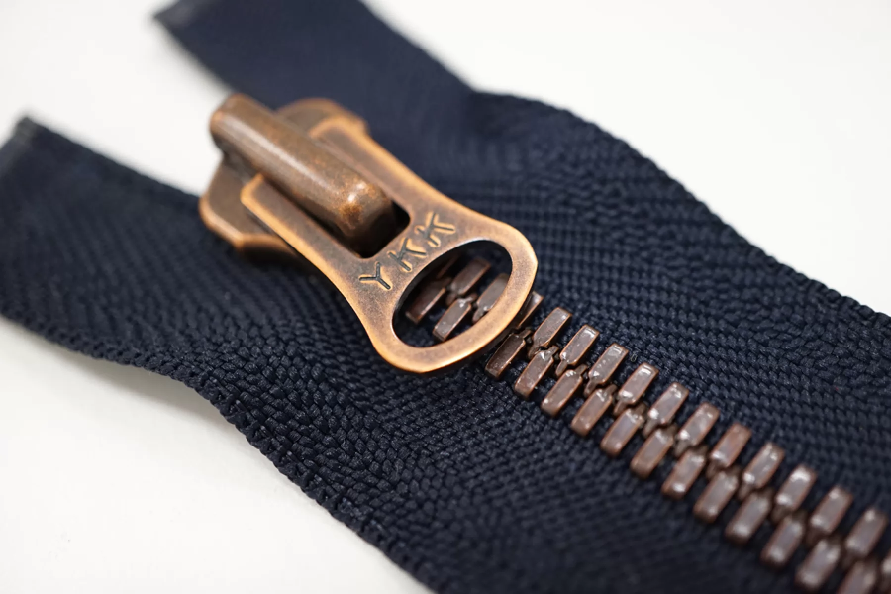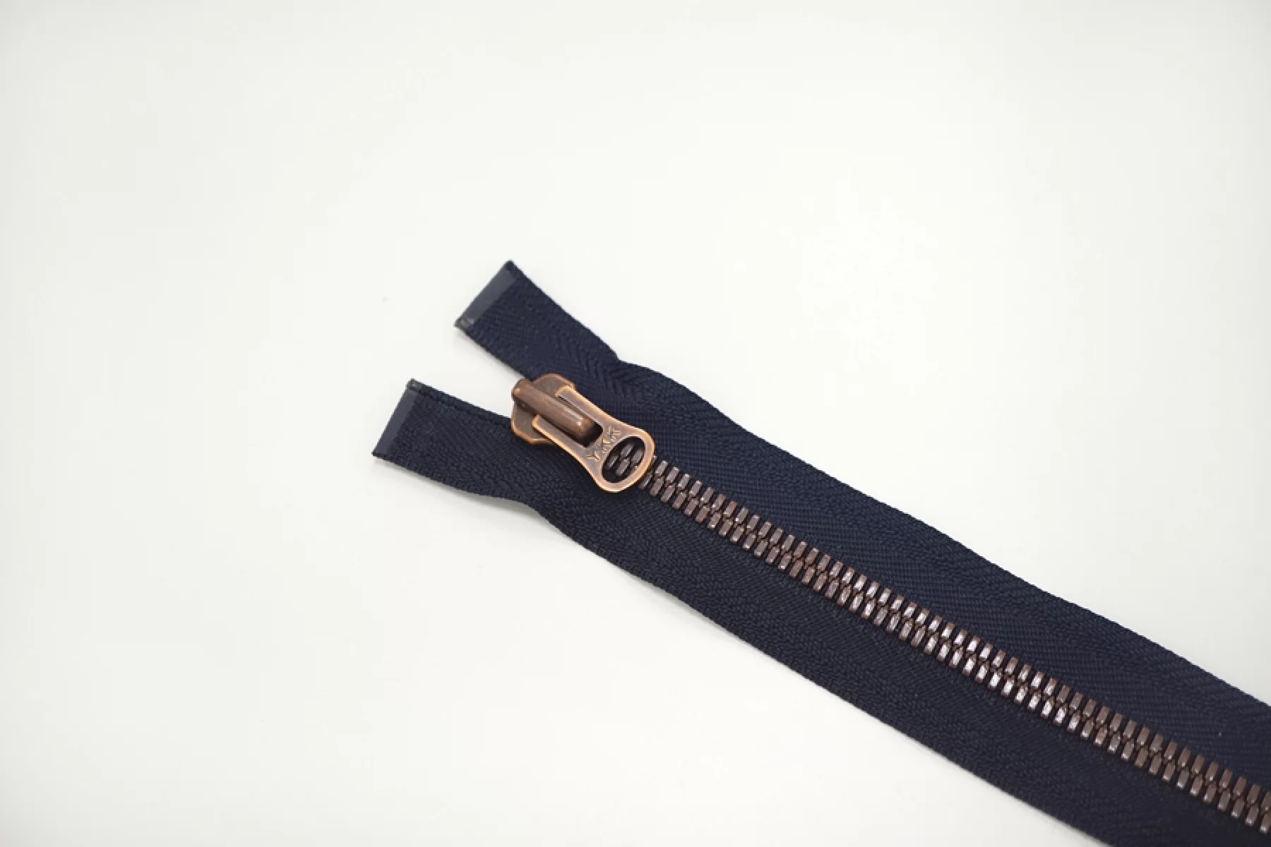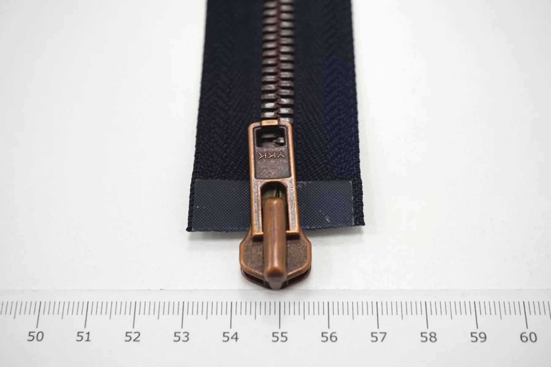 Молния металлическая от YKK двухзамковая, разъёмная, темно-синяя, цвет зубцов бронзовый. Длина 64 см.