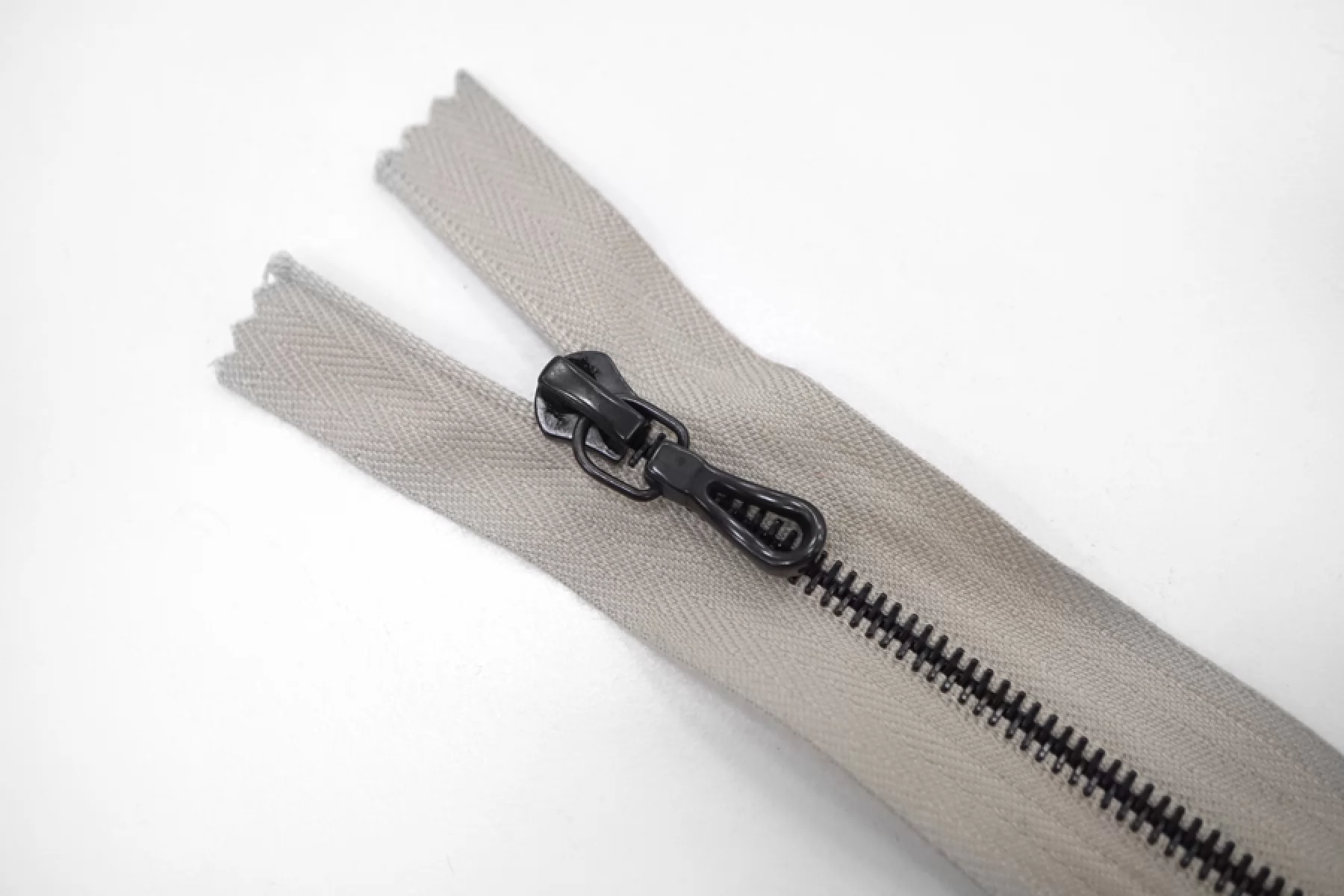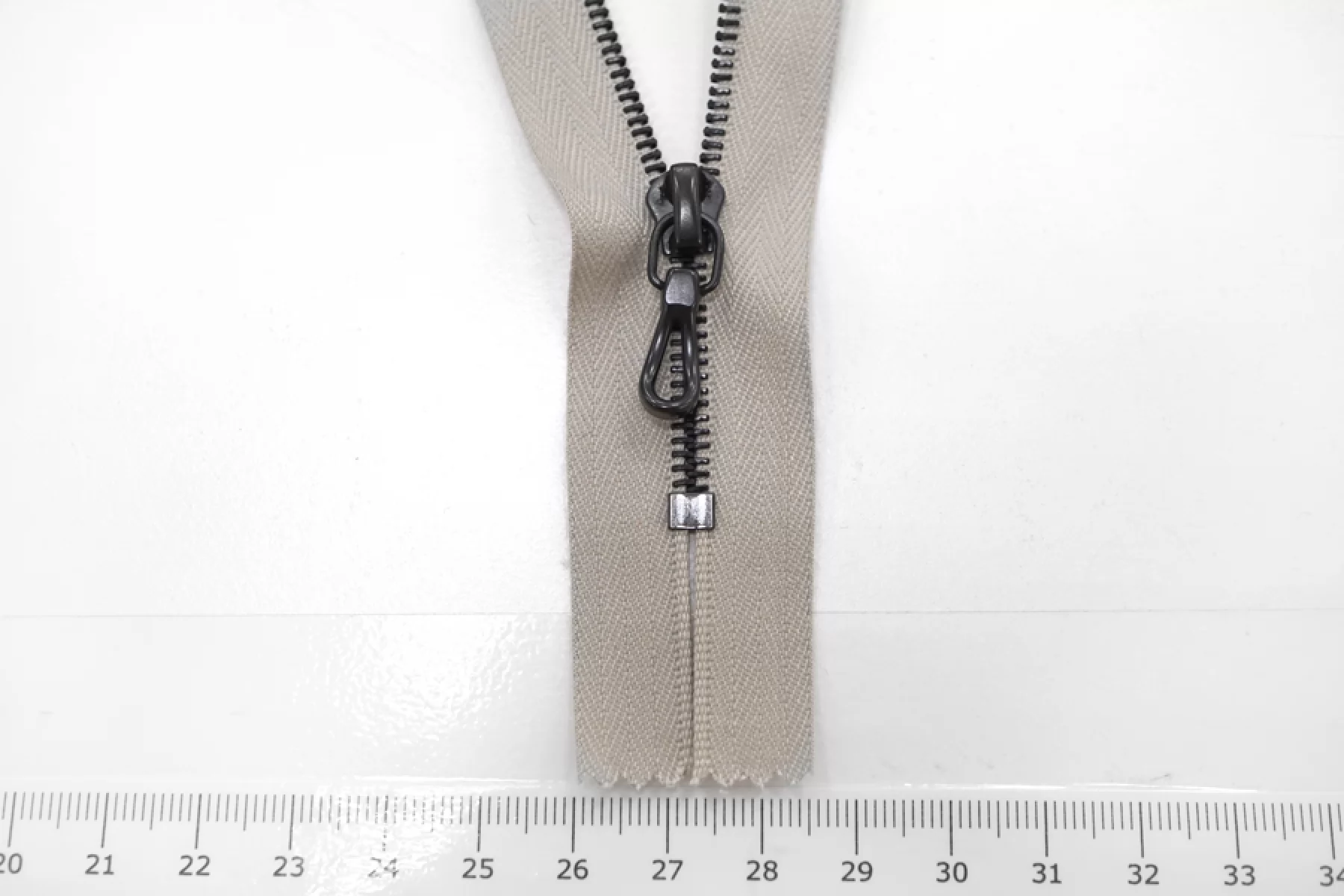 Молния металлическая от "RiRi" неразъемная, серо-бежевого цвета, цвет слайдера , пуллера и цвет зубцов тёмный никель . Длина 16 см.