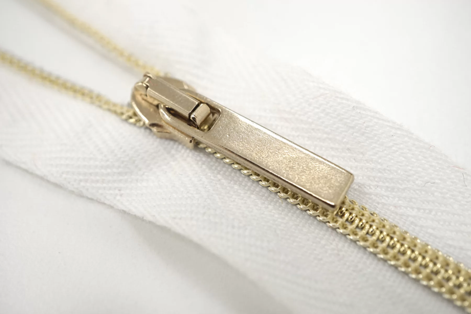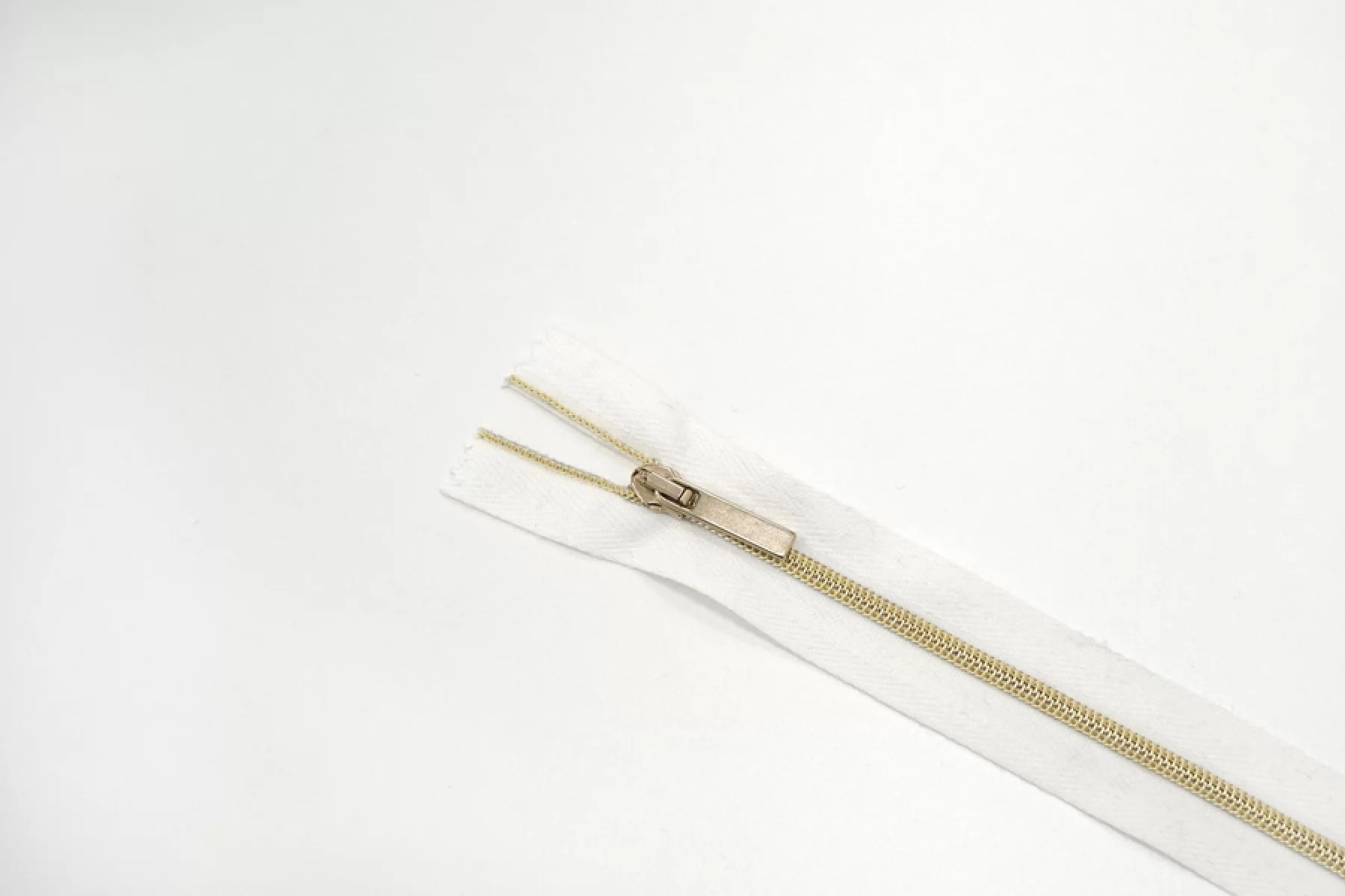 Молния от "Lampo" неразъемная, белая, цвет зубцов золотистый, пластиковая спиральная, пуллер металлический золотистый. Длина 18 см.