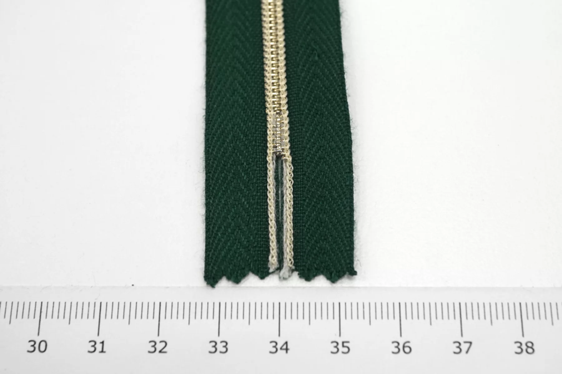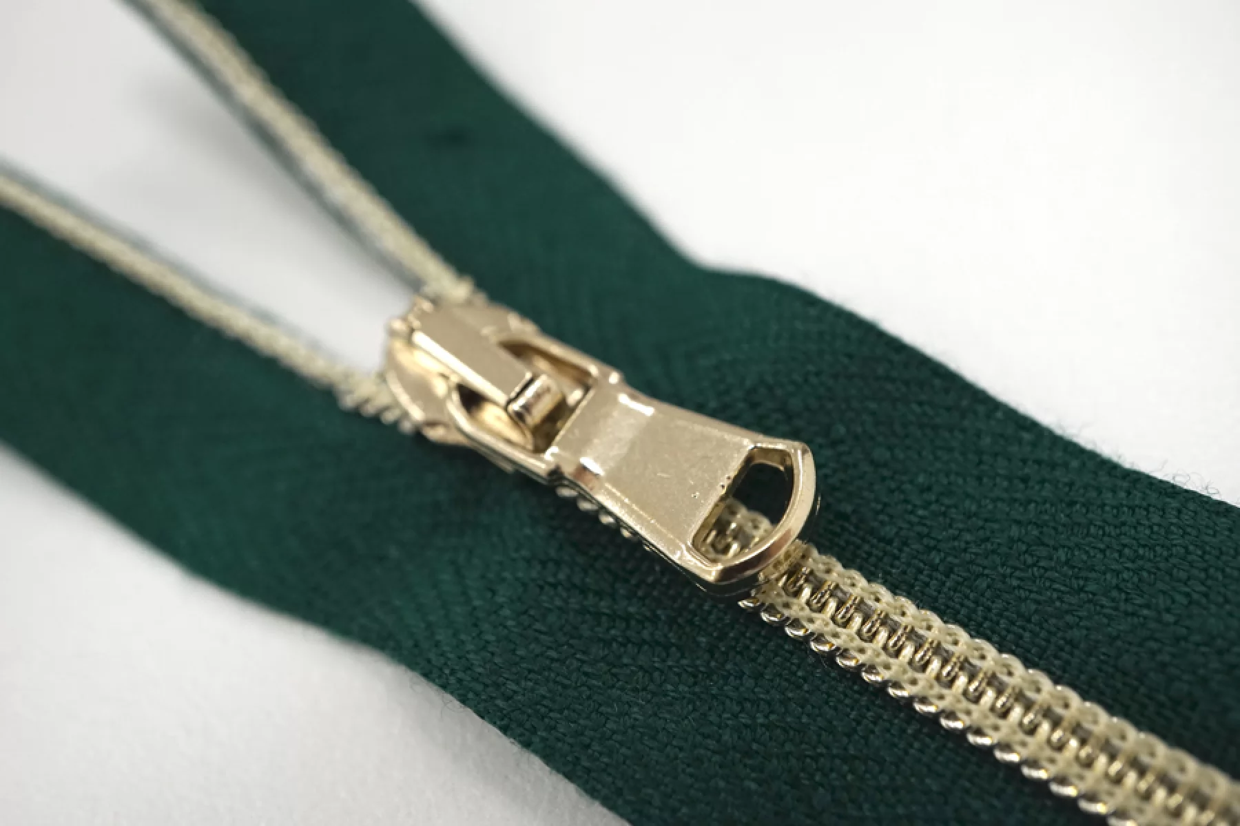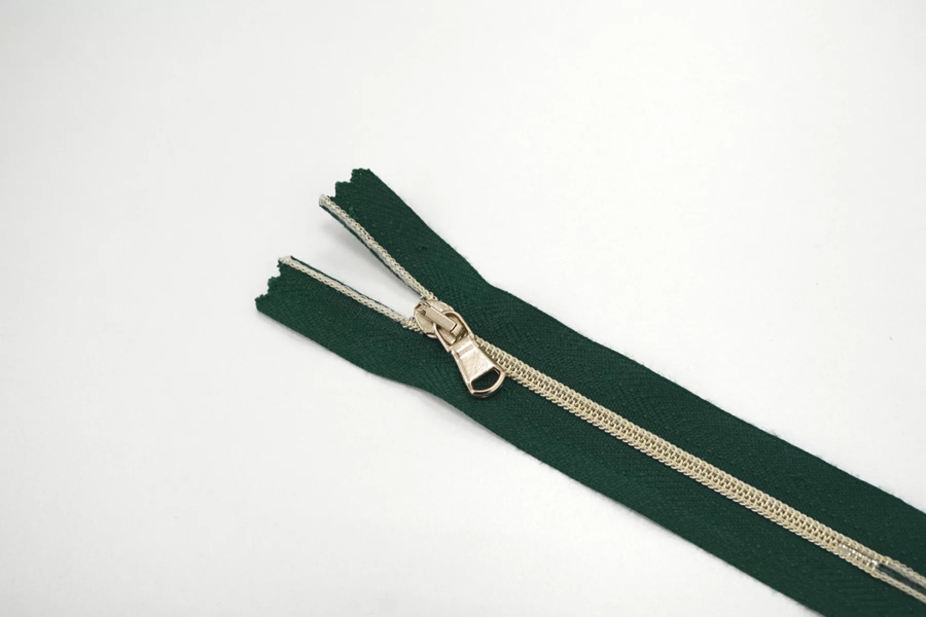 Молния от "Lampo" неразъемная, зеленая, цвет зубцов золотистый, пластиковая спиральная, пуллер металлический золотистый. Длина 10 см.