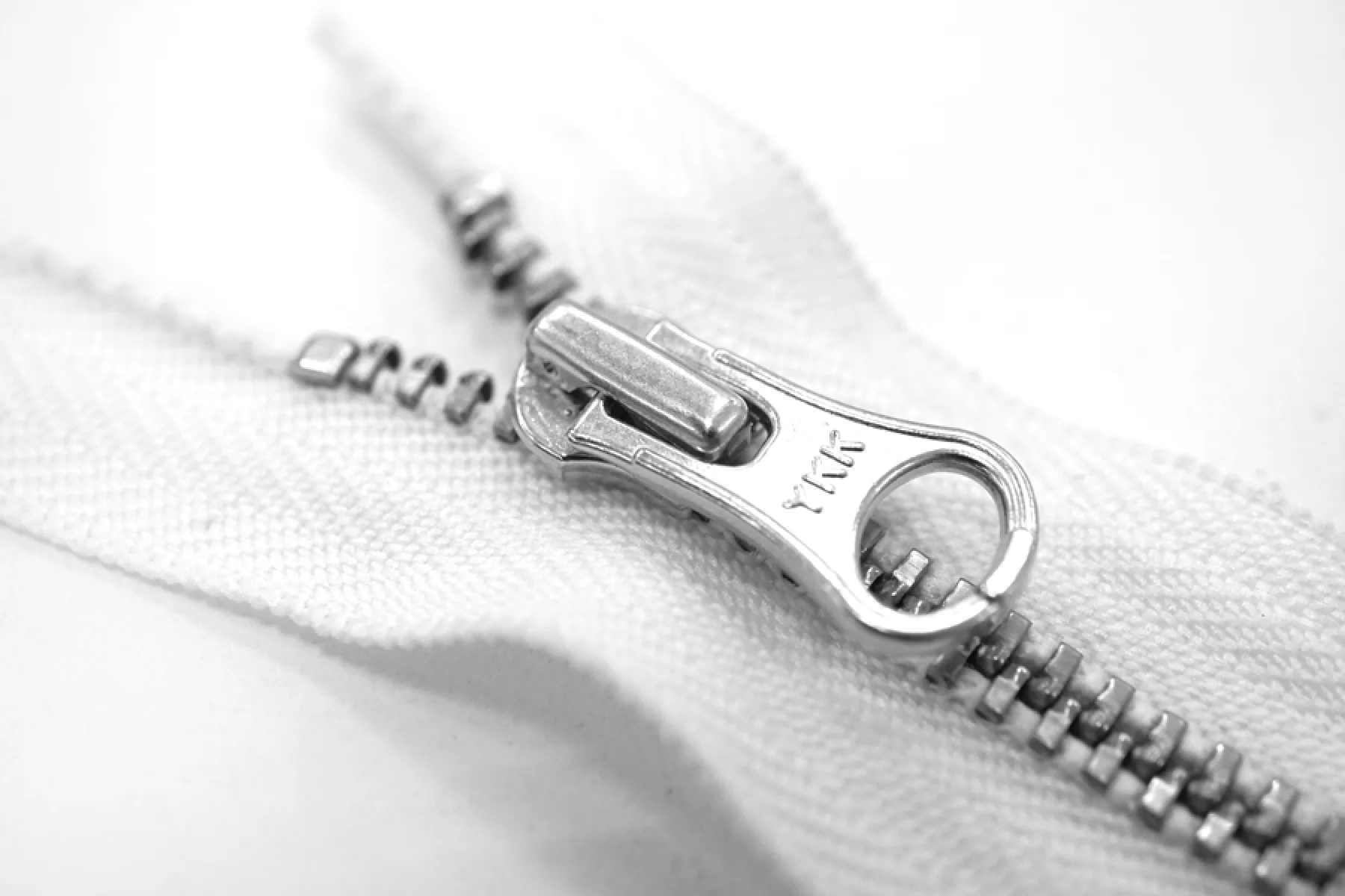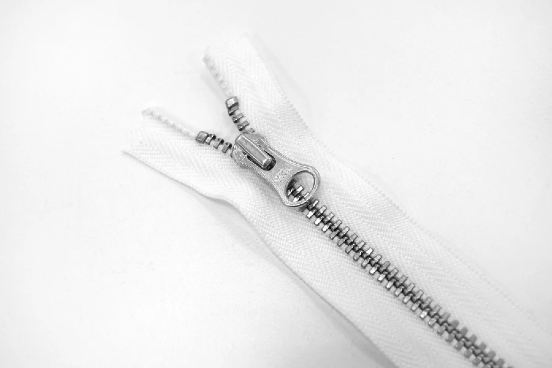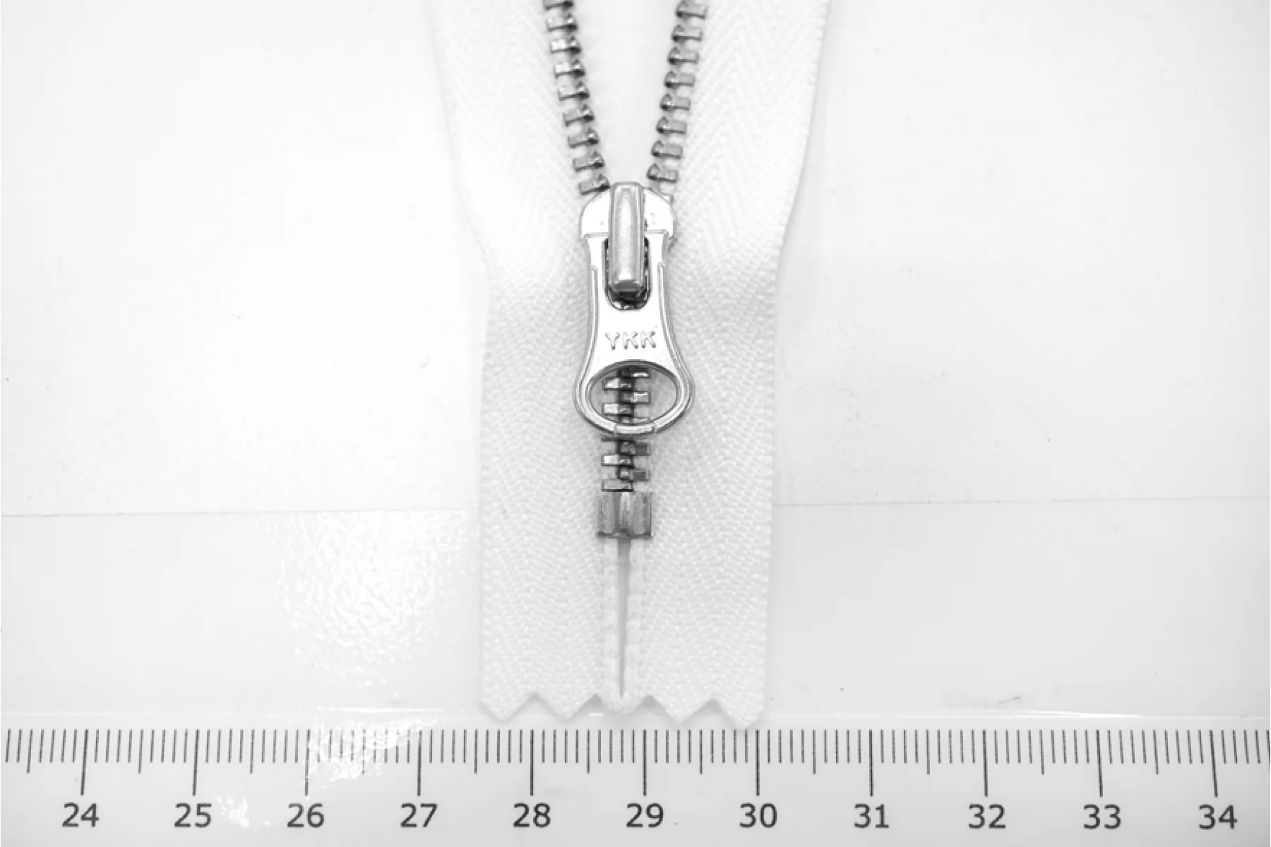 Молния от "YKK" неразъемная, белого цвета, цвет зубцов и пуллера серебристый. Длина 20 см.