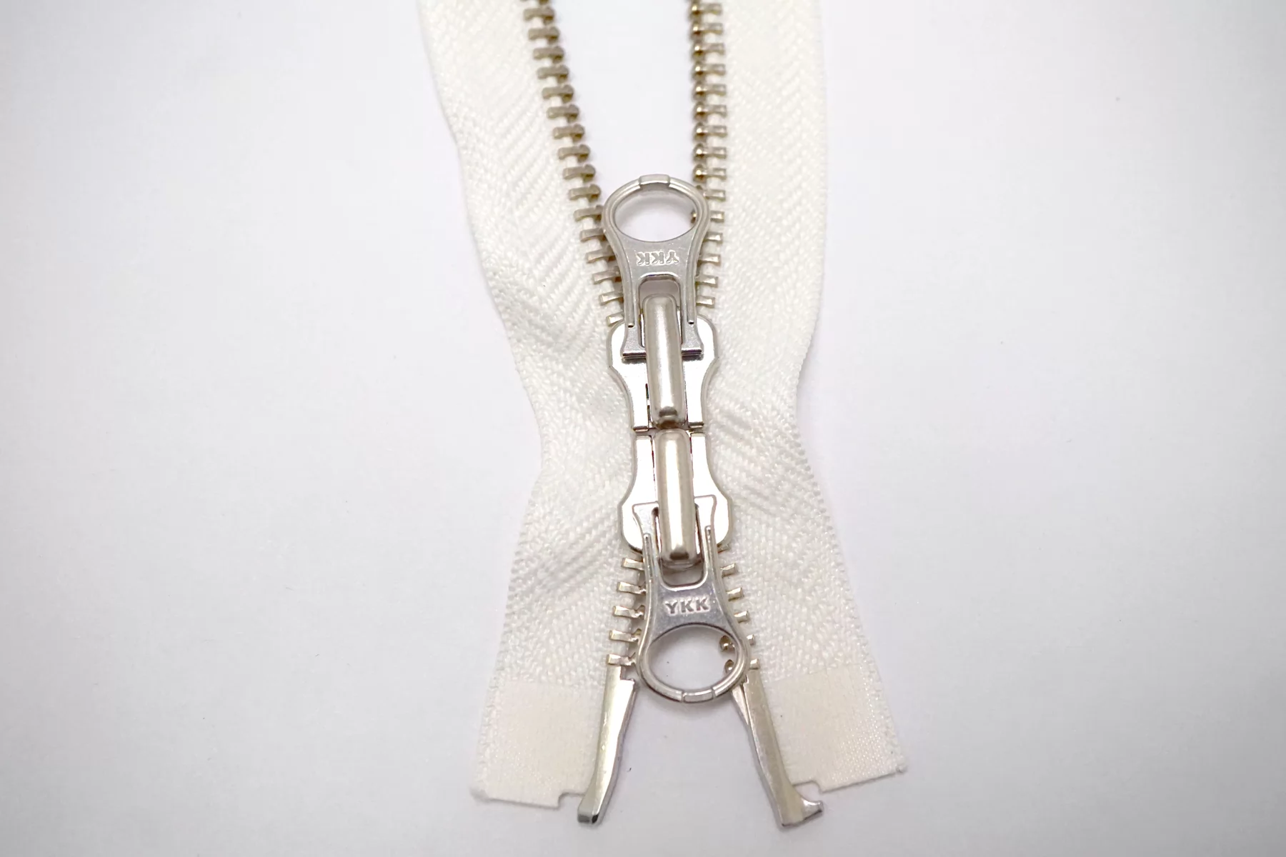 Молния металлическая YKK двухзамковая, разъёмная, белая, цвет зубцов серебристый никель, пуллеров-серебро. Длина 74 см.
