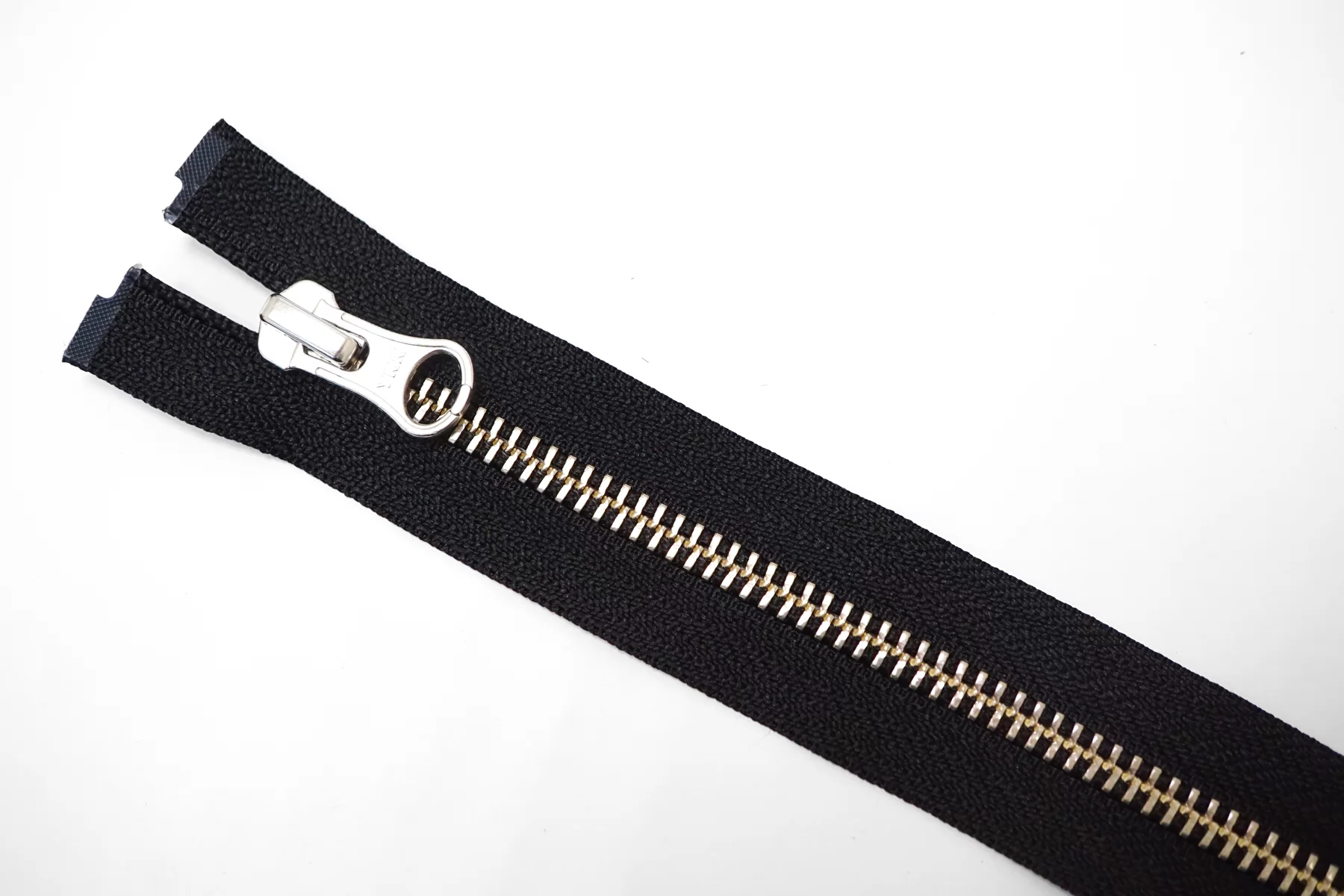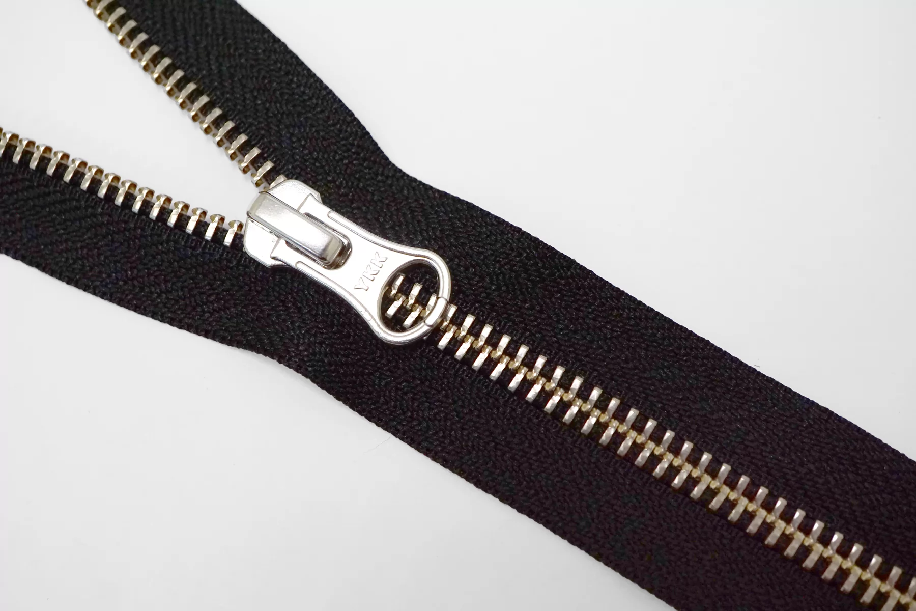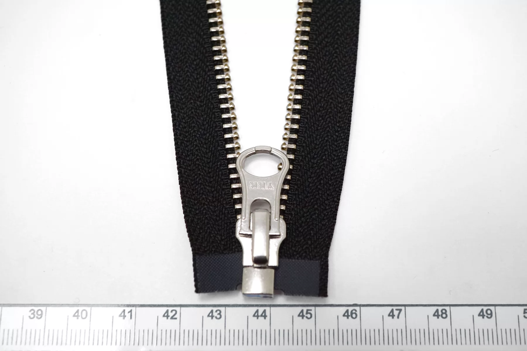 Молния металлическая YKK однозамковая, разъёмная, черная, цвет зубцов и пуллеров-серебро. Длина 77 см.