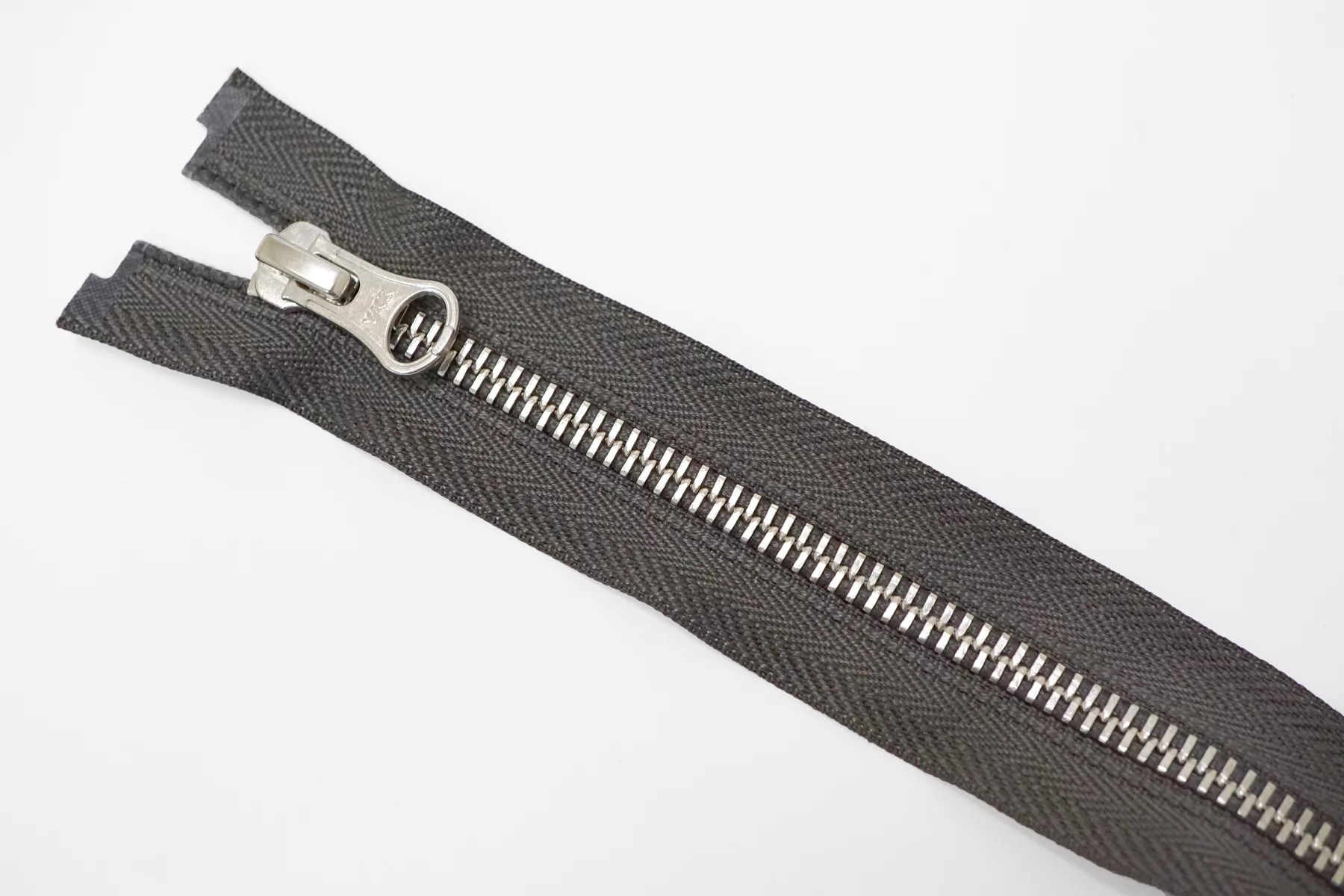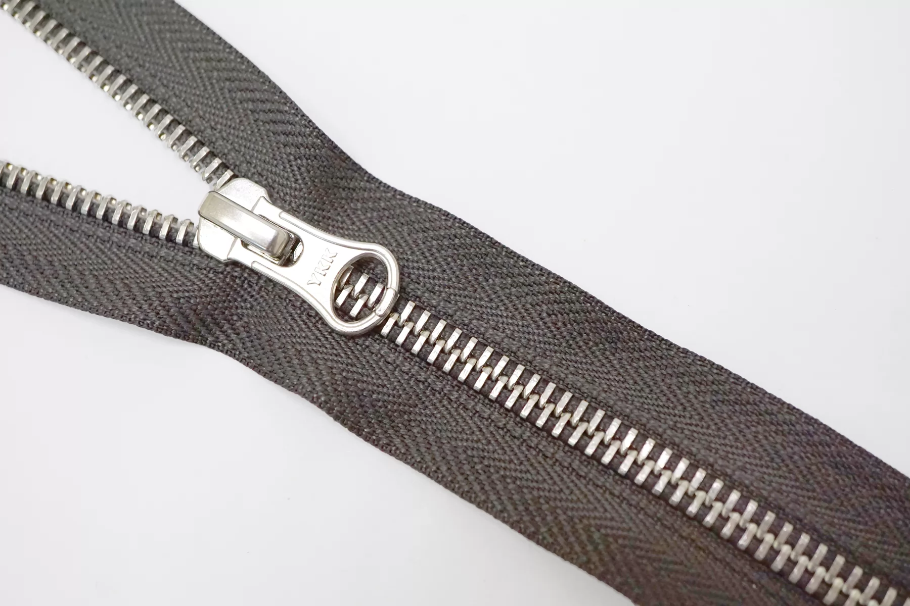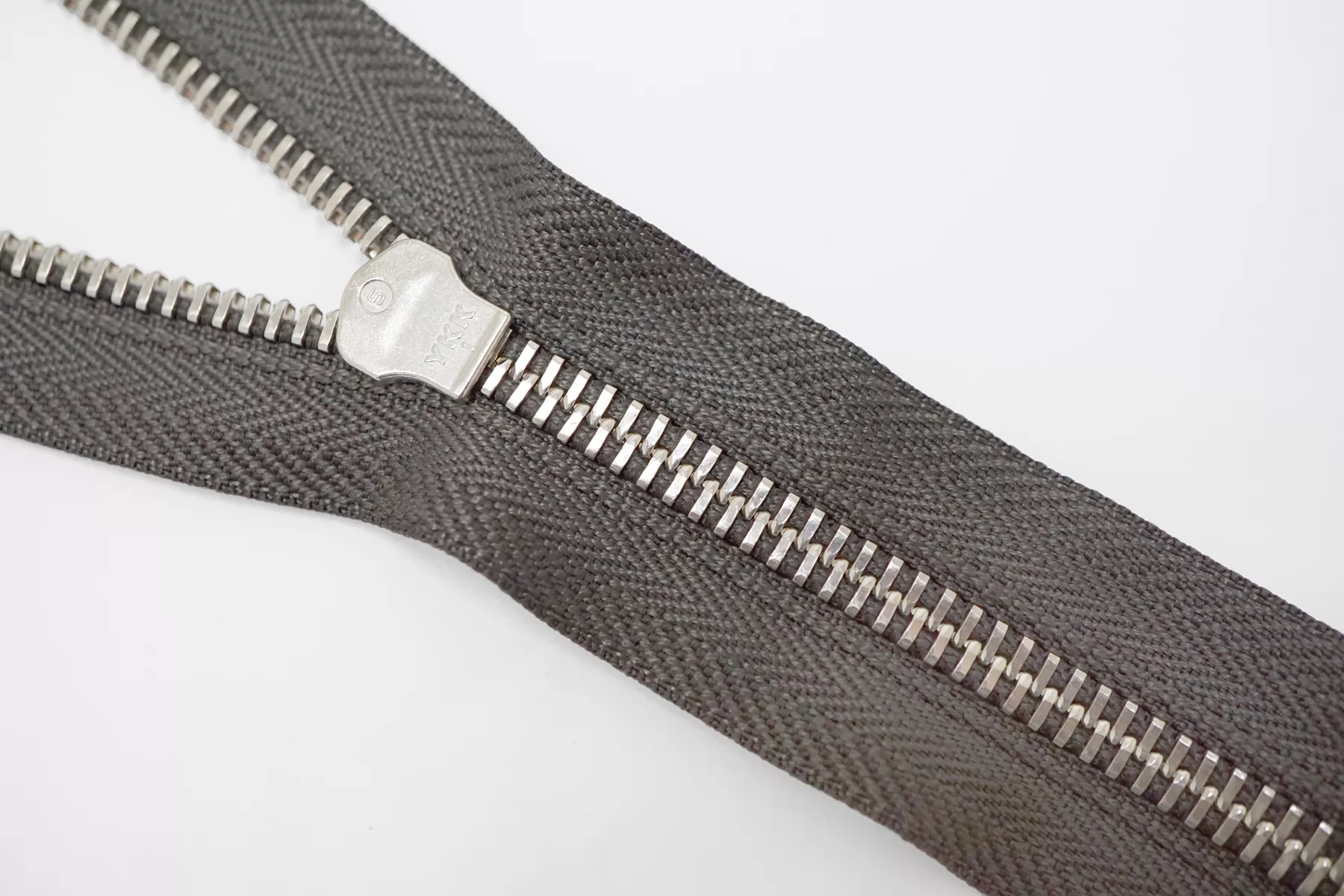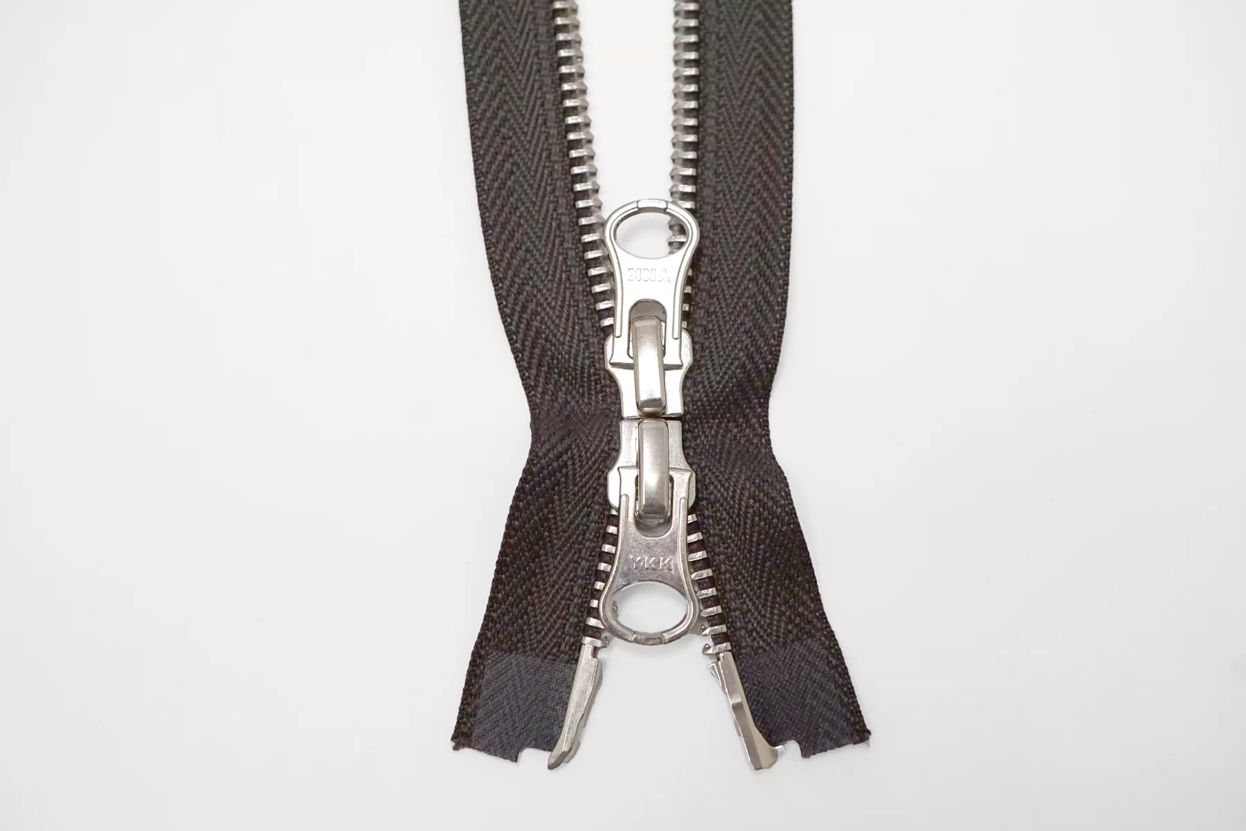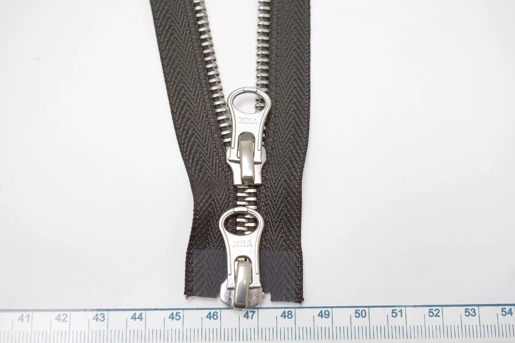 Молния металлическая YKK двухзамковая, разъёмная, серая, цвет зубцов и пуллеров-серебро. Длина 67 см.