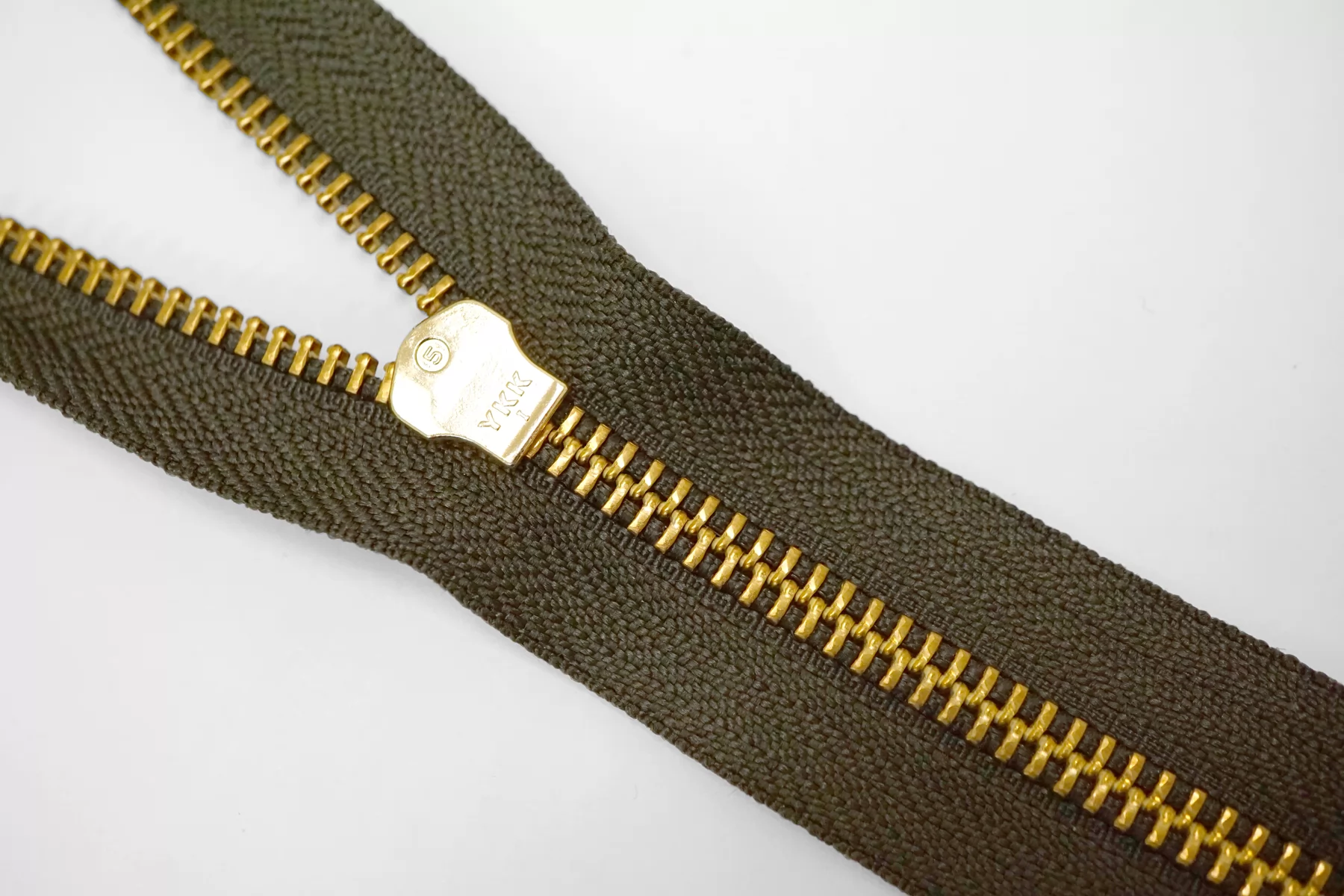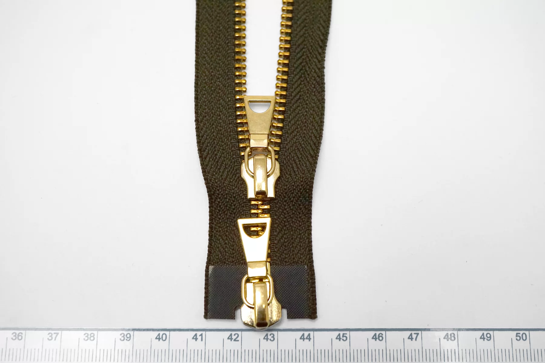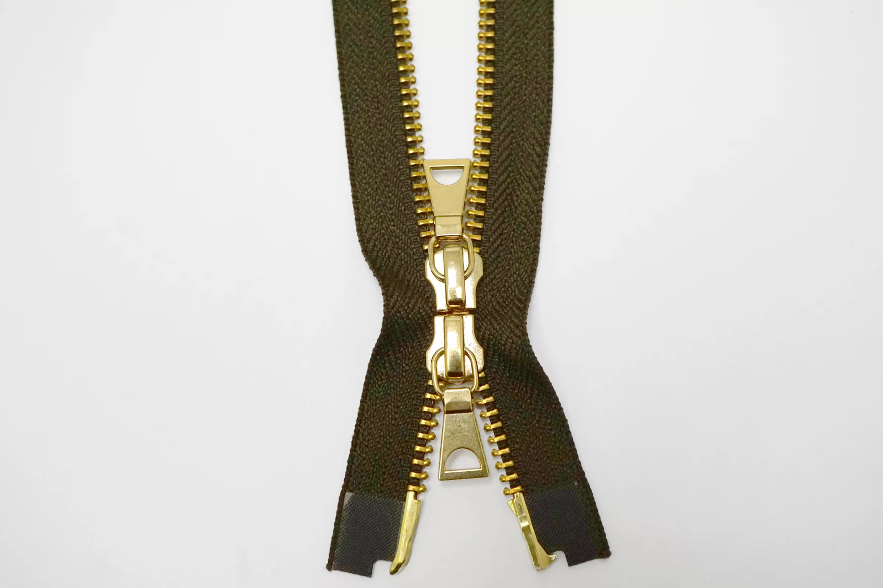 Молния металлическая YKK двухзамковая, разъёмная, оттенок зелёный хаки, цвет зубцов и пуллеров-золотистый. Длина 68 см.
