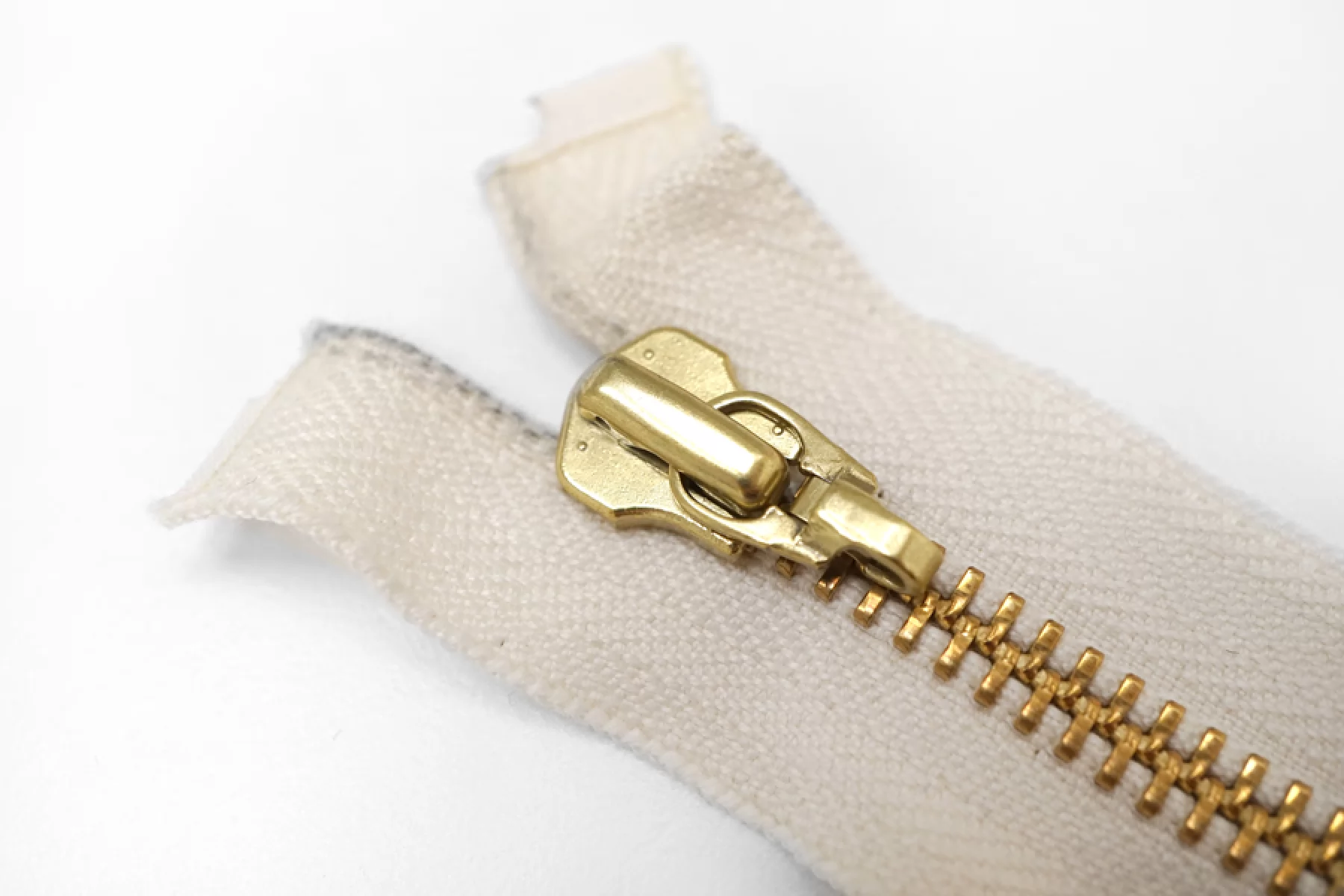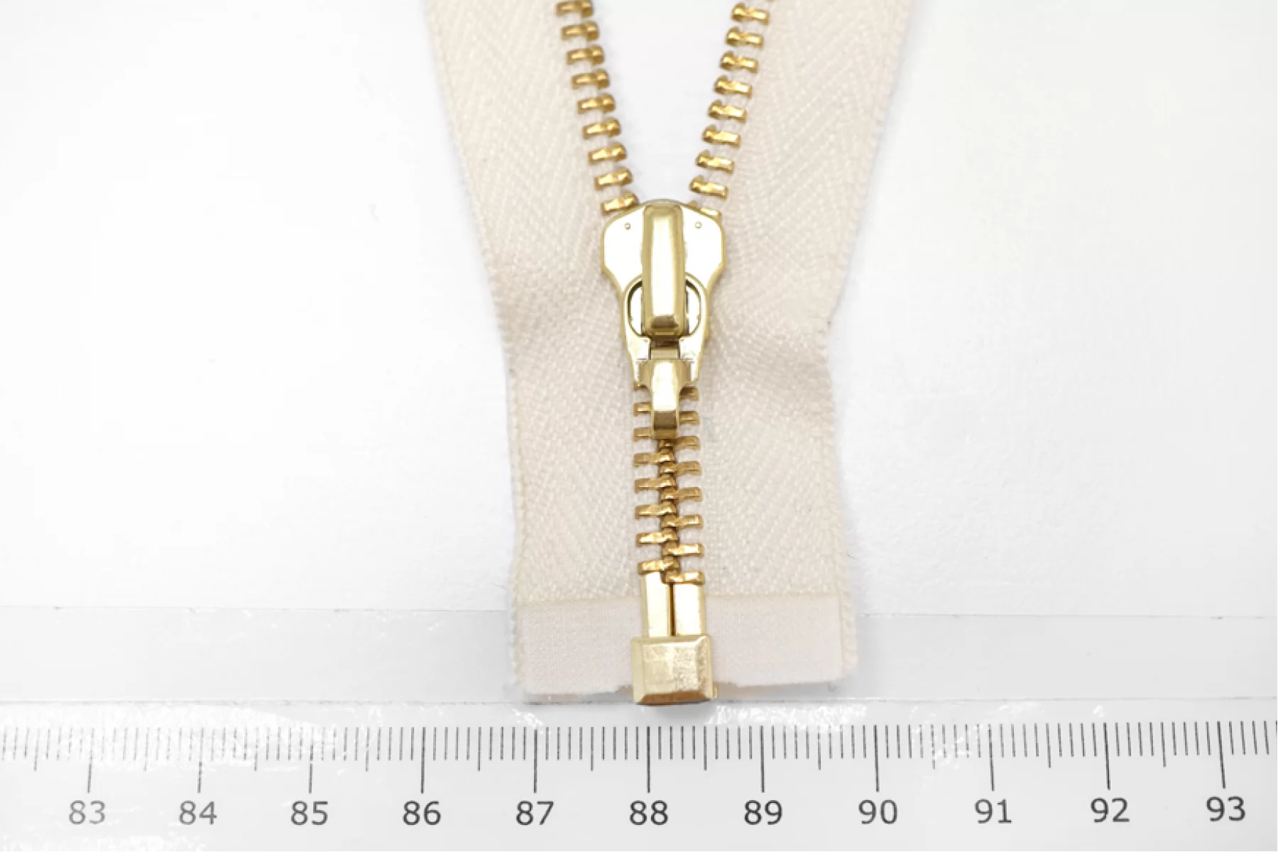 Молния металлическая от "YKK" разъемная, молочного цвета, цвет слайдера , пуллера и цвет зубцов золотистый, пуллер в виде карабина . Длина 58 см.