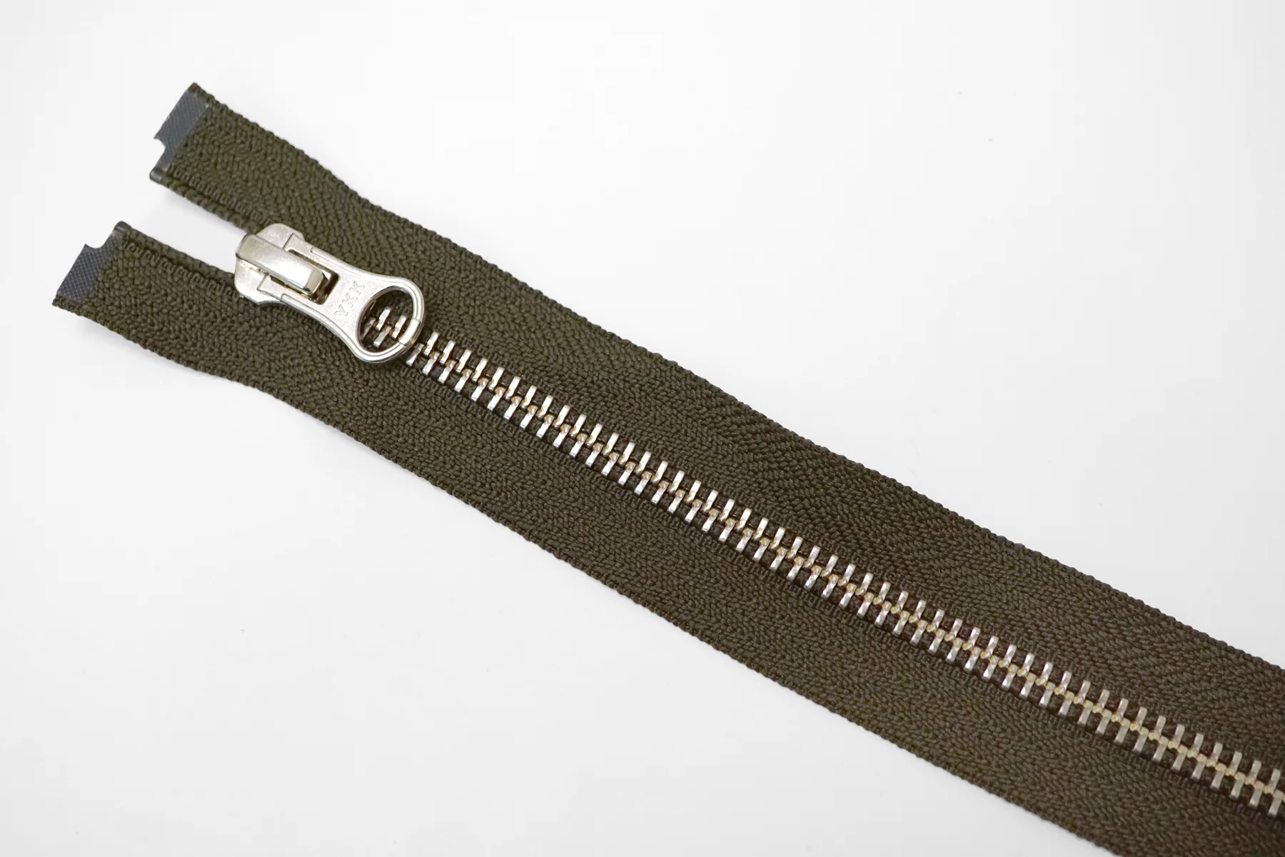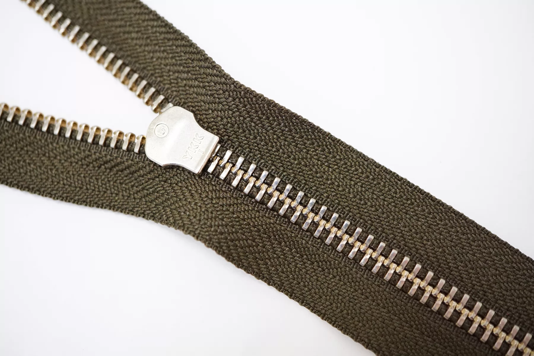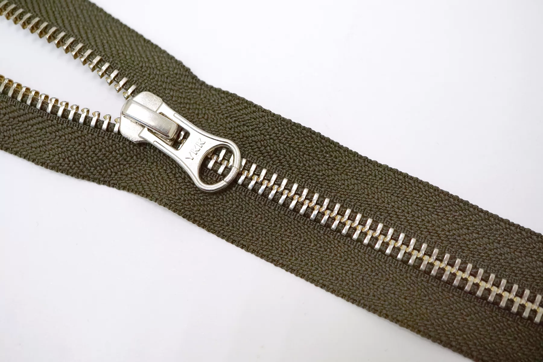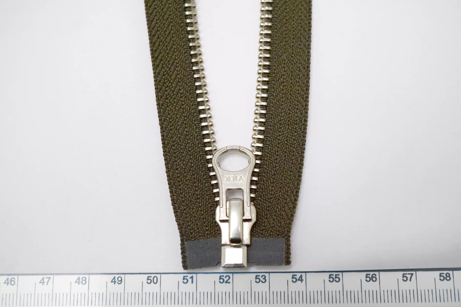 Молния YKK разъемная, цвет защитный зелёный, цвет зубцов и пуллера серебристый никель. Длина 63 см.