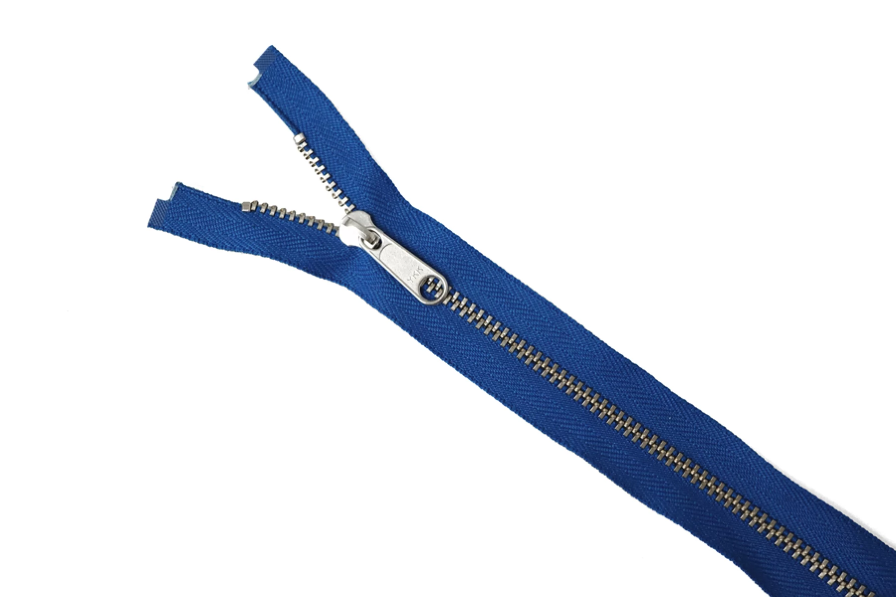 Металлическая молния "Ykk" разъёмная, один замок, насыщенного синего. Цвет зубцов металлический серебристый, слайдер и пулер металлические серебристые. Длина 67 см. Ширина молнии 2,6 см. Ширина зубцов 4 мм.
