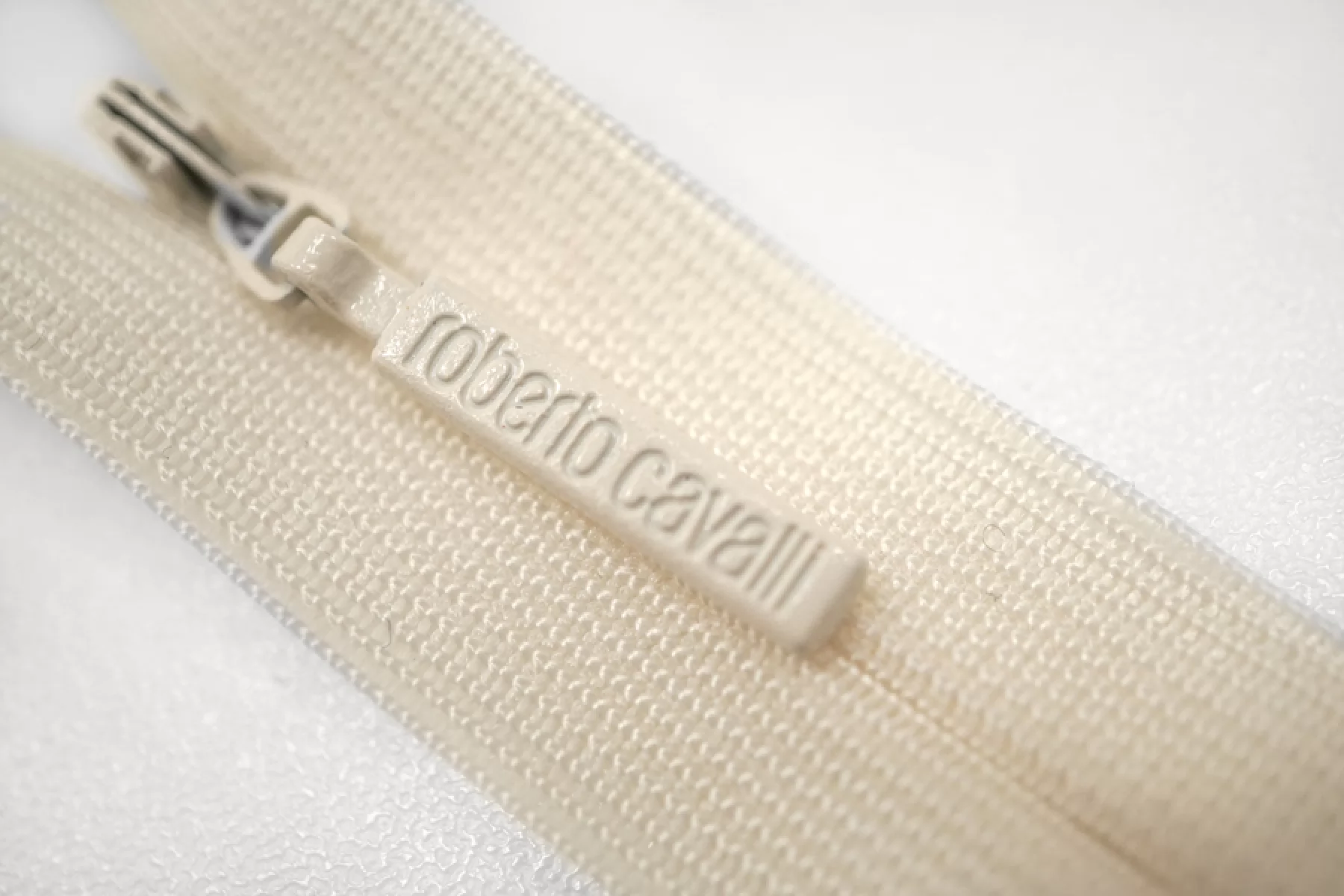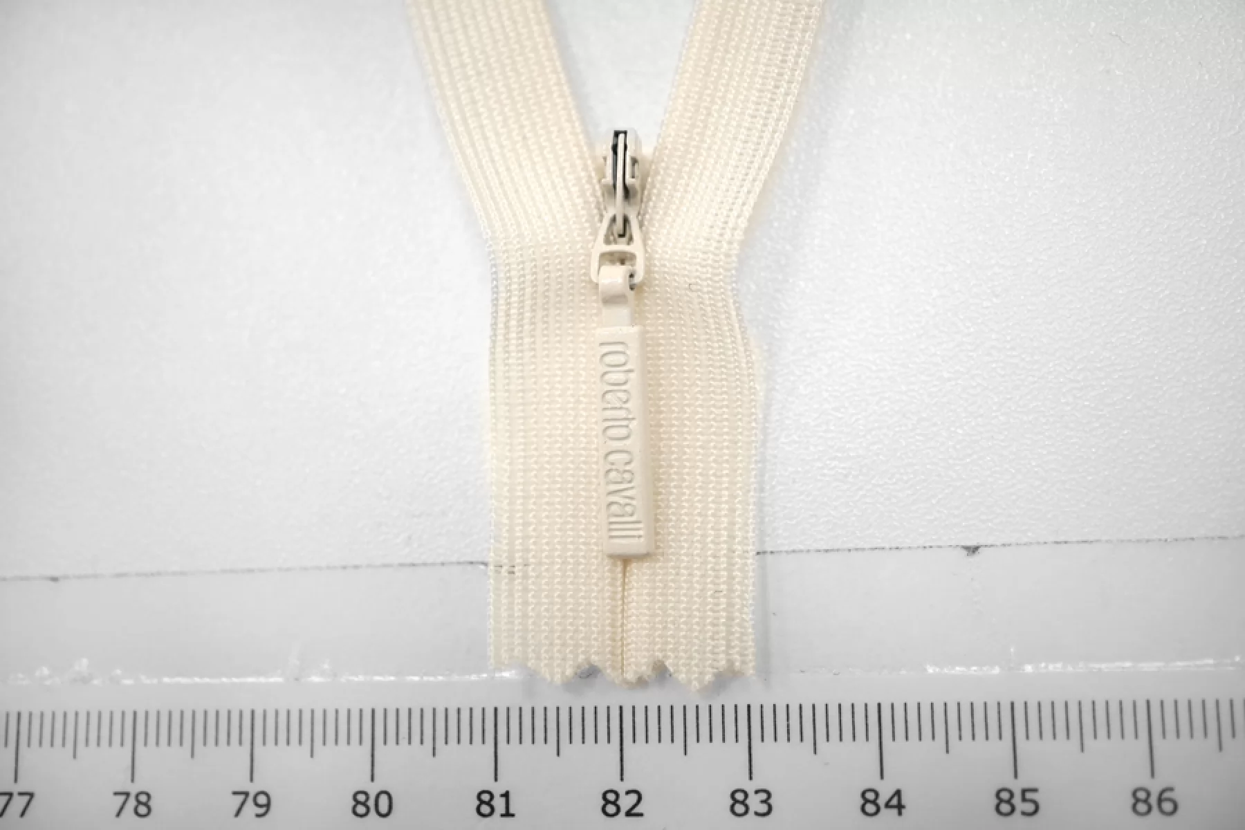 Потайная молния молочного цвета от YKK, на пулере подпись Cavalli, длина 18 см.