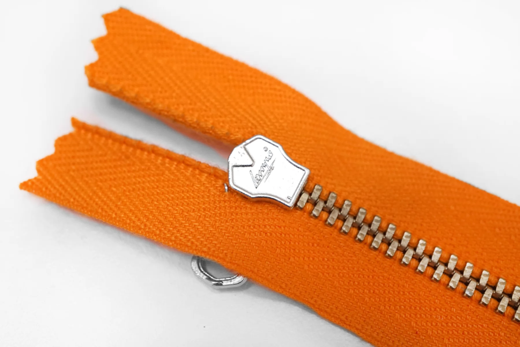 Молния от "Lampo" неразъемная, оранжевого цвета , цвет зубцов золотистый цвет пуллера серебристый . Длина 9 см.