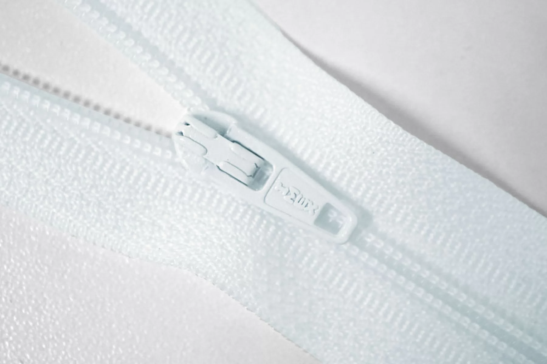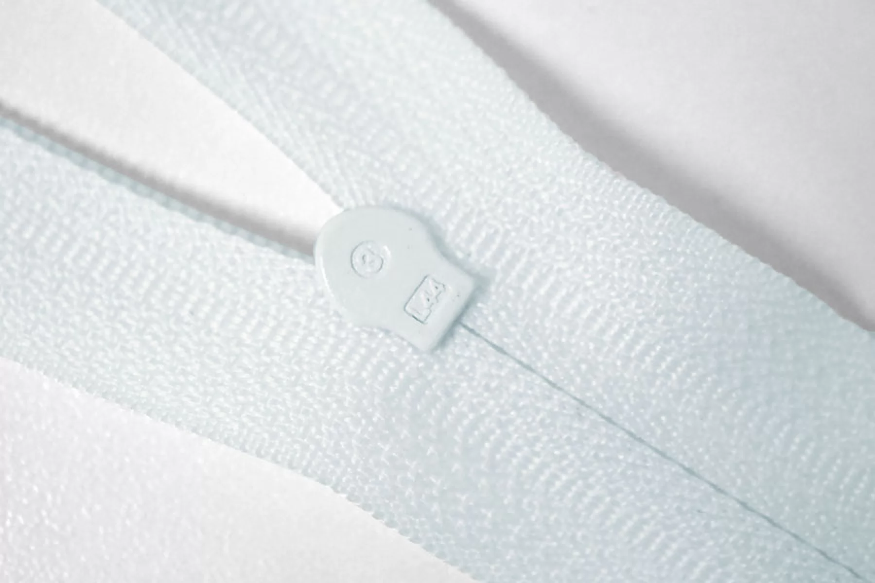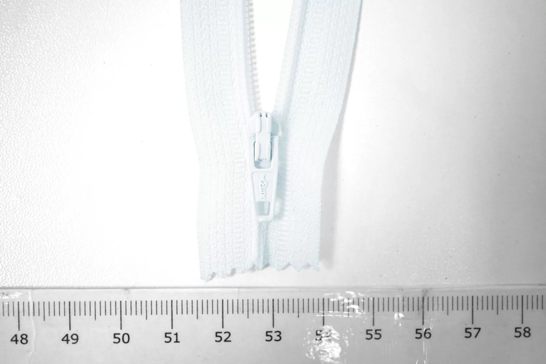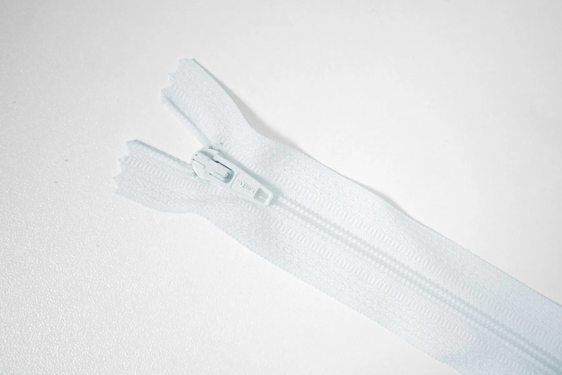Молния неразъемная, бледно-голубого цвета. Зубцы пластиковые, пуллер и слайдер -металлический. Длина 20 см. Ширина 2,5 м. Ширина зубцов 4 мм.