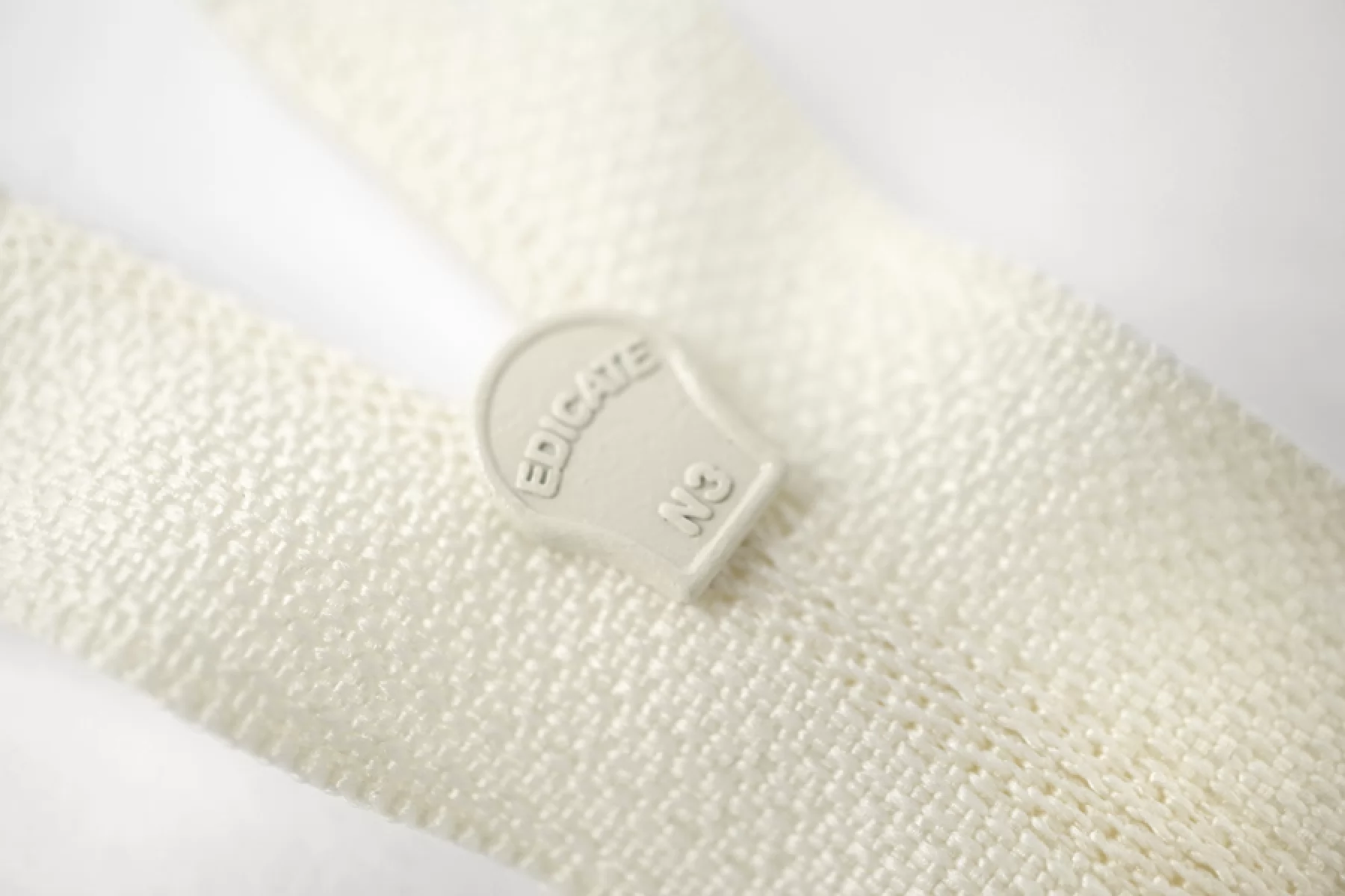 Молния от EDICATE неразъемная, в оттенке слоновая кость, цвет зубцов и пуллера - слоновая кость. Зубцы пластиковые, пуллер -металлический. Длина 12,5 см. Ширина 2,5 м. Ширина зубцов 4 мм.