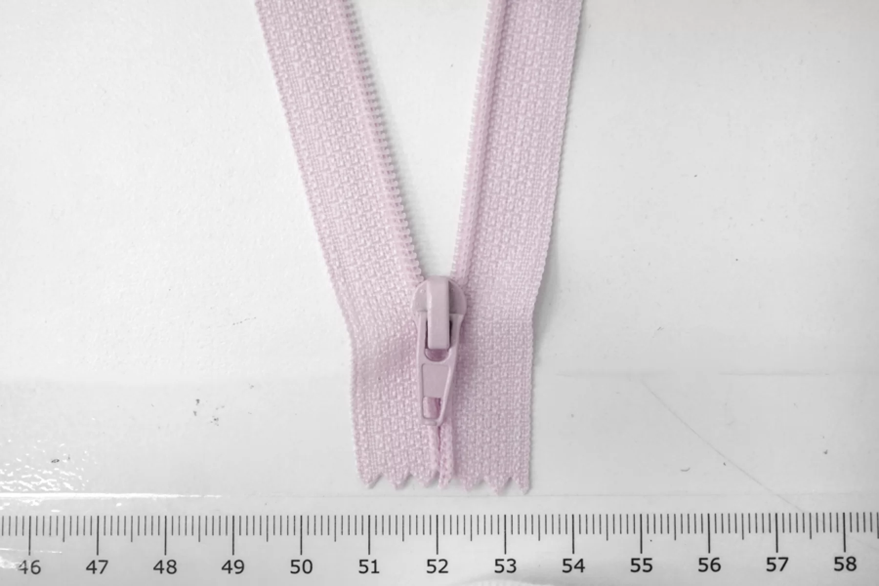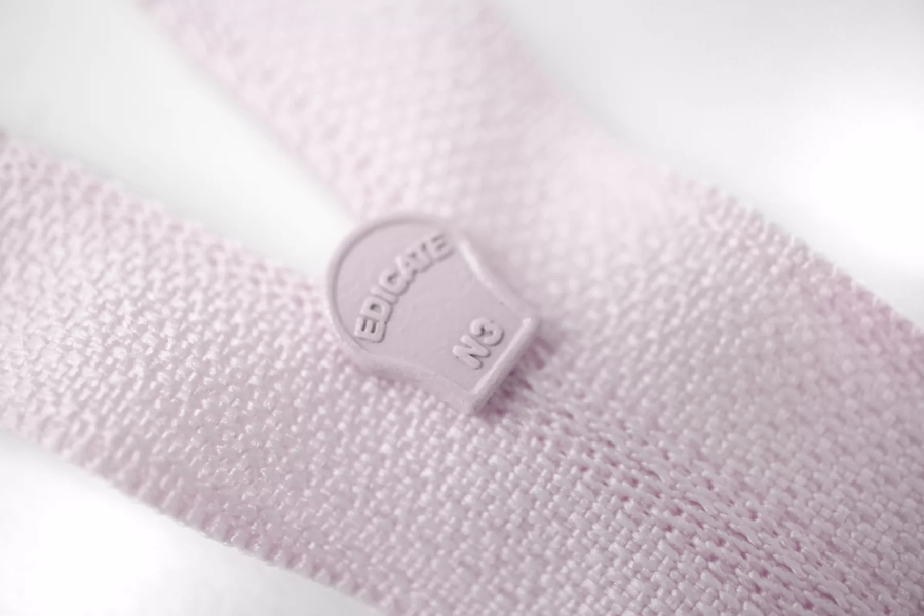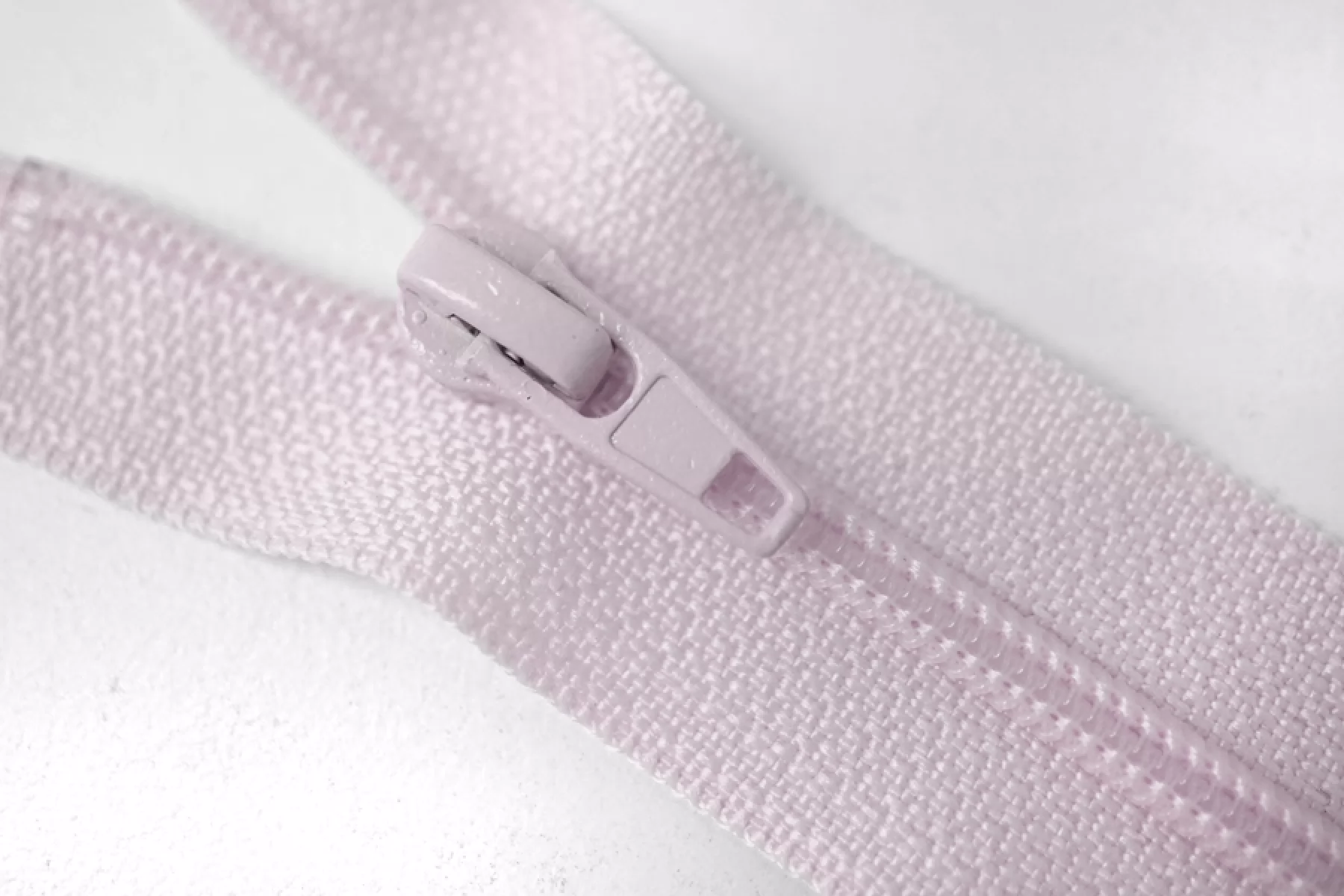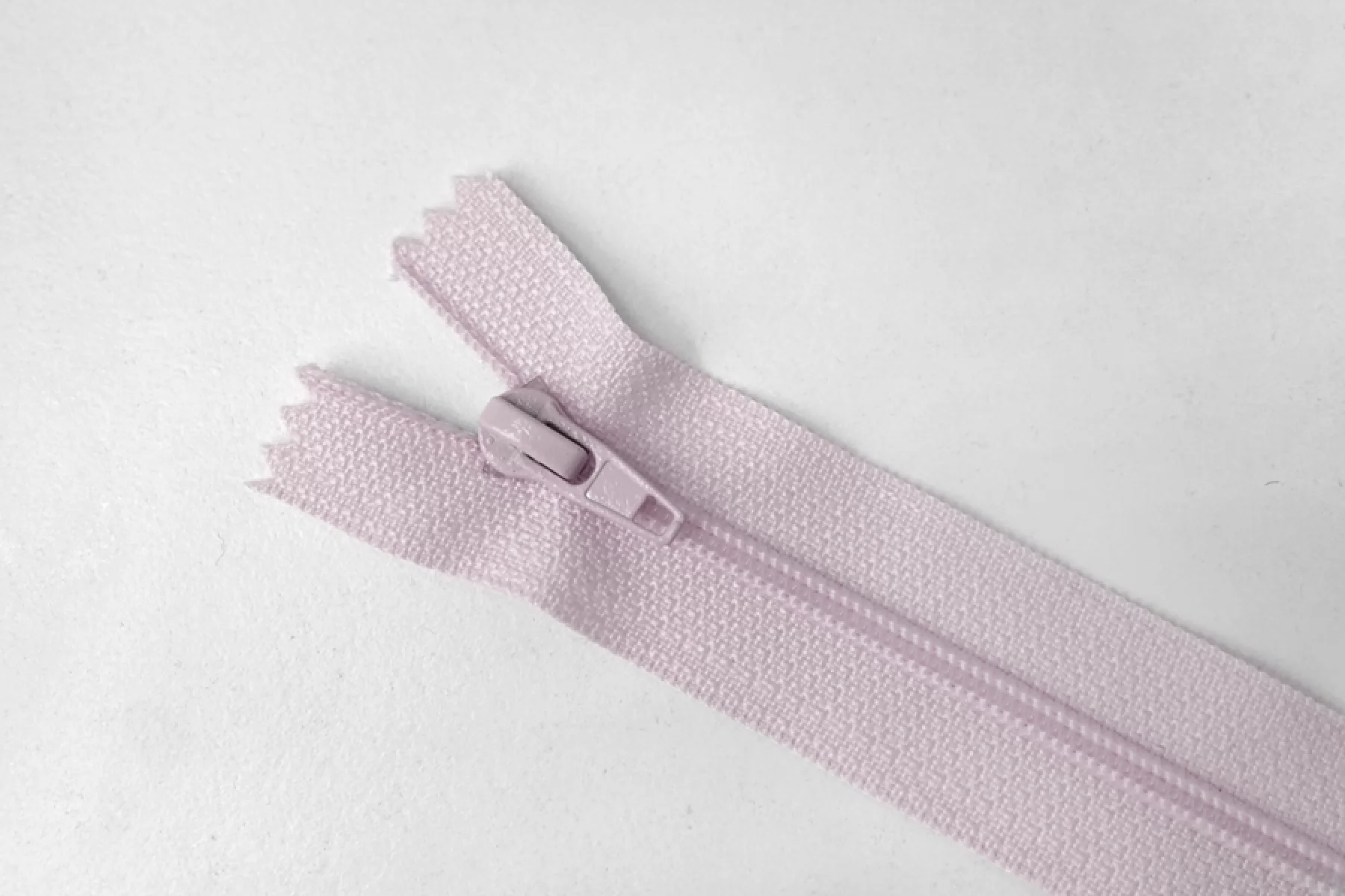 Молния от EDICATE неразъемная, пудрово-сиреневая оттенка, цвет зубцов и пуллера пудрово-сиреневый. Длина 14 см. Ширина 2,5 м. Ширина зубцов 4 мм.