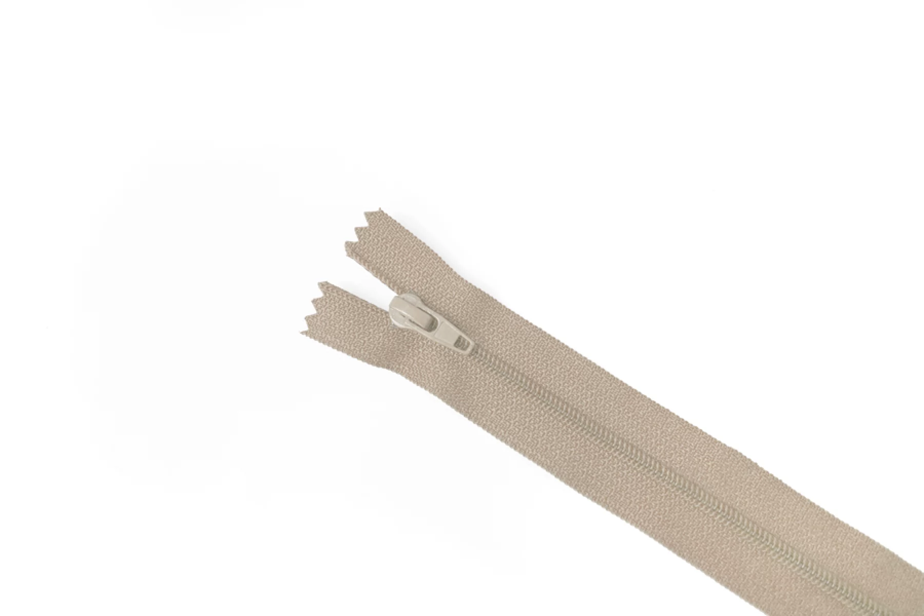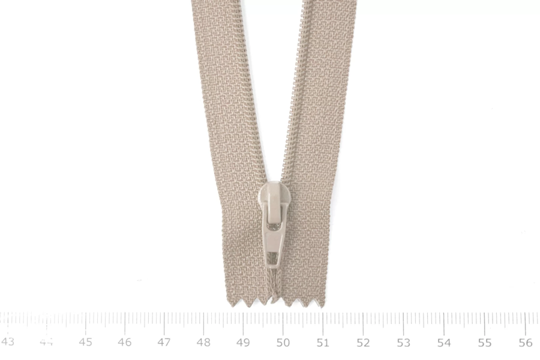 Молния от EDICATE неразъемная, серо-бежевого оттенка, цвет зубцов и пуллера - серо-бежевый. Зубцы пластиковые, пуллер -металлический. Длина 18,5 см. Ширина 2,5 м. Ширина зубцов 4 мм.