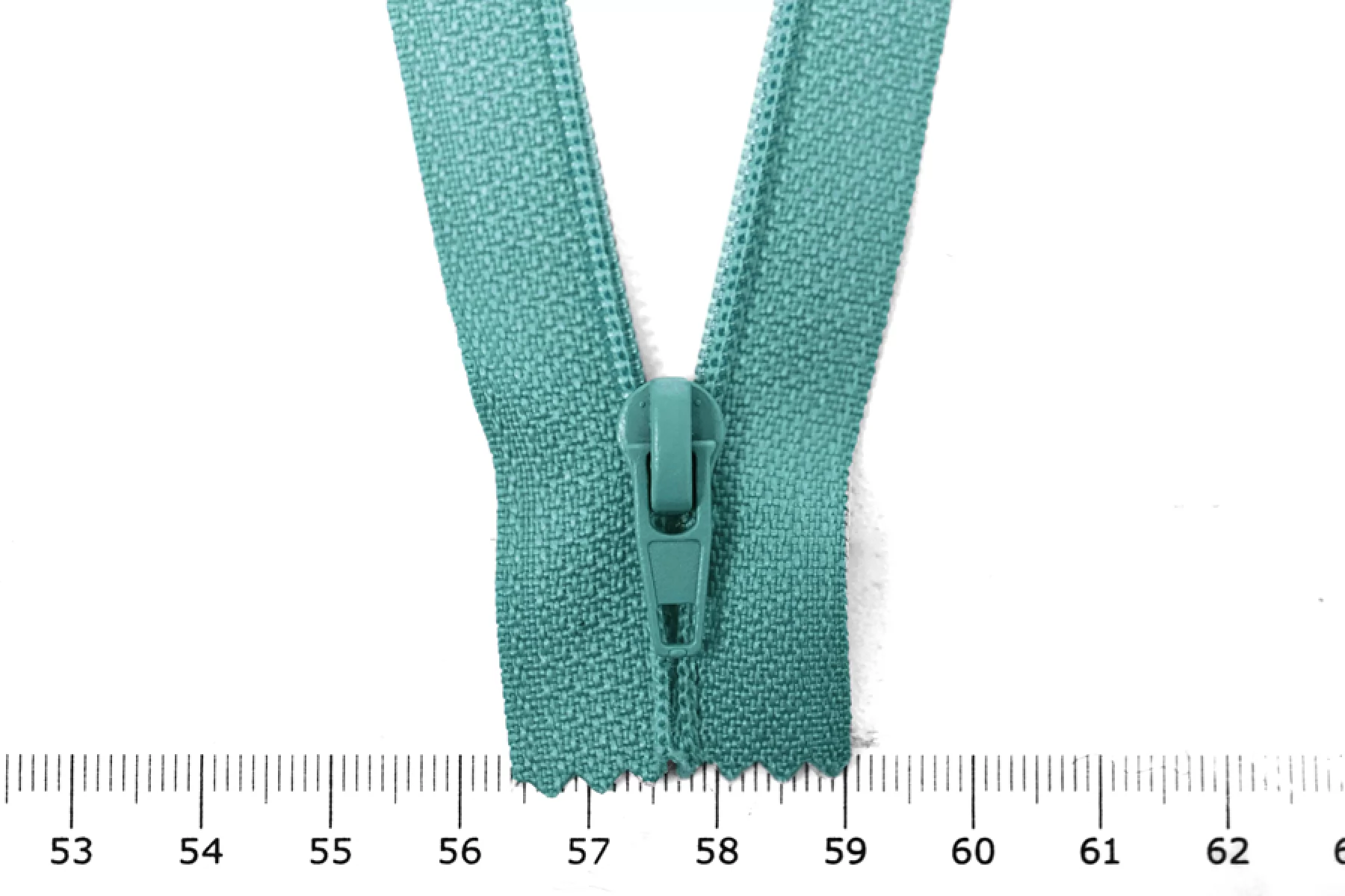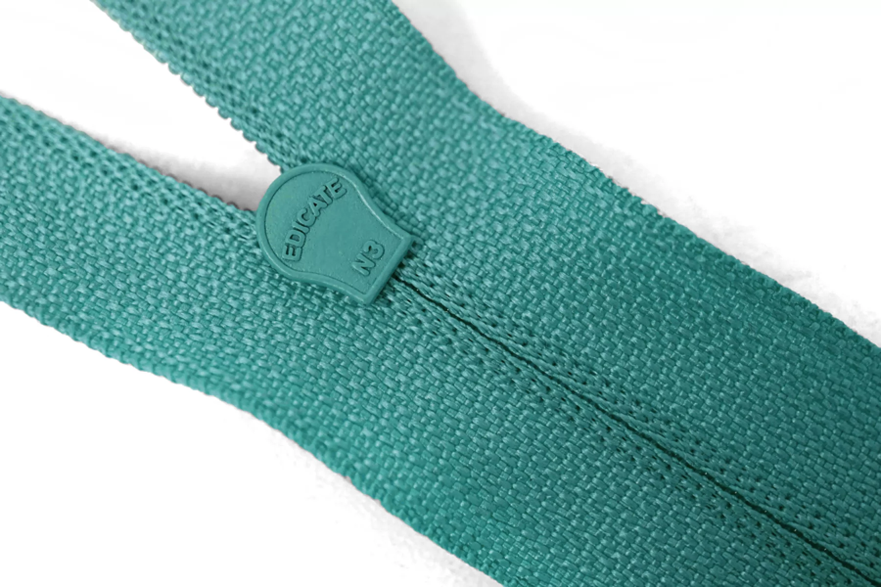 Молния от EDICATE неразъемная, сине-зеленого оттенка, Зубцы пластиковые, пуллер и слайдер -металлический. Длина 16 см. Ширина 2,5 м. Ширина зубцов 4 мм.