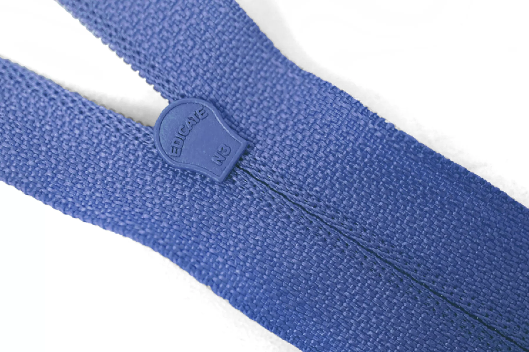 Молния от EDICATE неразъемная, синего цвета. Зубцы пластиковые, пуллер и слайдер -металлический. Длина 18 см. Ширина 2,5 м. Ширина зубцов 4 мм.
