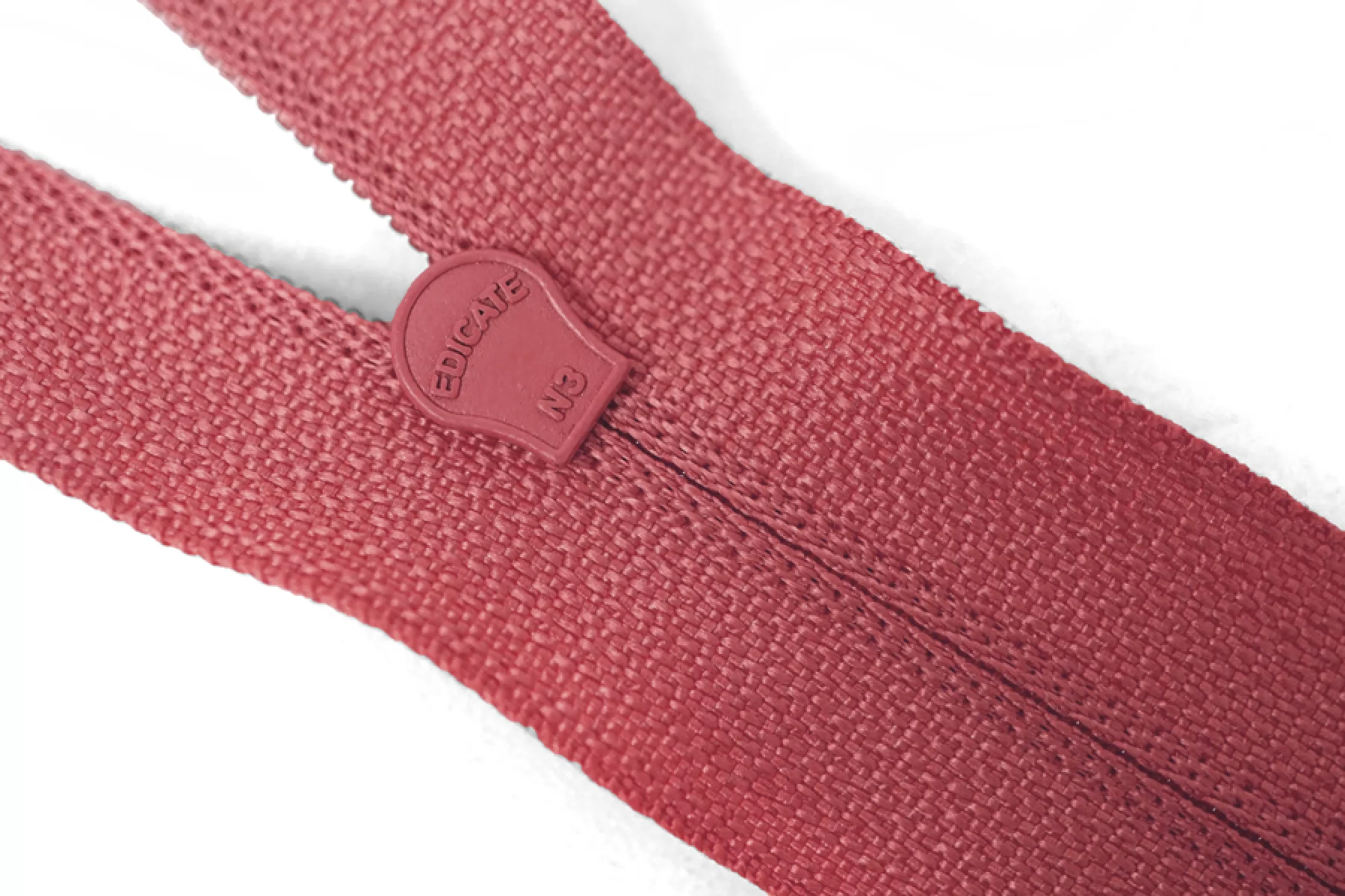 Молния от EDICATE неразъемная, ягодного оттенка. Зубцы пластиковые, пуллер и слайдер -металлический. Длина 16 см. Ширина 2,5 м. Ширина зубцов 4 мм.