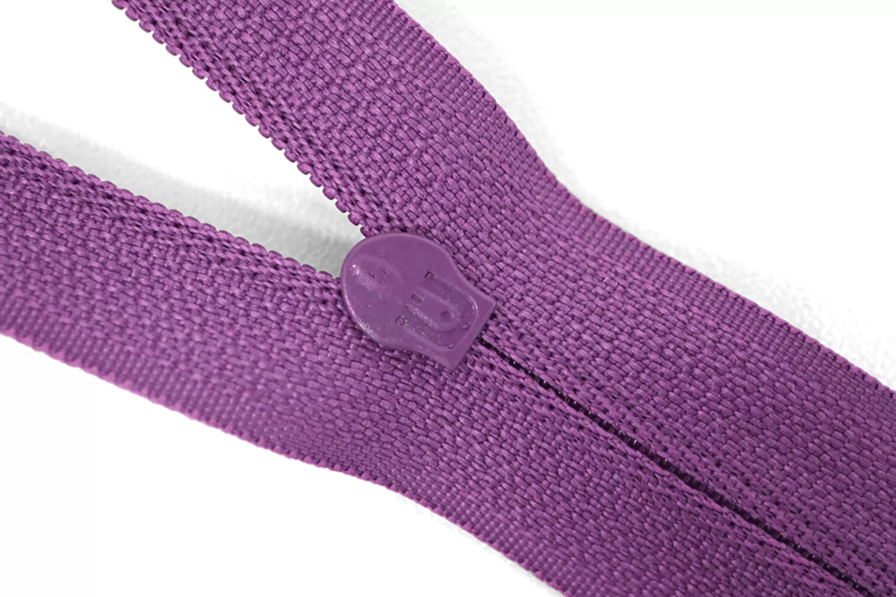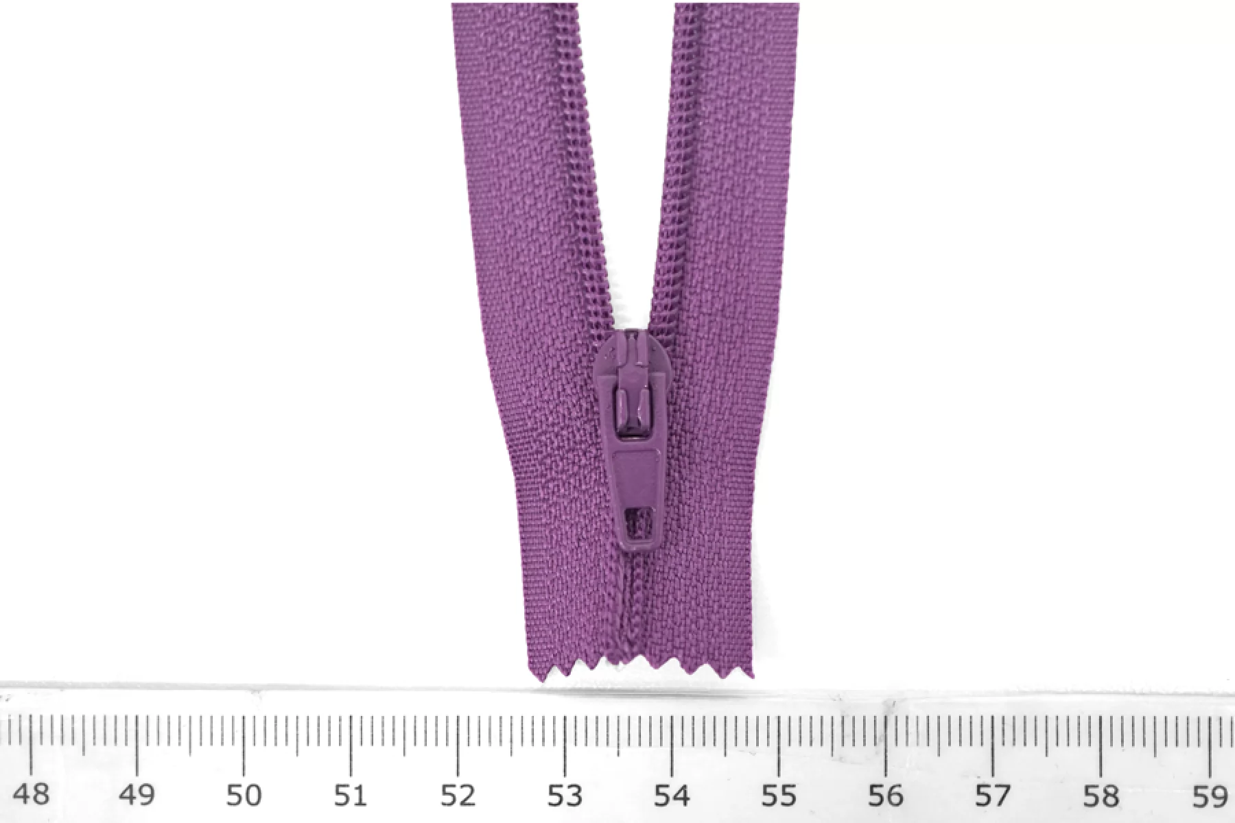 Молния неразъемная, фиолетового оттенка. Зубцы пластиковые, пуллер и слайдер -металлический. Длина 20 см. Ширина 2,5 м. Ширина зубцов 4 мм.