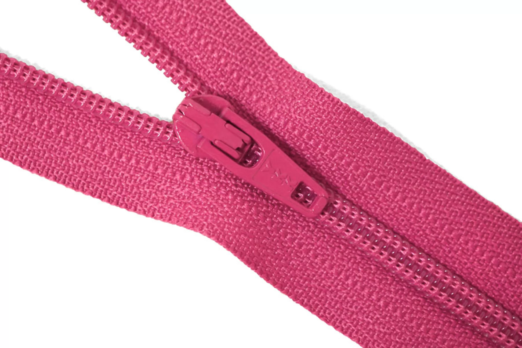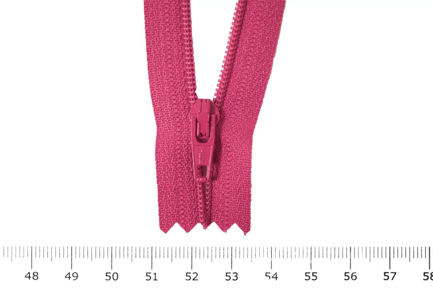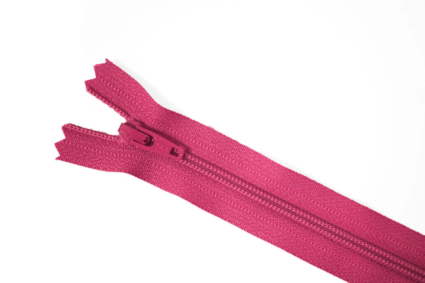 Молния неразъемная, цвета фуксия. Зубцы пластиковые, пуллер и слайдер -металлический. Длина 20 см. Ширина 2,5 м. Ширина зубцов 4 мм.