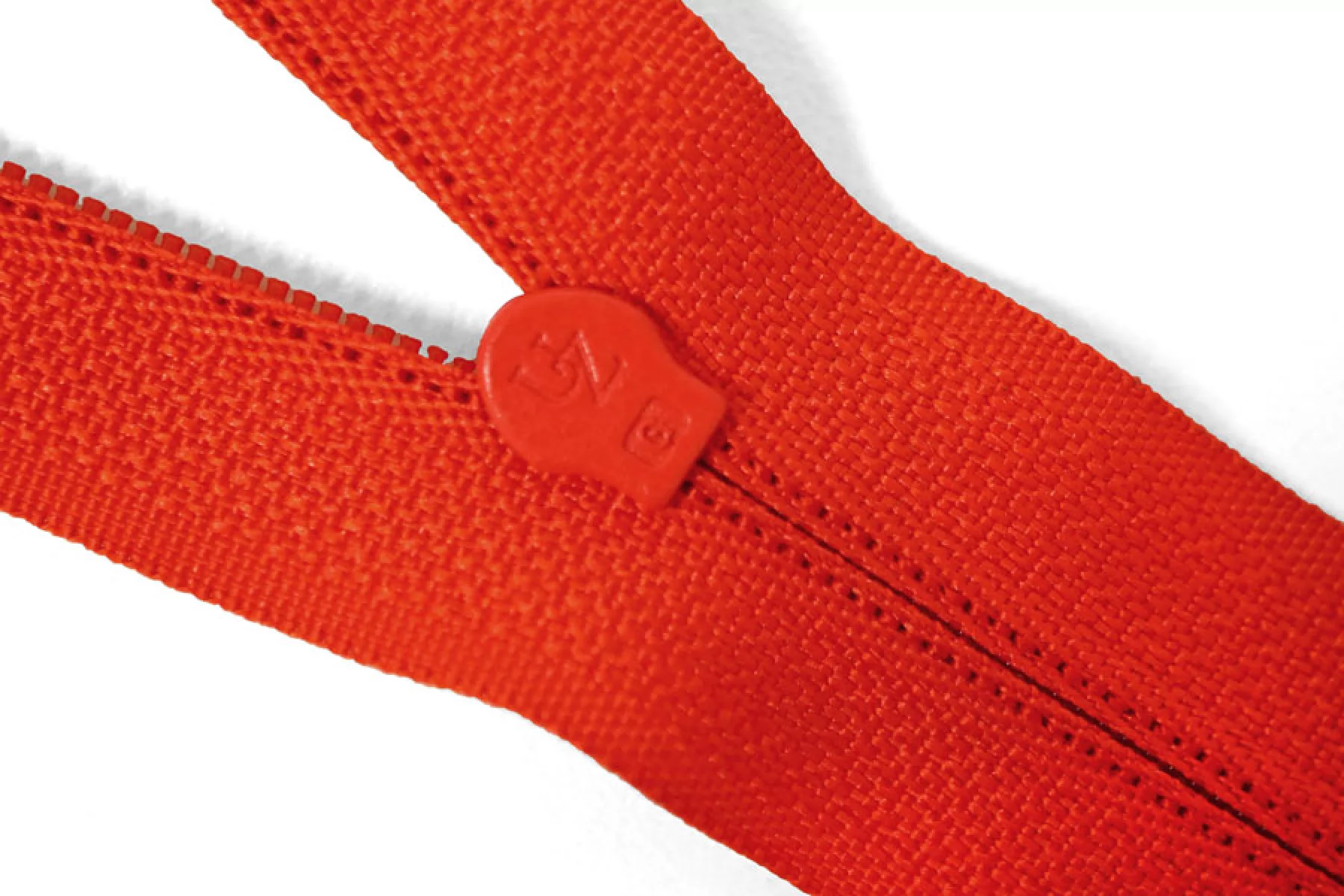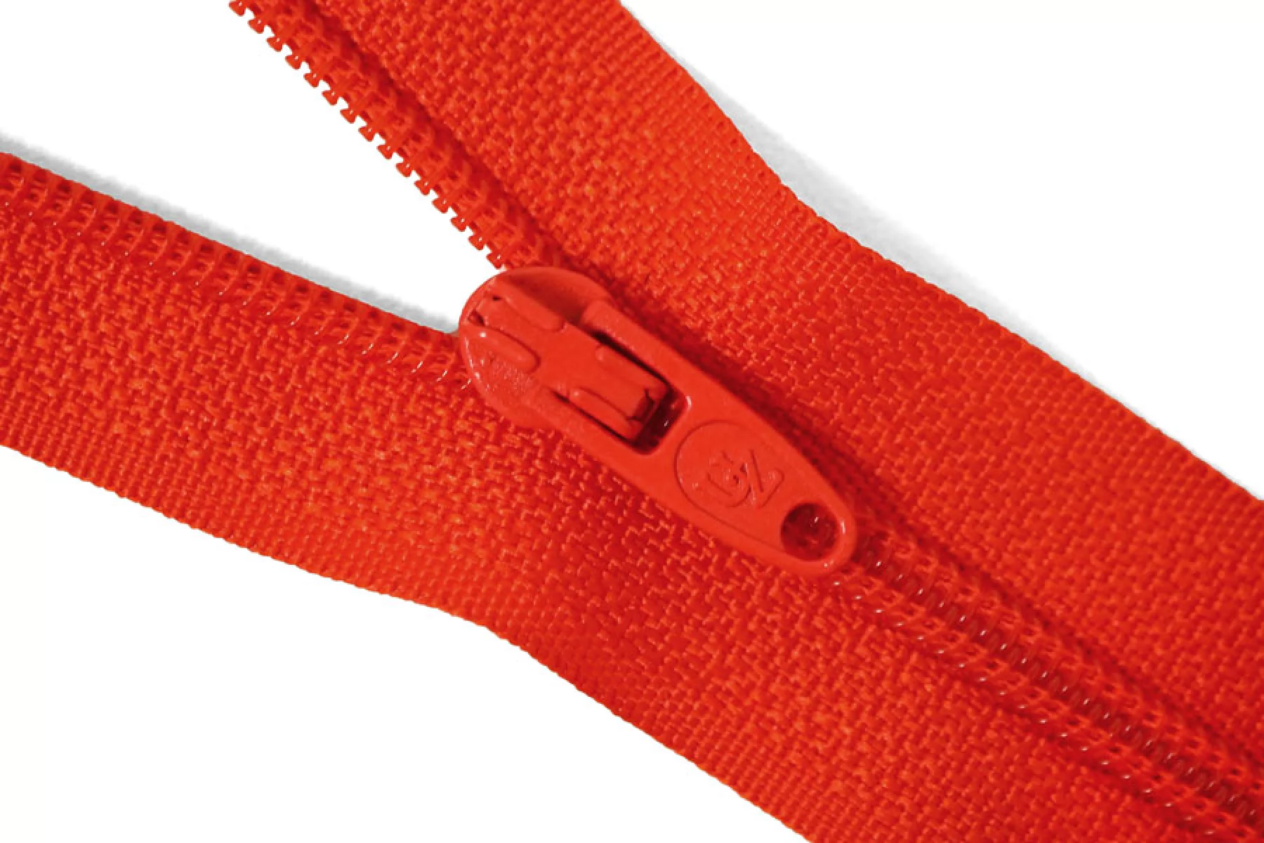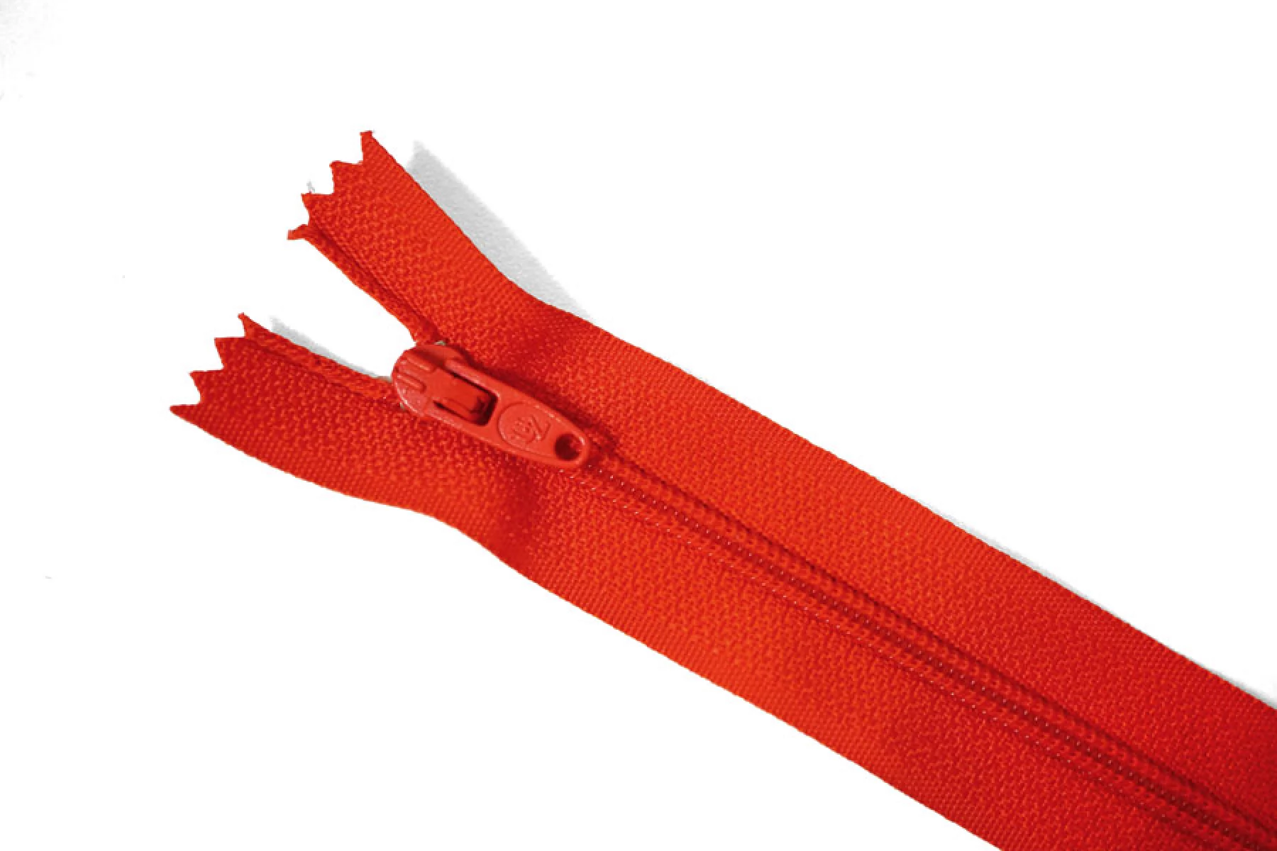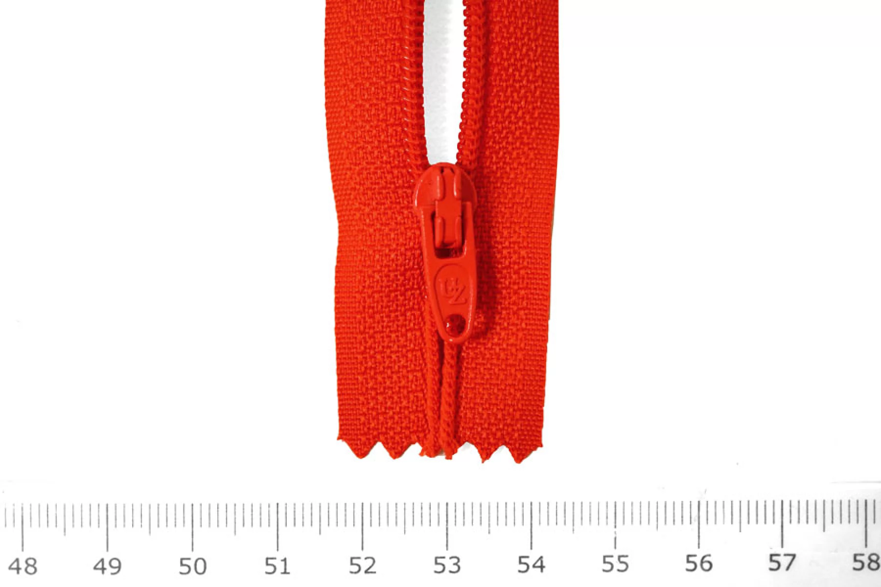 Молния неразъемная, красного цвета . Зубцы пластиковые, пуллер и слайдер -металлический. Длина 16 см. Ширина 2,5 м. Ширина зубцов 4 мм.