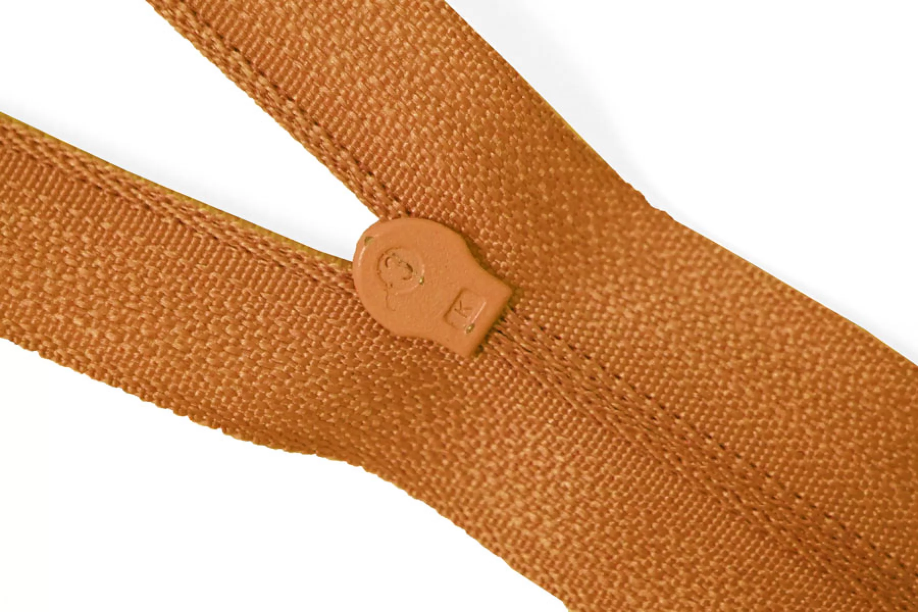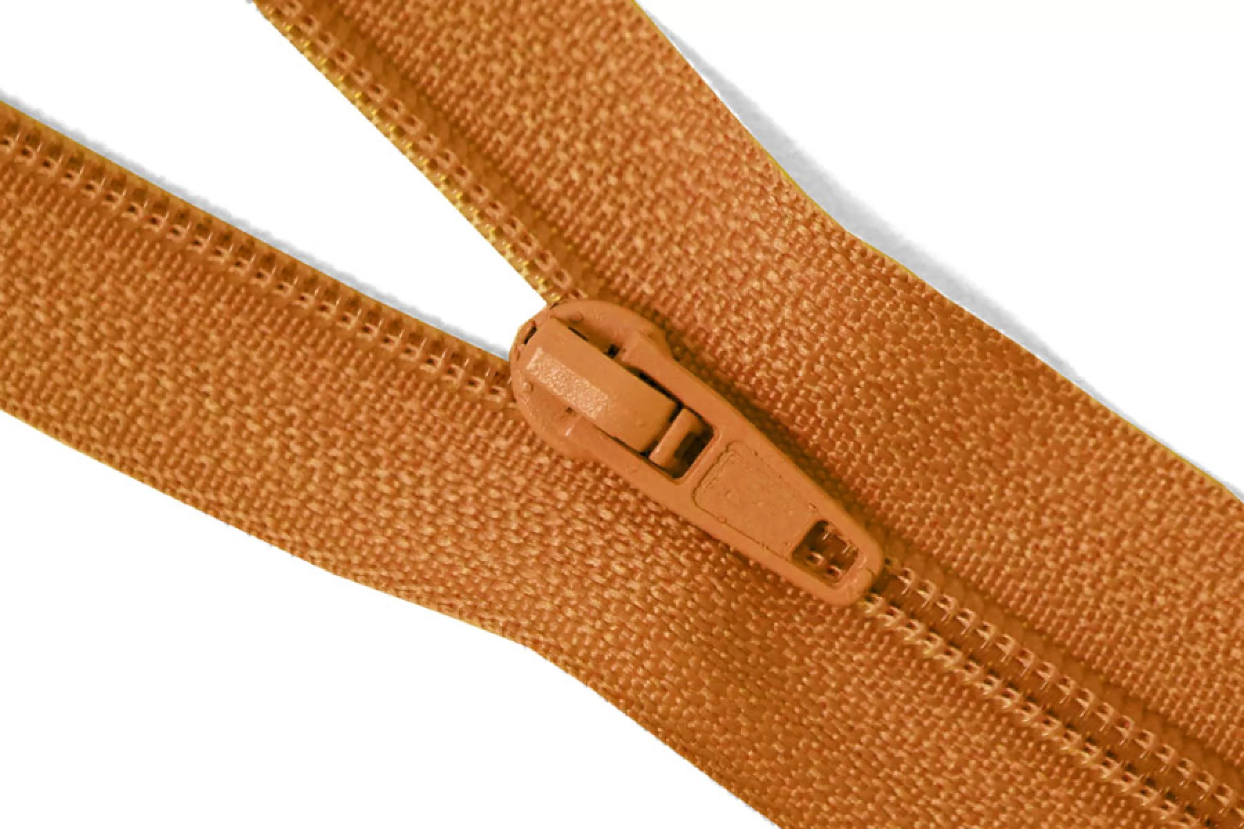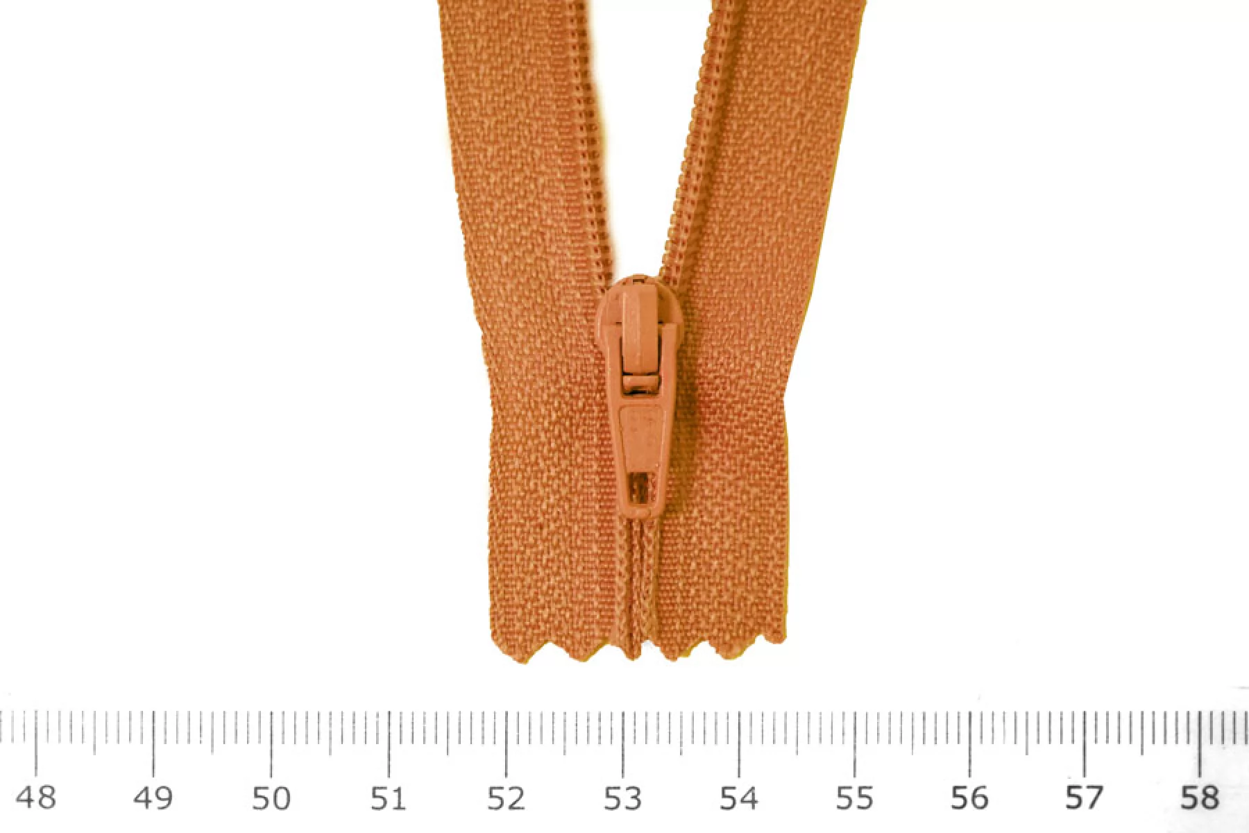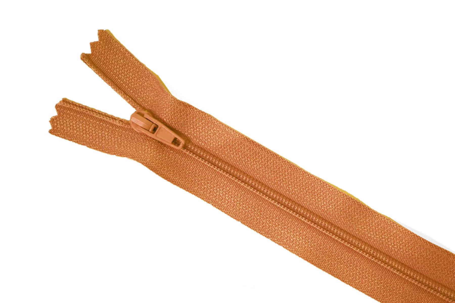 Молния неразъемная, оранжевого цвета. Зубцы пластиковые, пуллер и слайдер -металлический. Длина 20 см. Ширина 2,5 м. Ширина зубцов 4 мм.