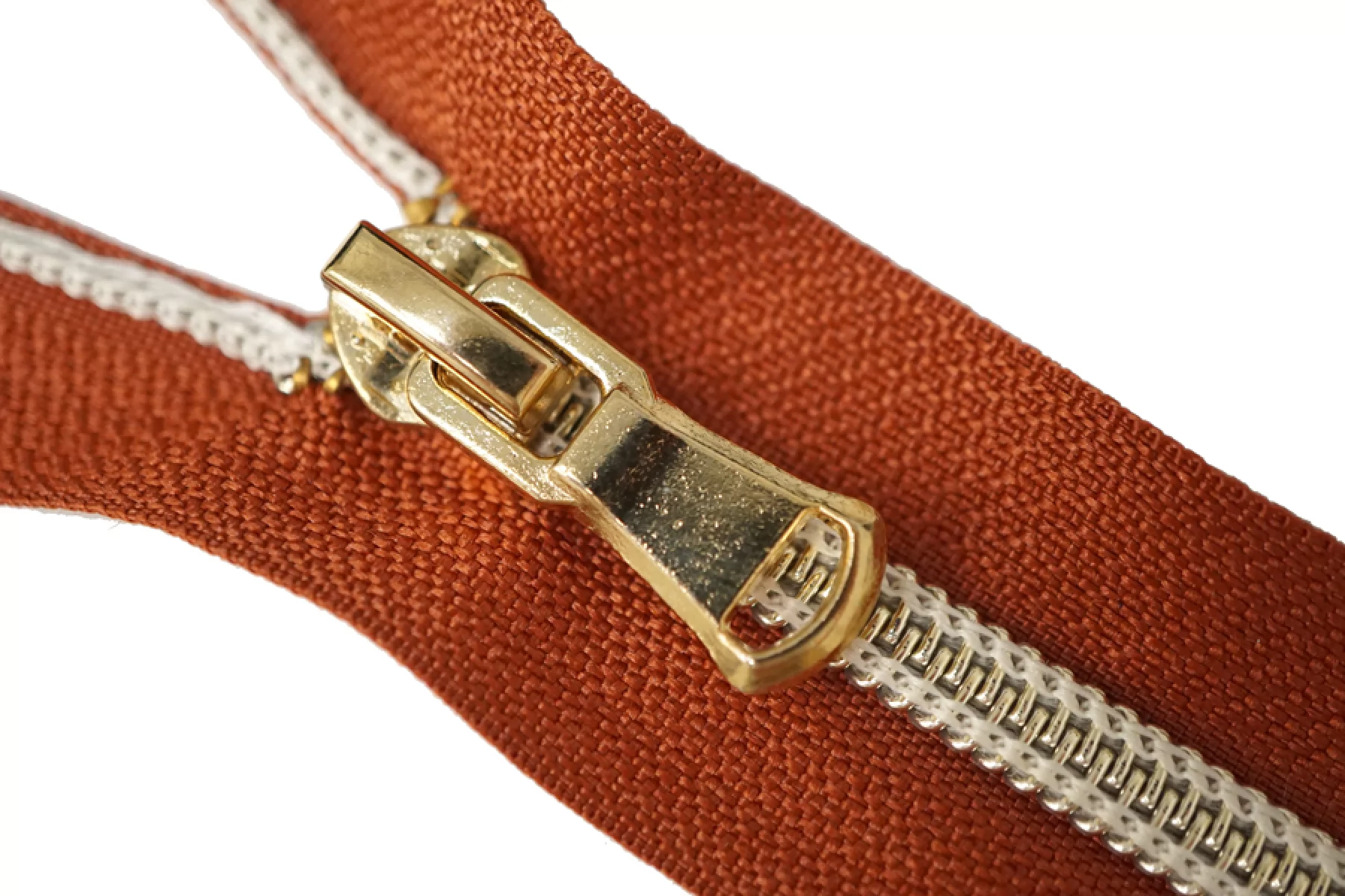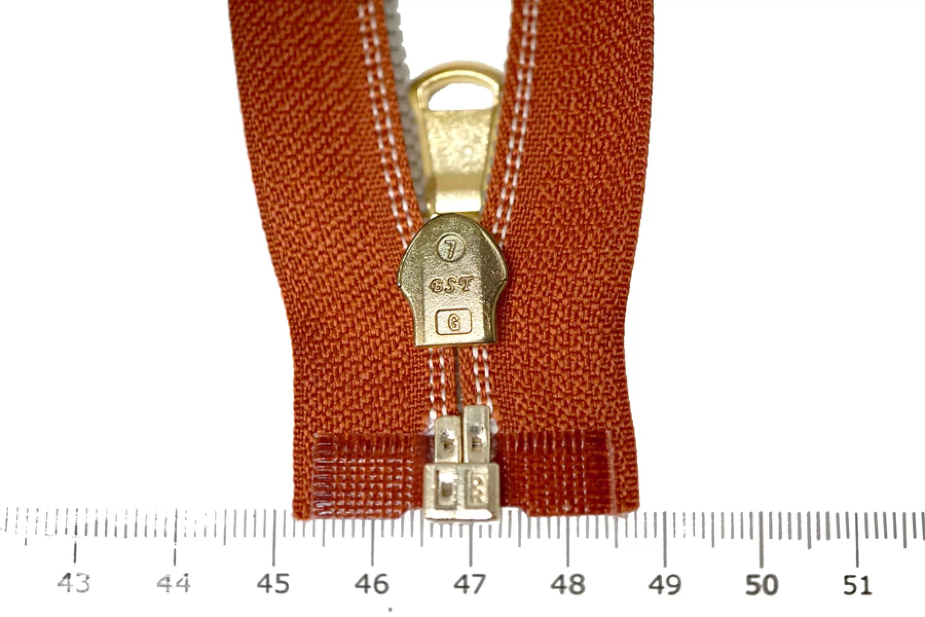 Молния "BST" пластиковая, спиральная, разъемная, один замок. Цвет молнии терракотовый (кирпичный), цвет зубцов, пуллера и слайдера золото. Длина 50см. Ширина молнии 3см, ширина зубцов 5мм.