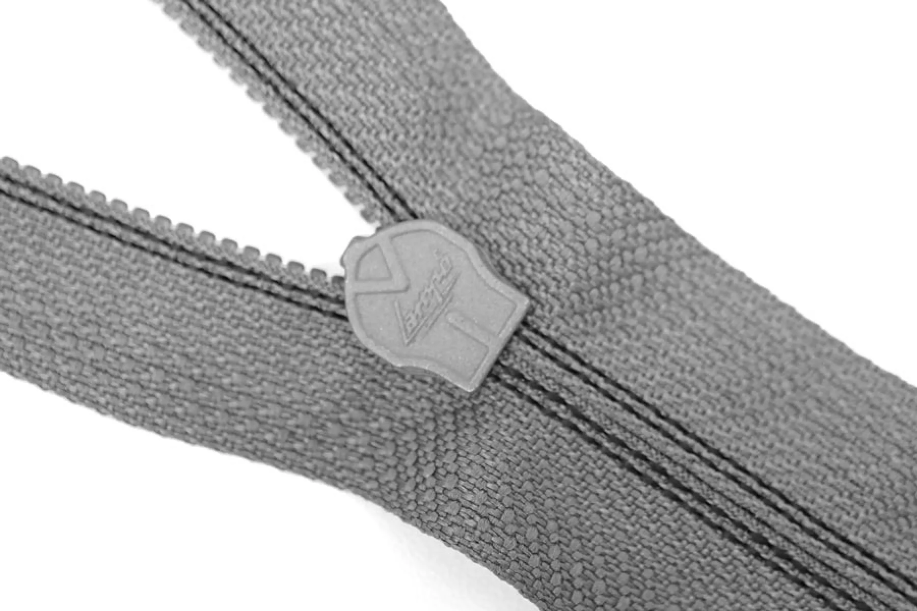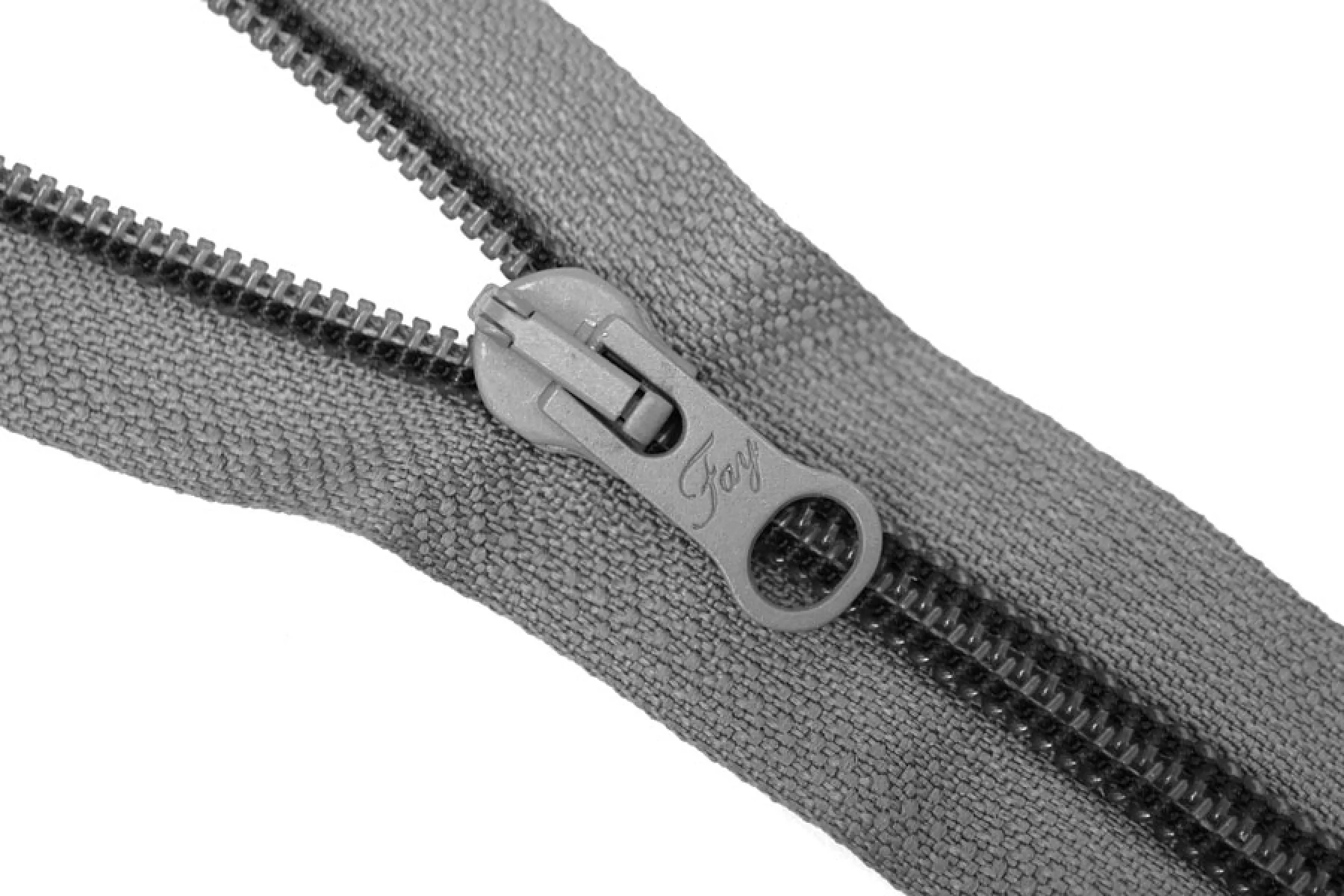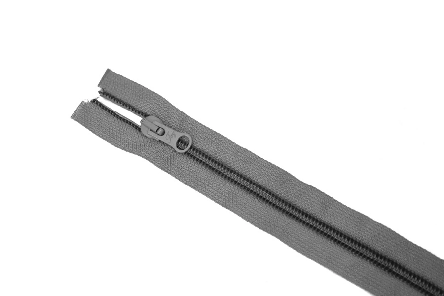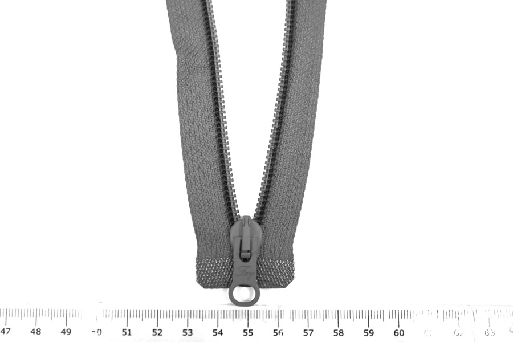 Молния от Итальянского производителя "Lampo" разъемная, однозамковая, серого цвета, цвет зубцов - серый пластик, слайдер - серого цвета, металлический, пулер - металлический серого цвета. Ширина молнии - 3,0 см, ширина зубцов 5 мм. Длина молнии 57 см.