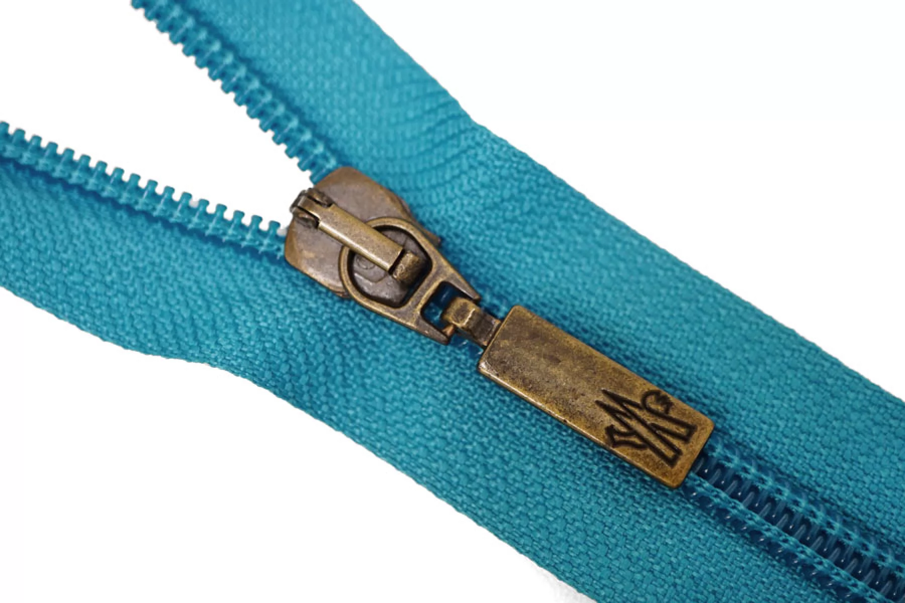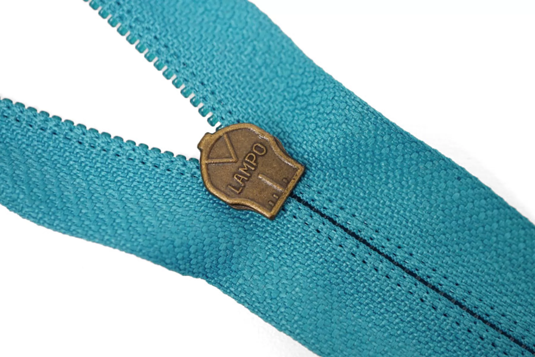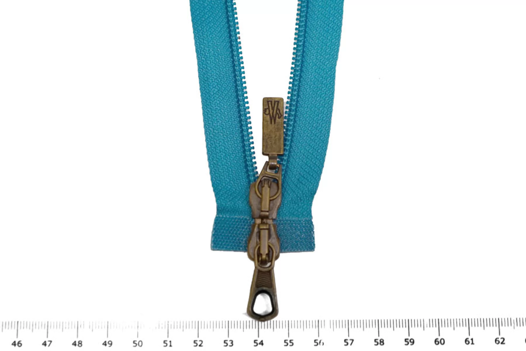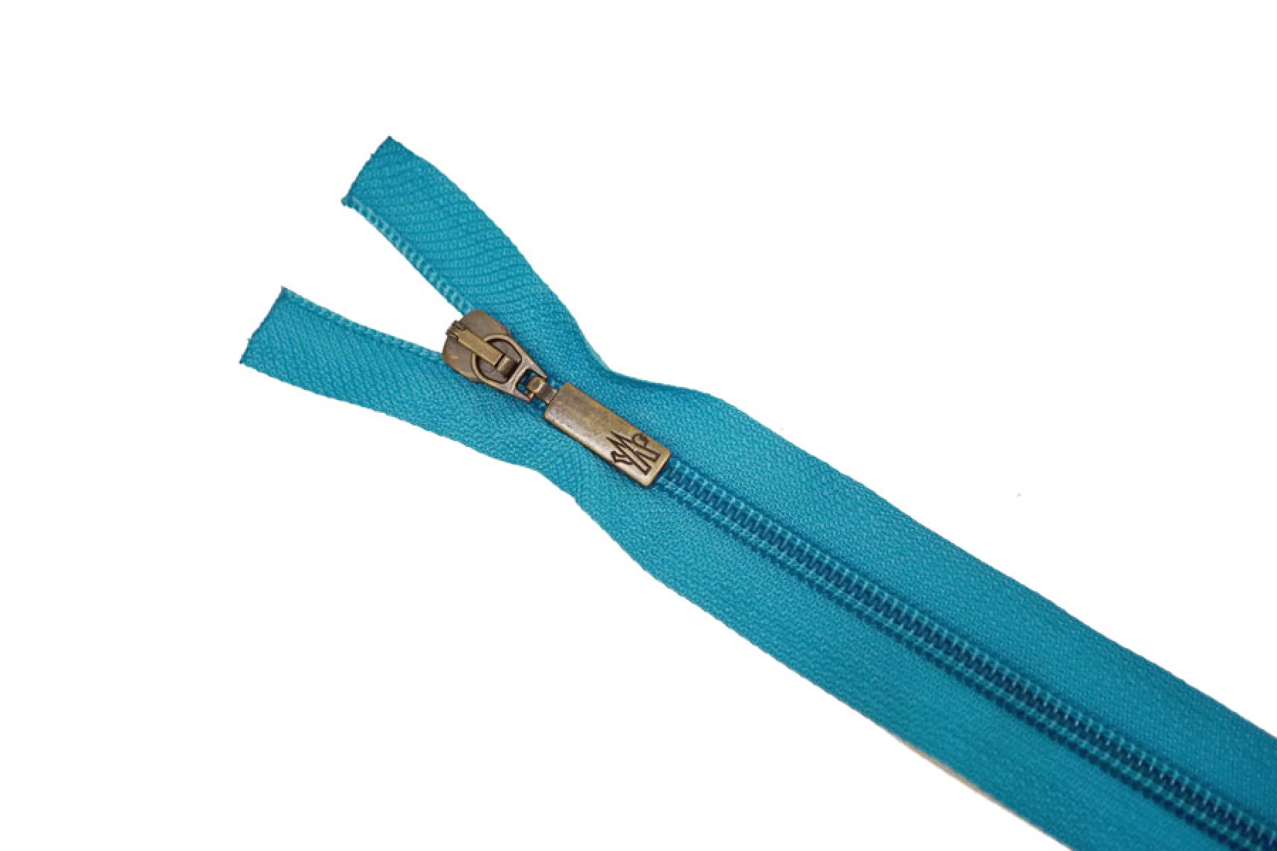 Молния от Итальянского производителя "Lampo" разъемная, двухзамковая, темно-бирюзового цвета, цвет зубцов - бирюзовый пластик, слайдер - медного цвета, металлический, пулер - металлический медного цвета. Ширина молнии - 3,0 см, ширина зубцов 5 мм. Длина молнии 76 см.