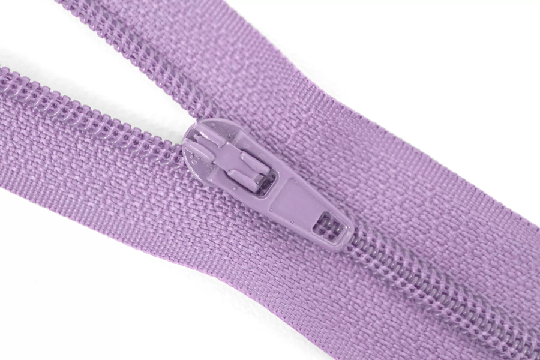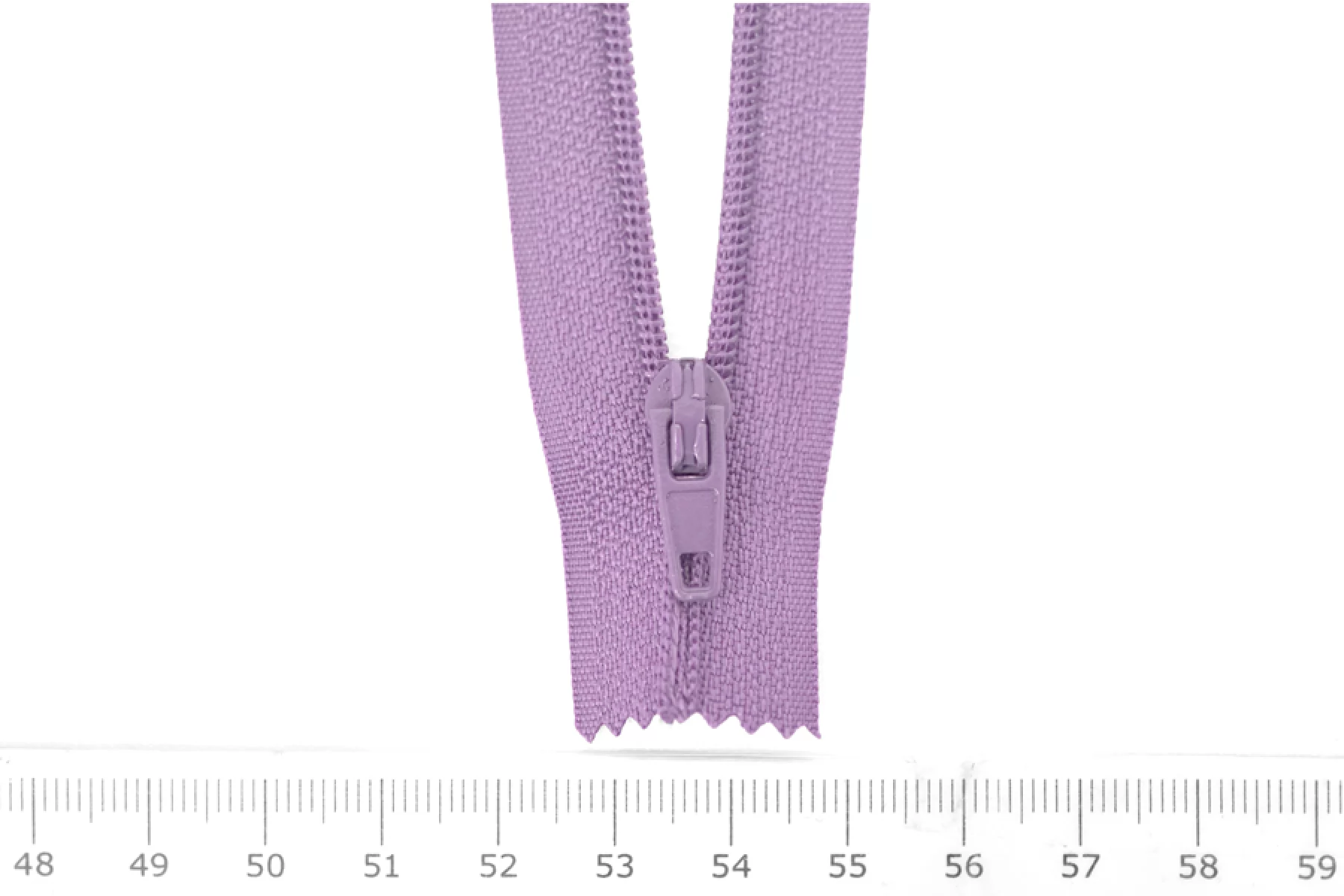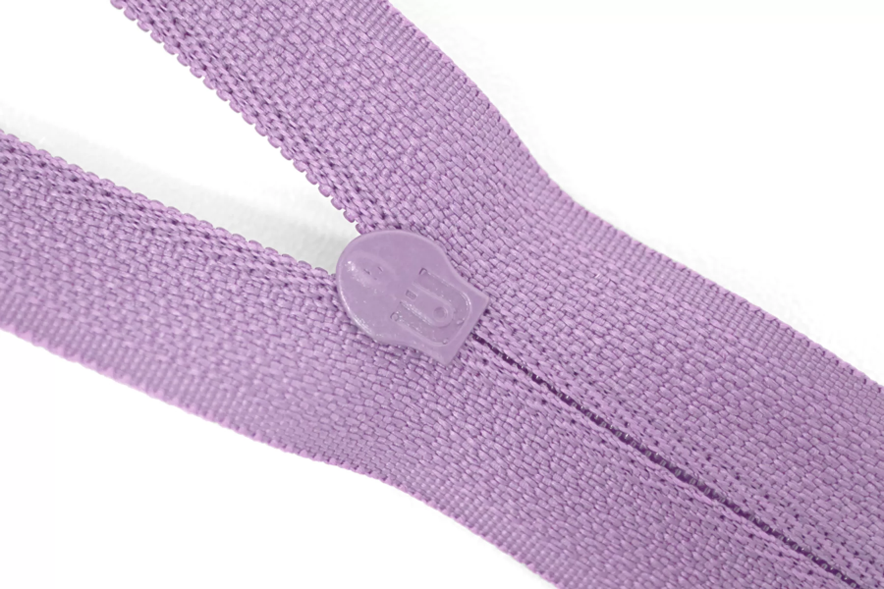 Молния неразъемная, сиреневого оттенка. Зубцы пластиковые, пуллер и слайдер -металлический. Длина 20 см. Ширина 2,5 м. Ширина зубцов 4 мм.
