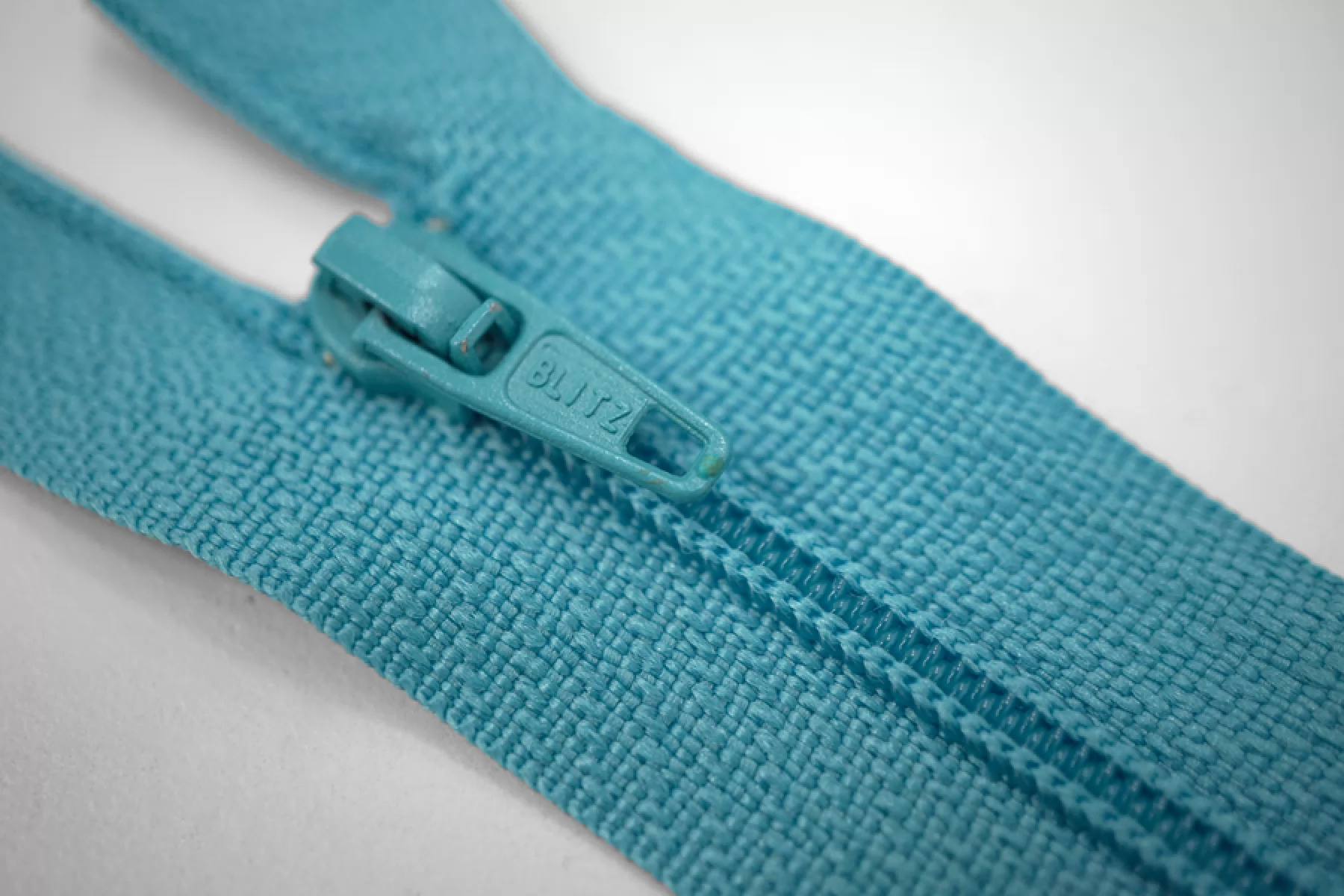 Молния спиральная пластиковая от "BLITZ" неразъёмная, однозамковая, бирюзово-голубого цвета. Длина 18 см.