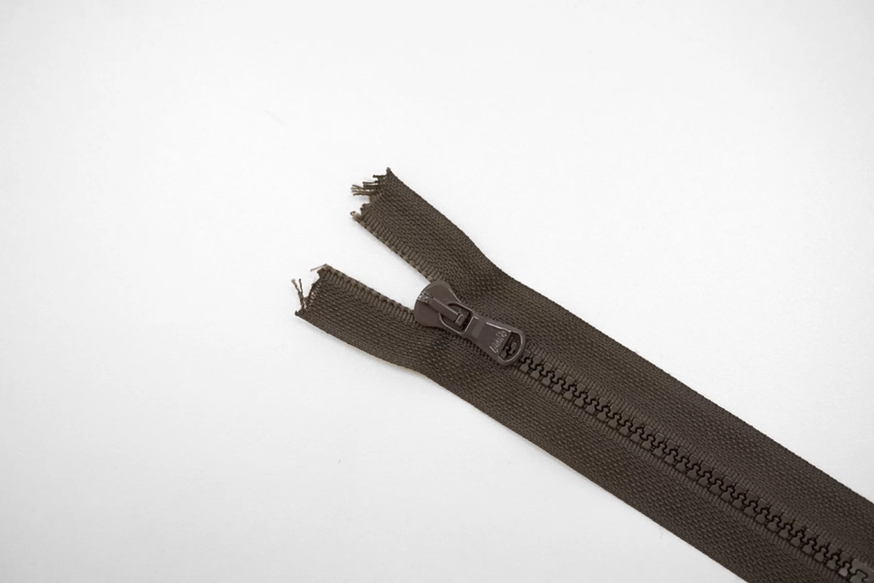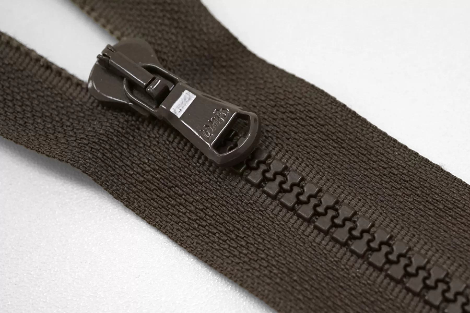 Молния тракторная пластиковая от "Lampo" неразъёмная, однозамковая, серо-коричневого цвета. Длина 14 см.