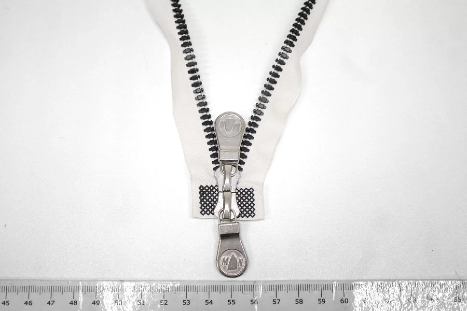 Молния тракторная пластиковая двухзамковая, разъёмная, белого цвета, слайдер и пуллер серебряного цвета, цвет зубцов черный. Длина 63 см.