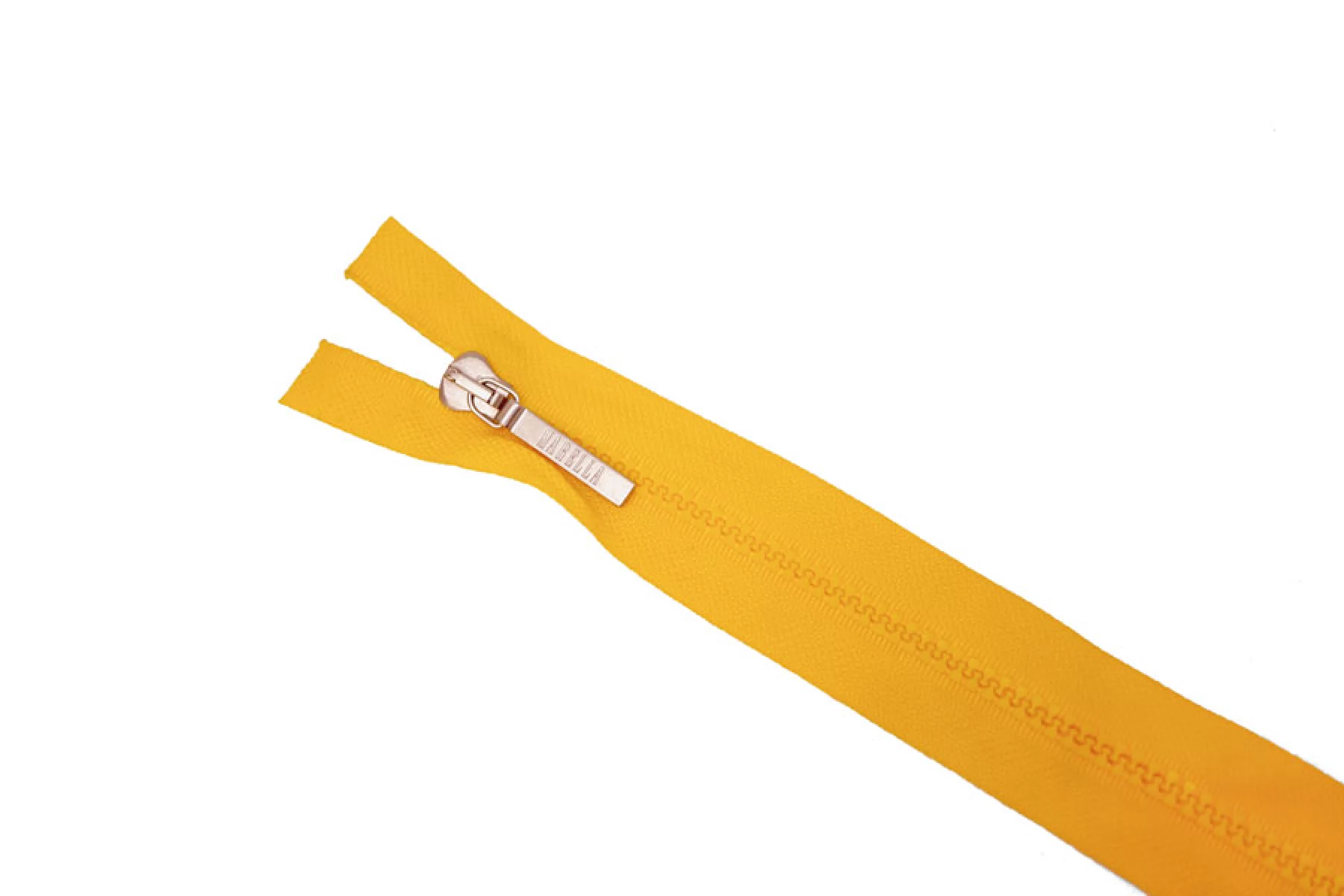 Молния "Lampo" тракторная пластиковая двухзамковая, разъёмная, желтого цвета, слайдер и пуллер серебряного цвета, цвет зубцов желтый. Длина 61 см.