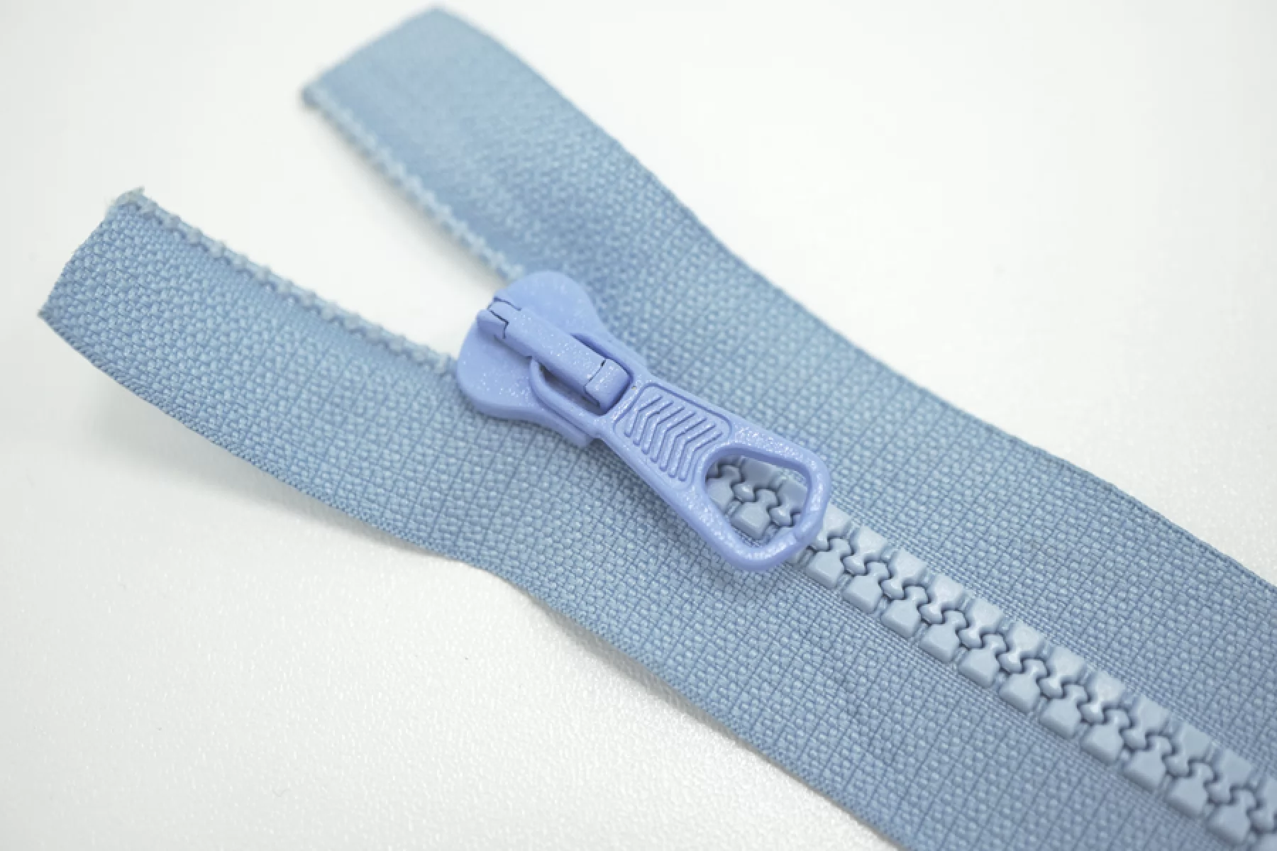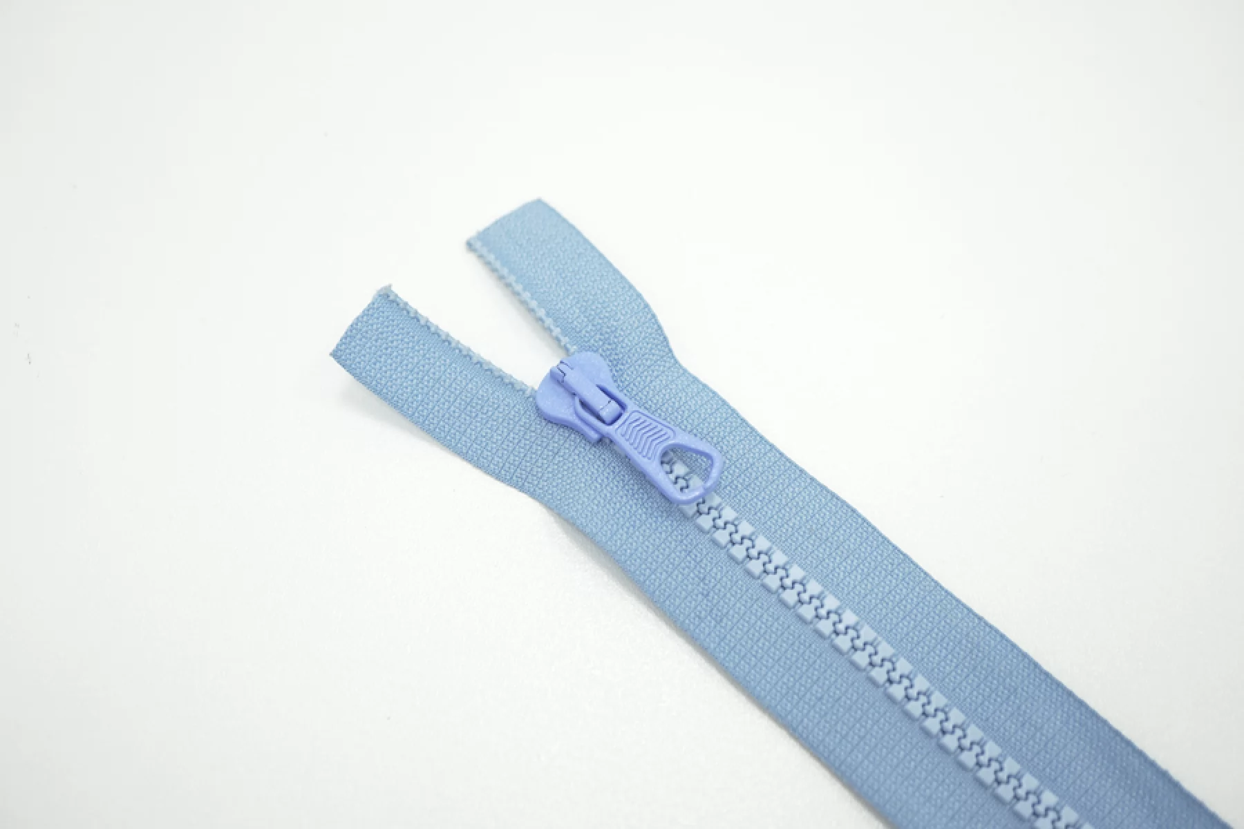 Молния тракторная пластиковая разъёмная, двухзамковая, нежно-голубого цвета, пуллер и слайдер сиреневого оттенка. Длина 65 см.