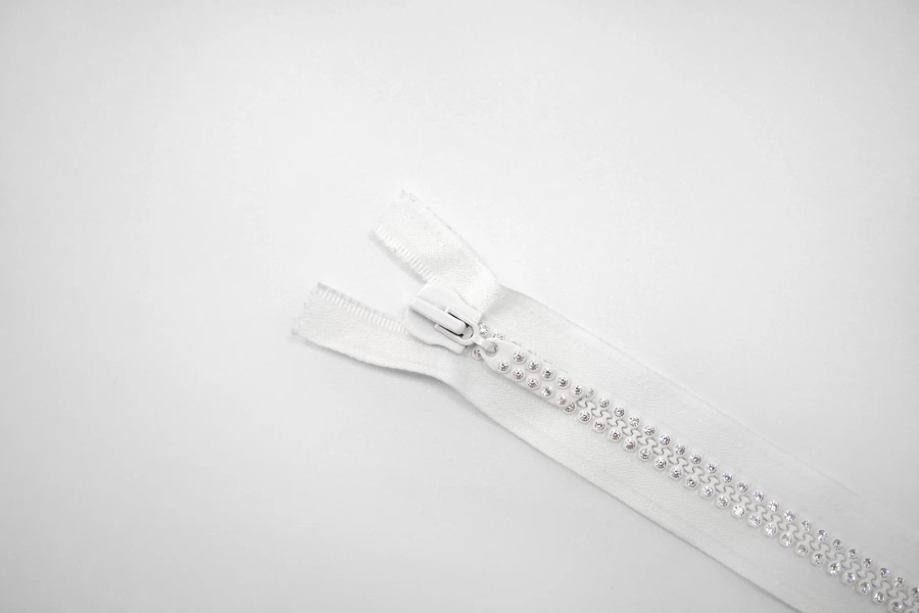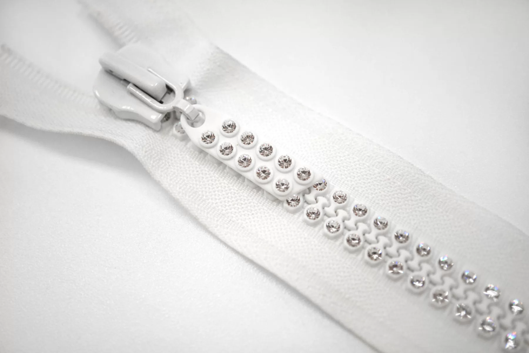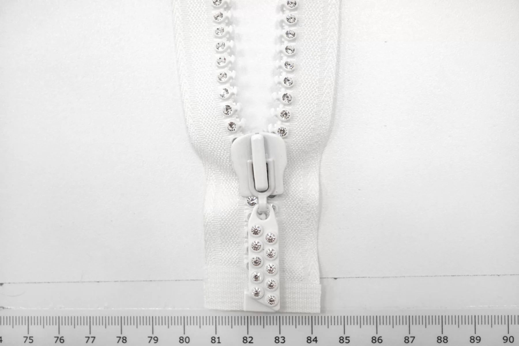 Молния тракторная пластиковая от "Swarovski" разъёмная, однозамковая, белого цвета, на зубцах расположены стразы, пуллер пластиковый со стразами, слайдер металлический. Длина 45 см.