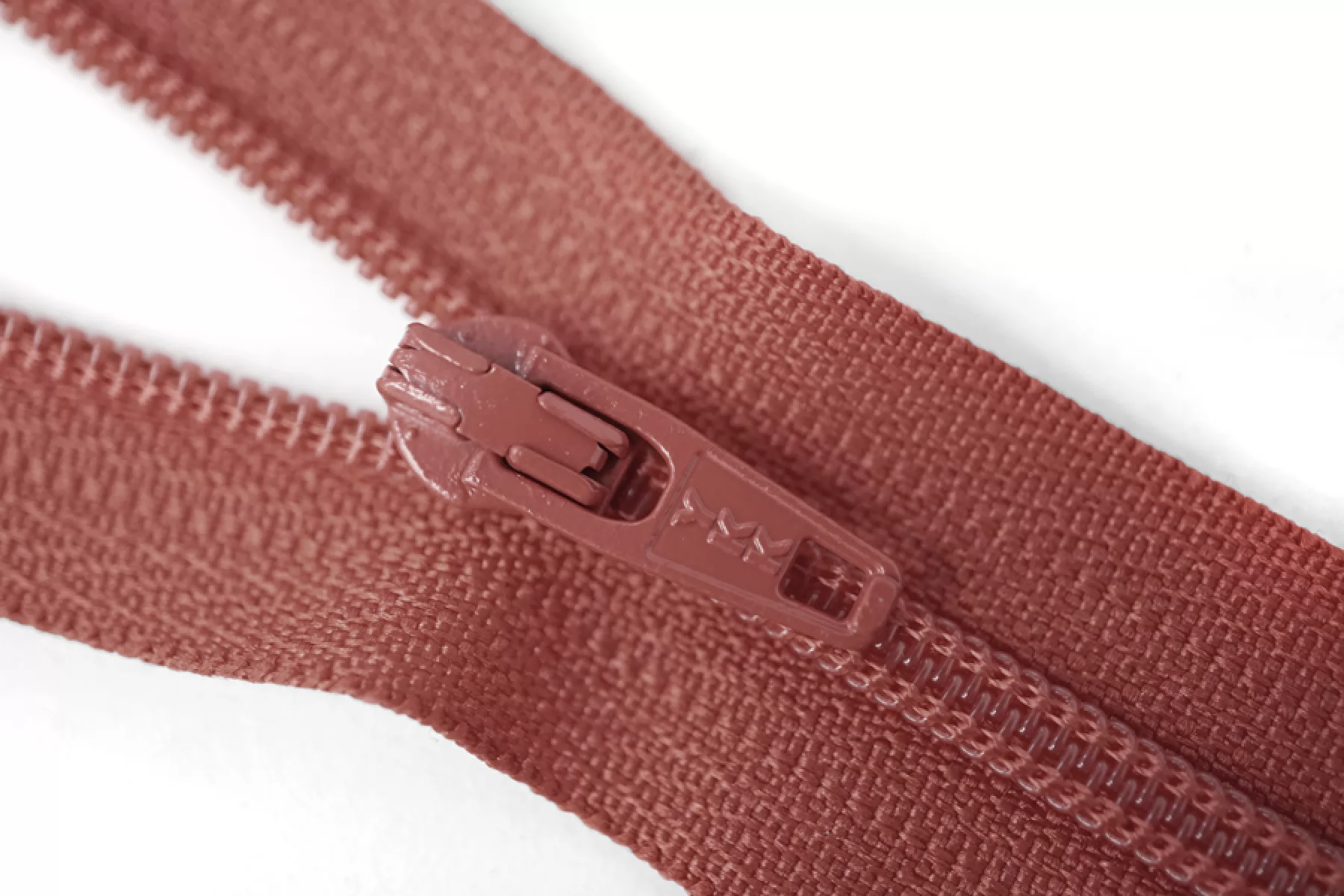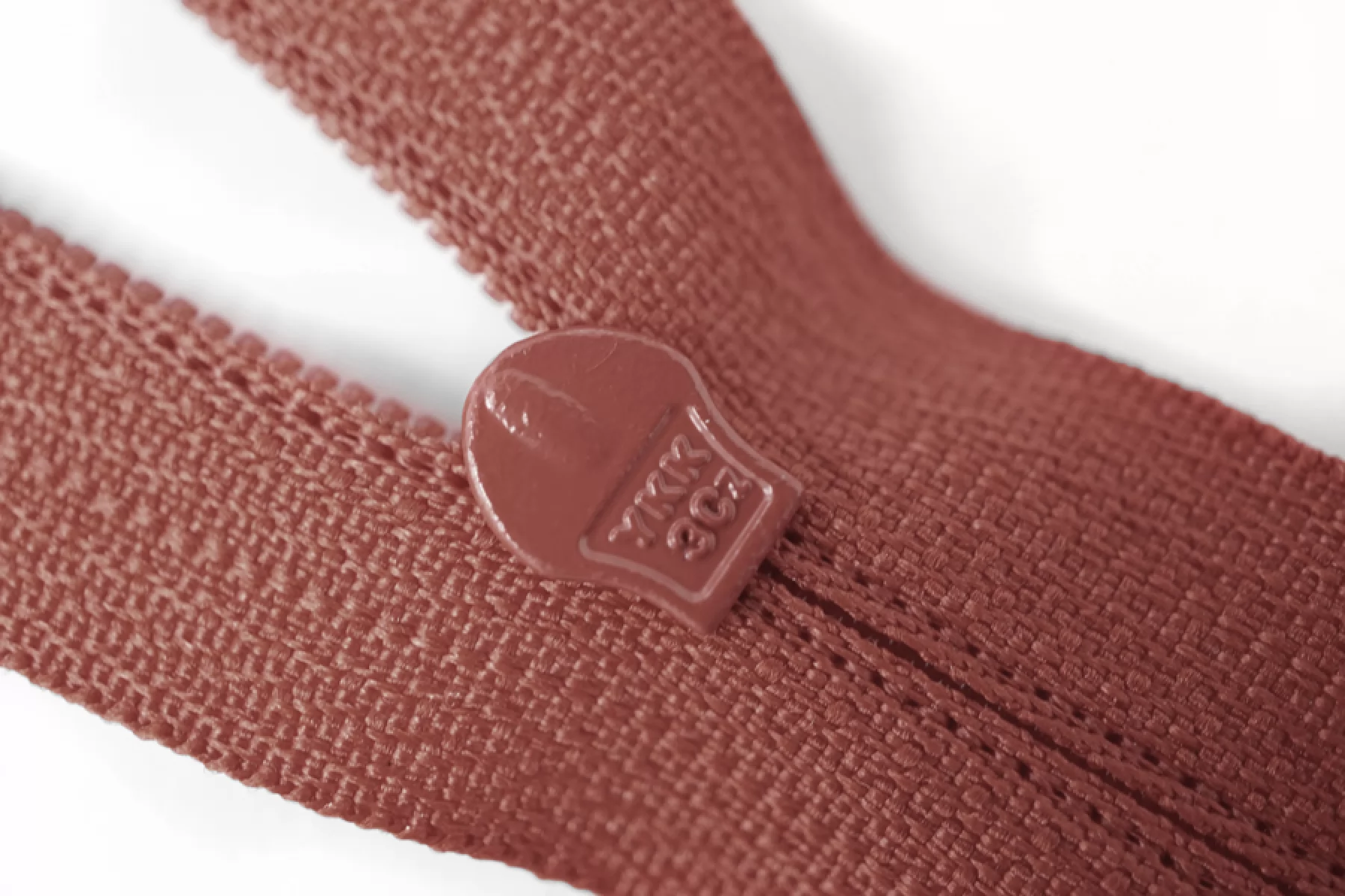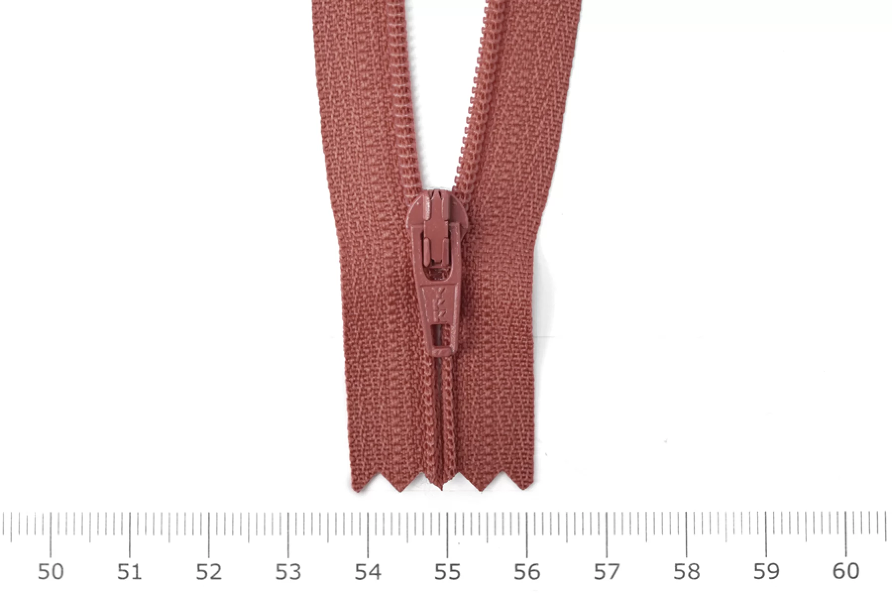 Молния YKK неразъемная, в оттенке красного дерева, цвет зубцов и пуллера - красный. Зубцы пластиковые, пуллер -металлический. Длина 15,5 см. Ширина 2,2 мм. Ширина зубцов 4 мм.
