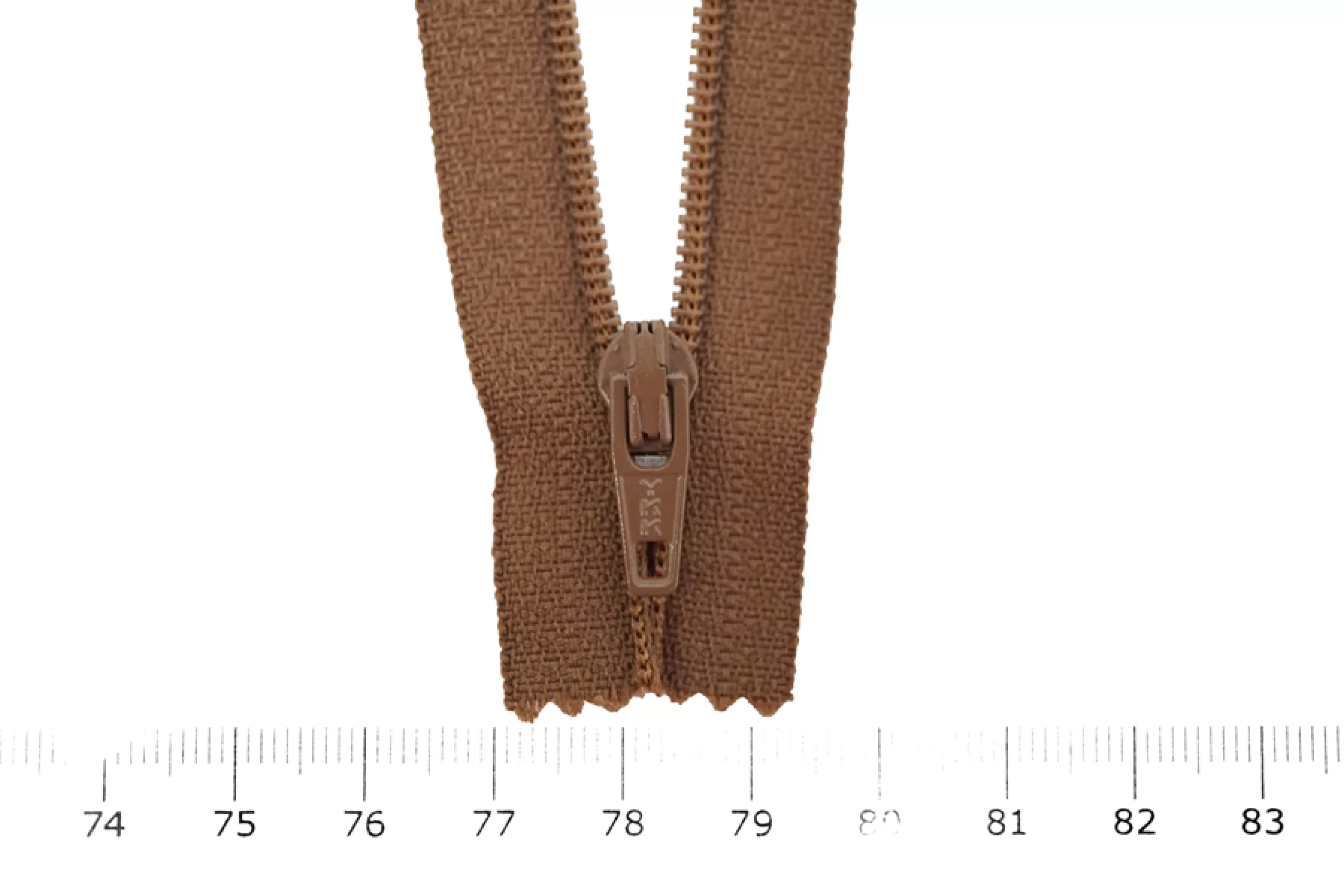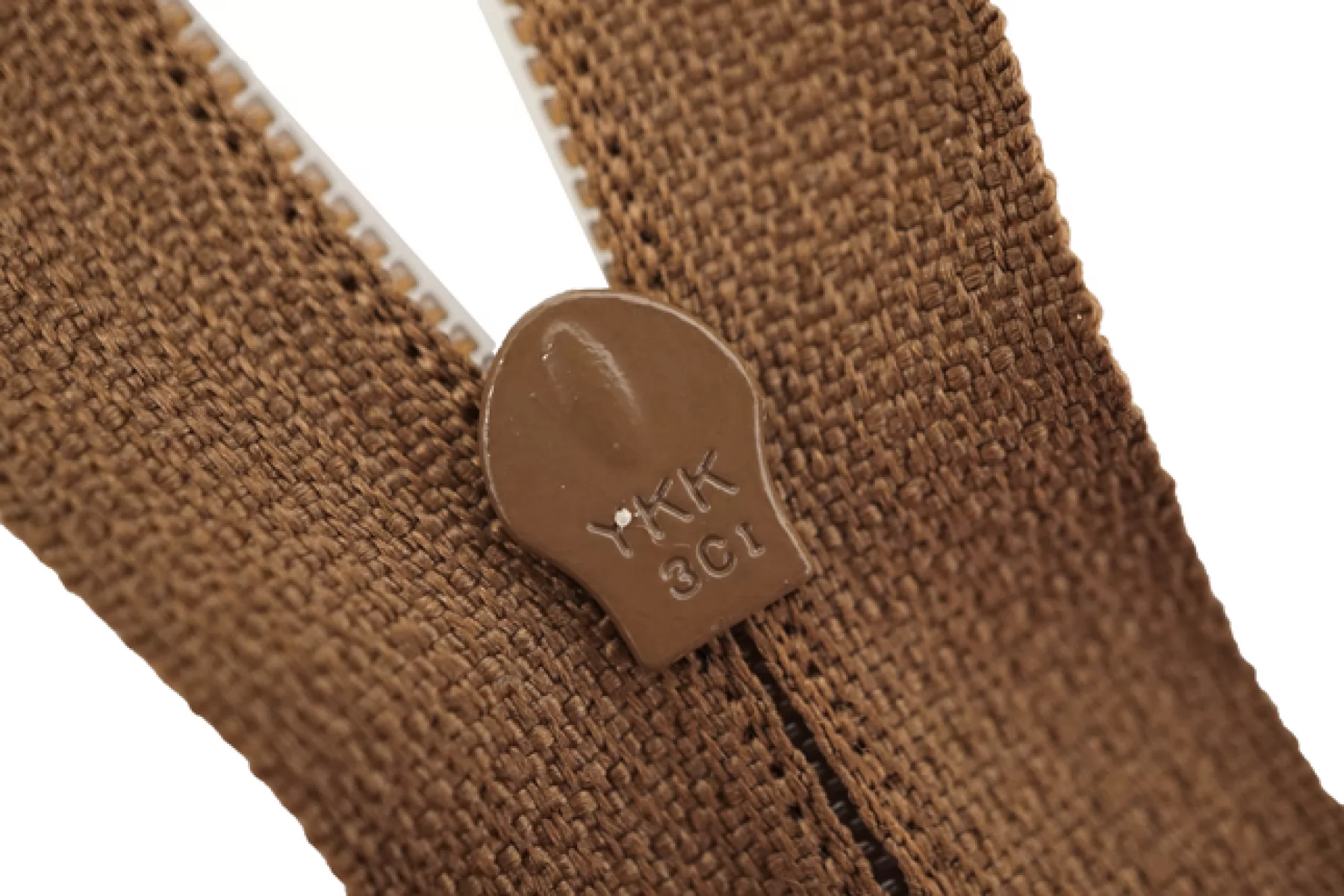 Молния от YKK неразъемная, молочно - шоколадного оттенка, цвет зубцов и пуллера коричневый/серебряный, цвет зубцов коричневый. Длина 18 см. Ширина 2,4 м. Ширина зубцов 4 мм.