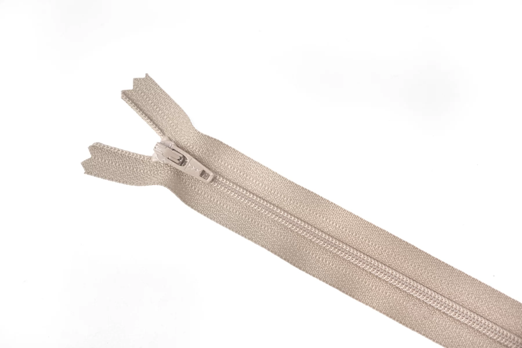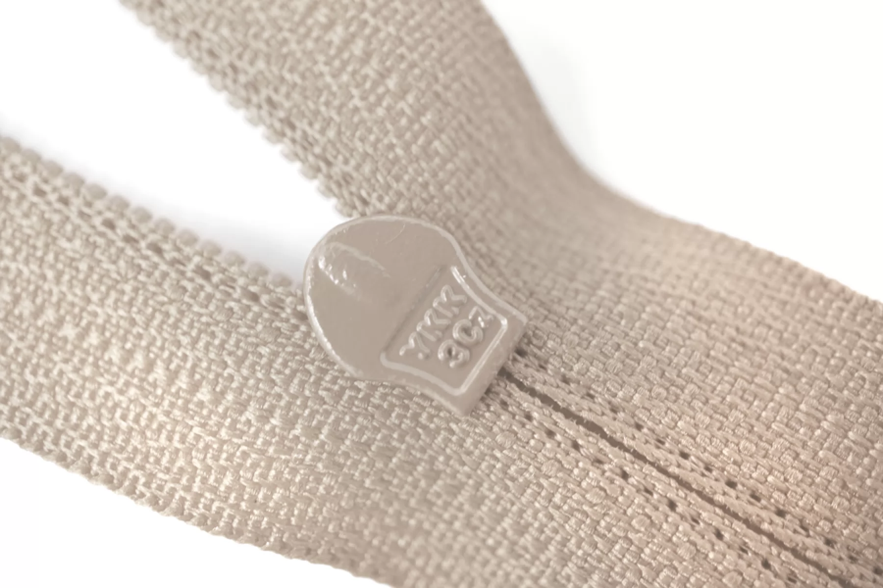 Молния YKK неразъемная, серо-кофейного оттенка, цвет зубцов и пуллера - серо-кофейный. Зубцы пластиковые, пуллер -металлический. Длина 15,5 см. Ширина 2,2 мм. Ширина зубцов 4 мм.