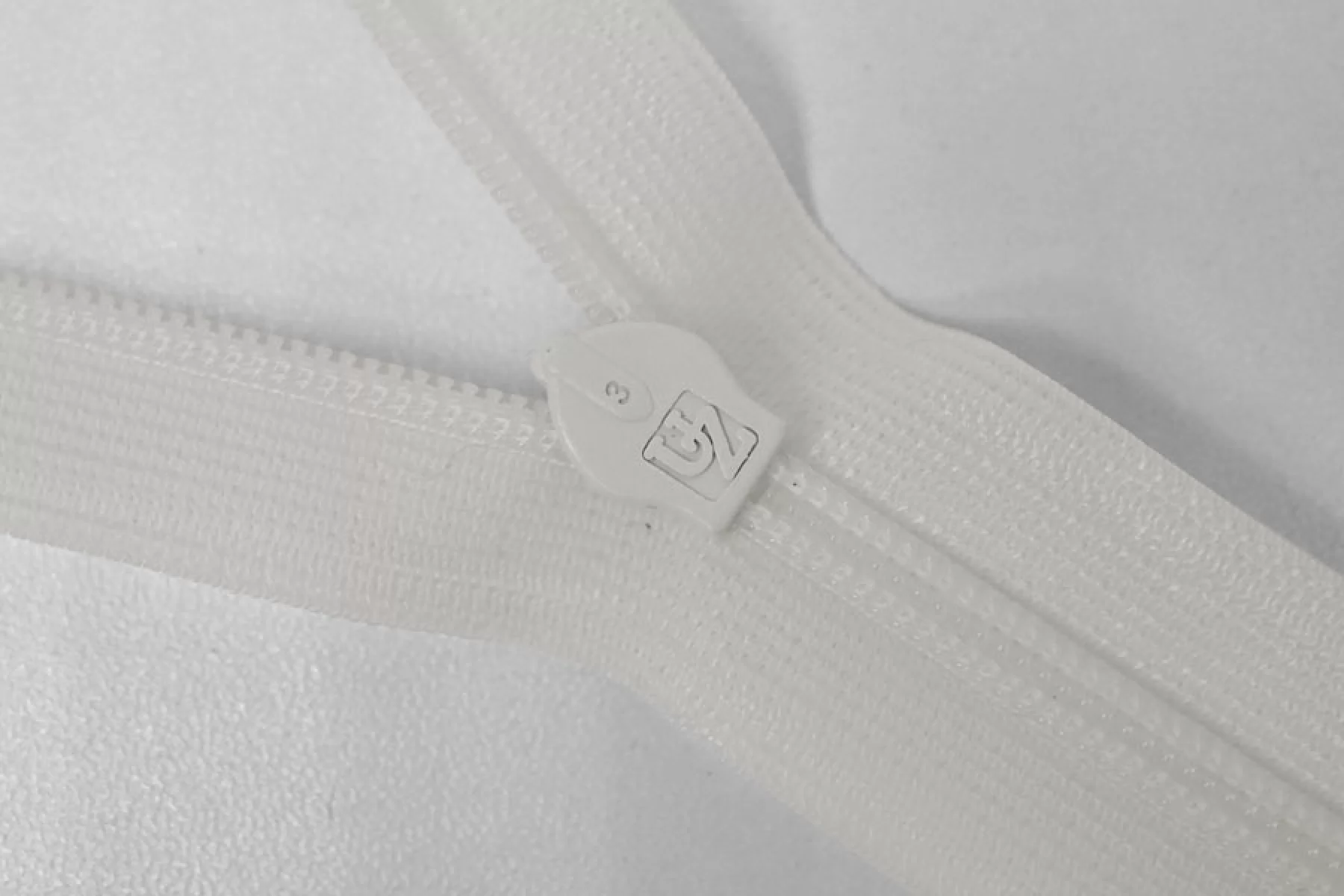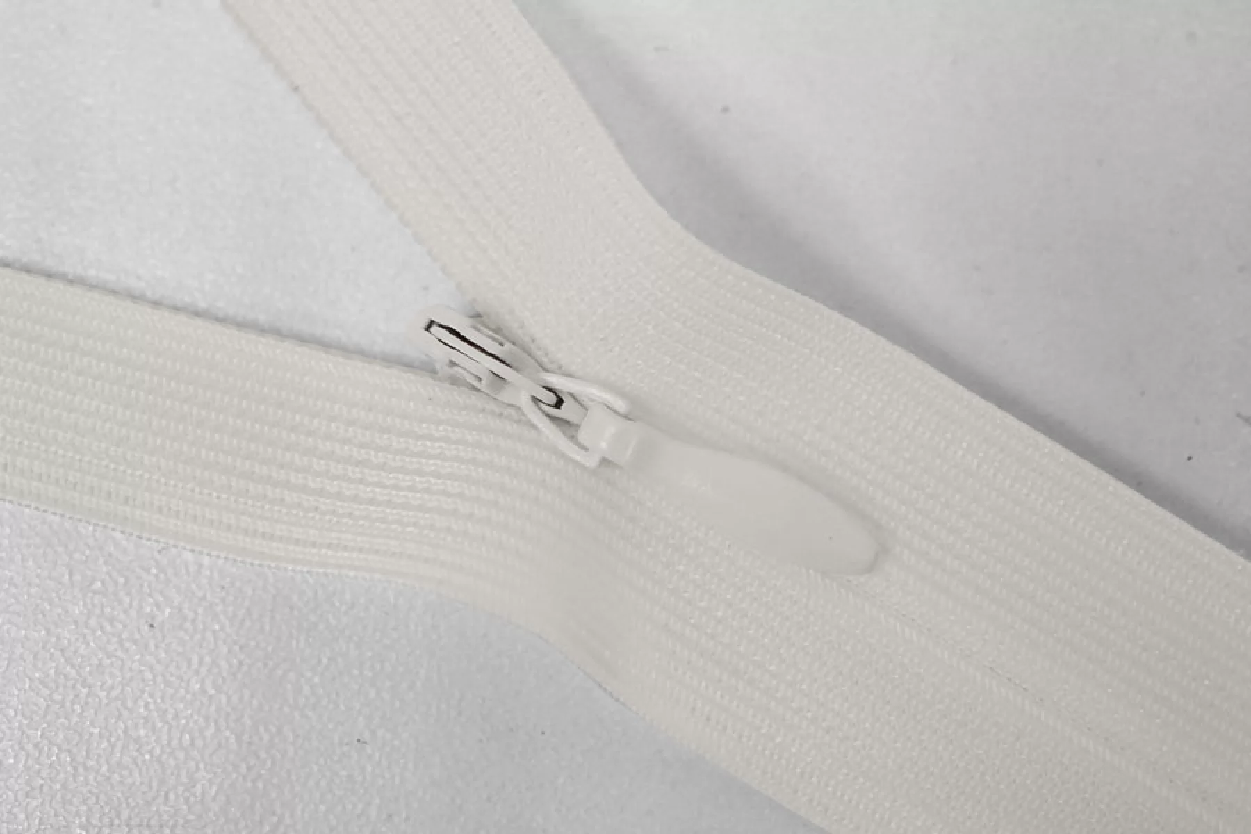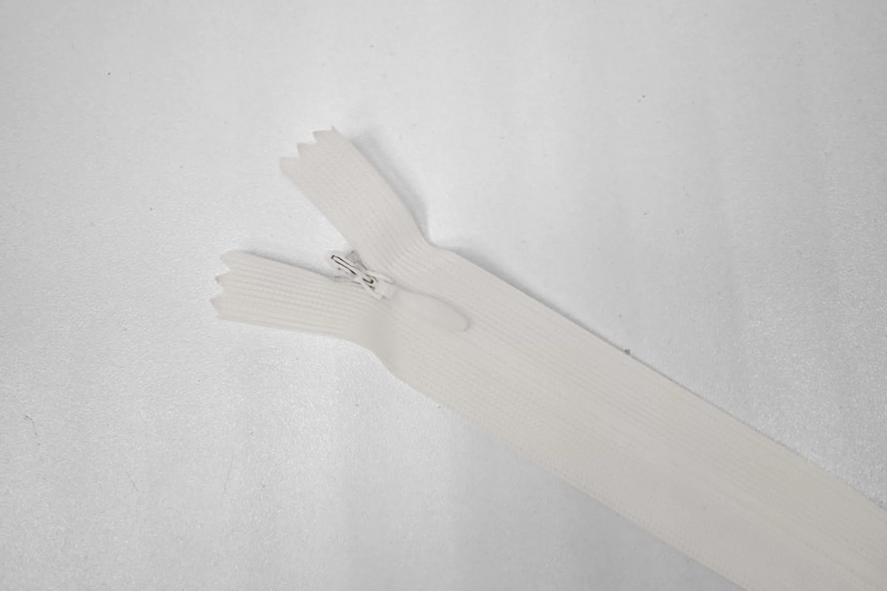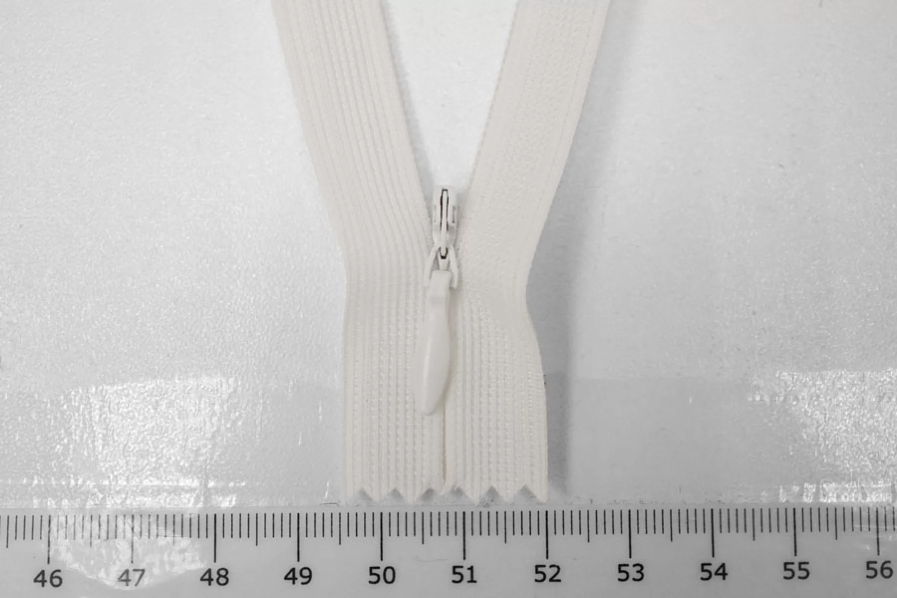 Потайная молния белого цвета от бренда UZ, длина 54 см. Неразъемная. Зубцы пластиковые, слайдер и пуллер металл белого цвета. Ширина молнии 2,3 см. Ширина зубцов 5 мм.