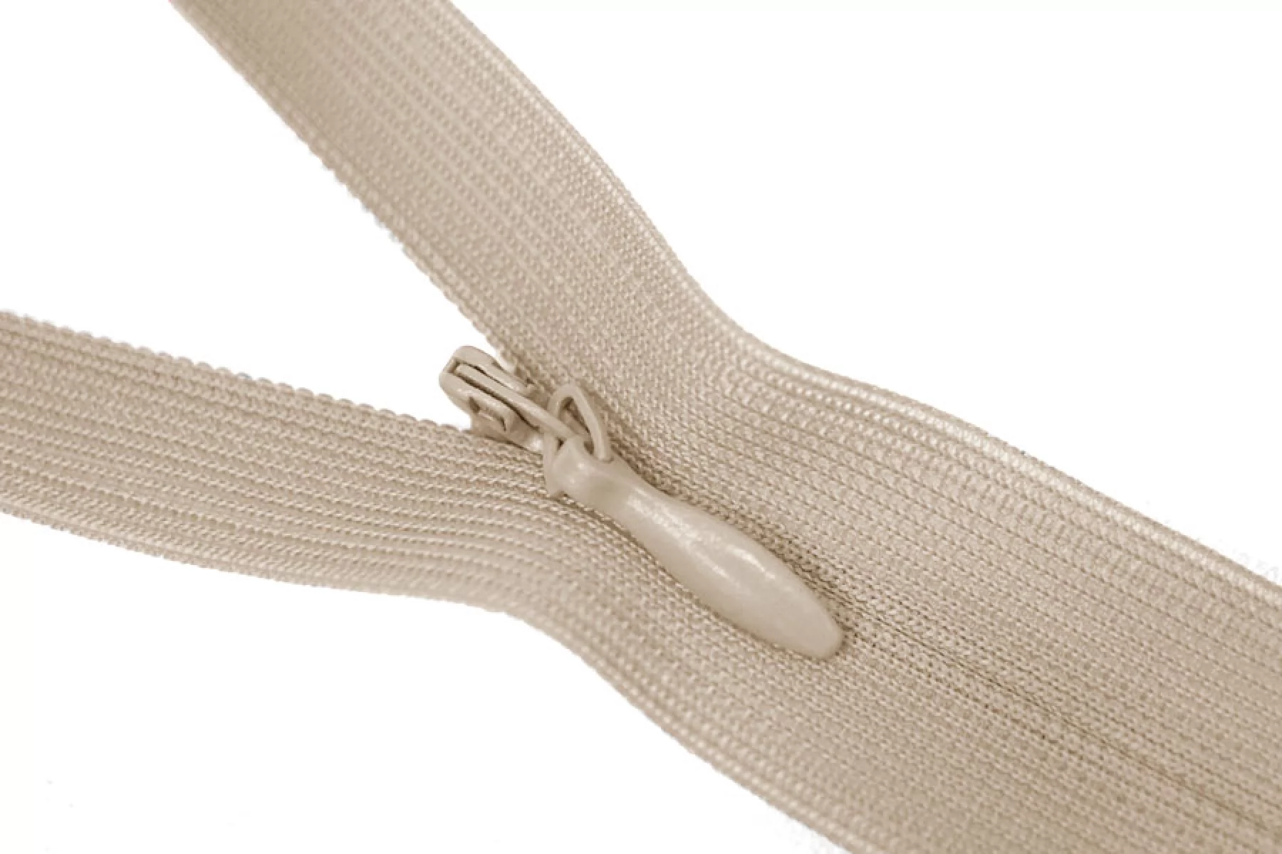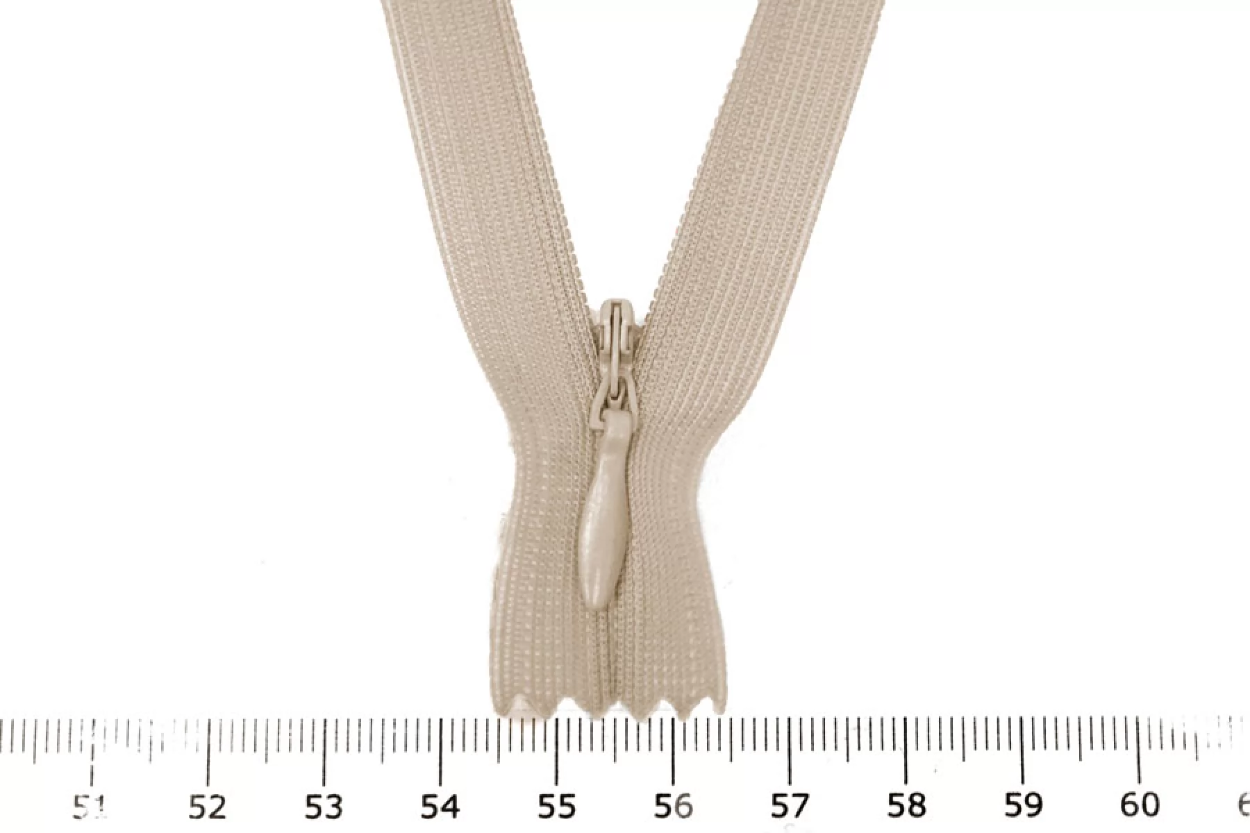 Потайная молния бежевого цвета, длина 20 см. Неразъемная. Зубцы пластиковые, слайдер и пуллер - металл в тон молнии. Ширина молнии 2,2 см. Ширина зубцов 4 мм.