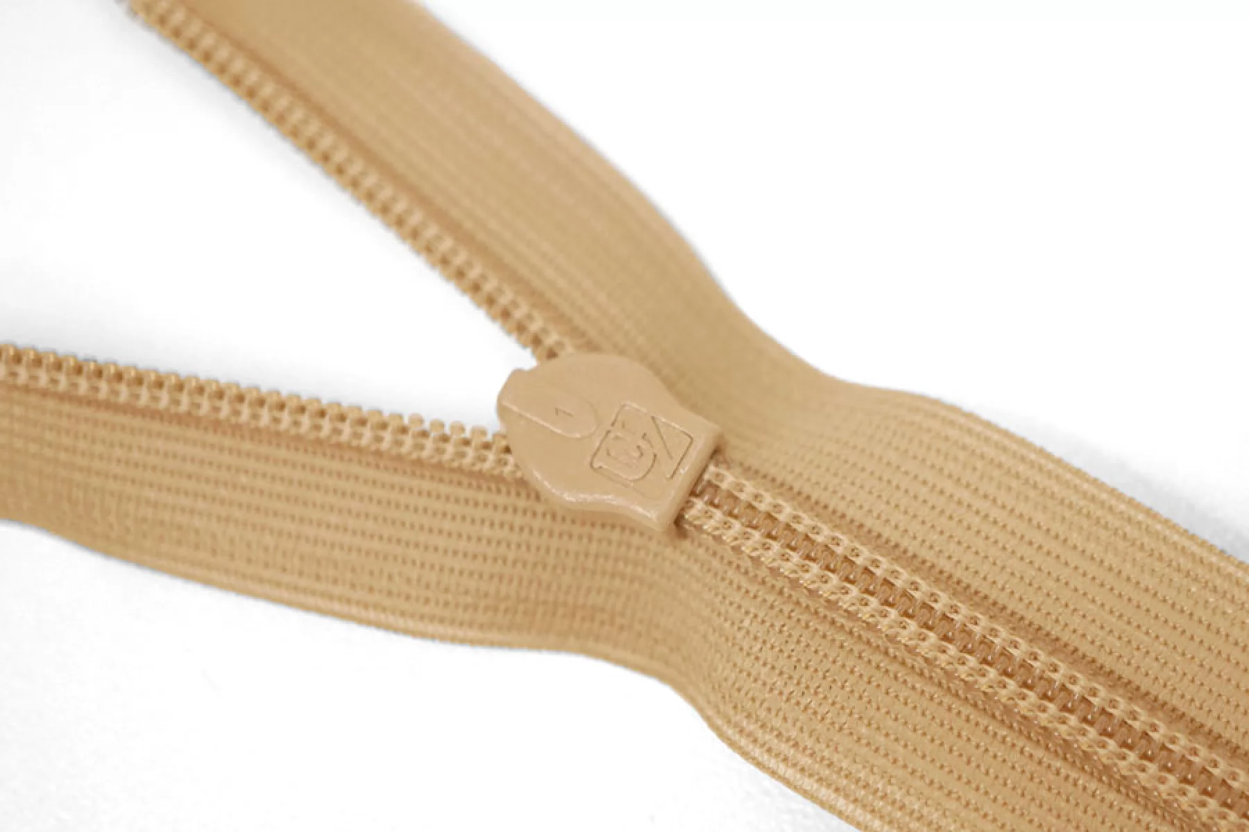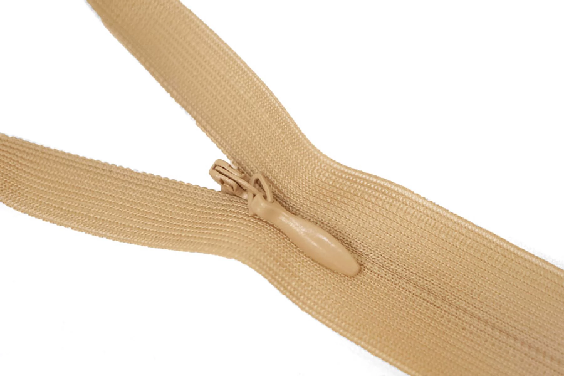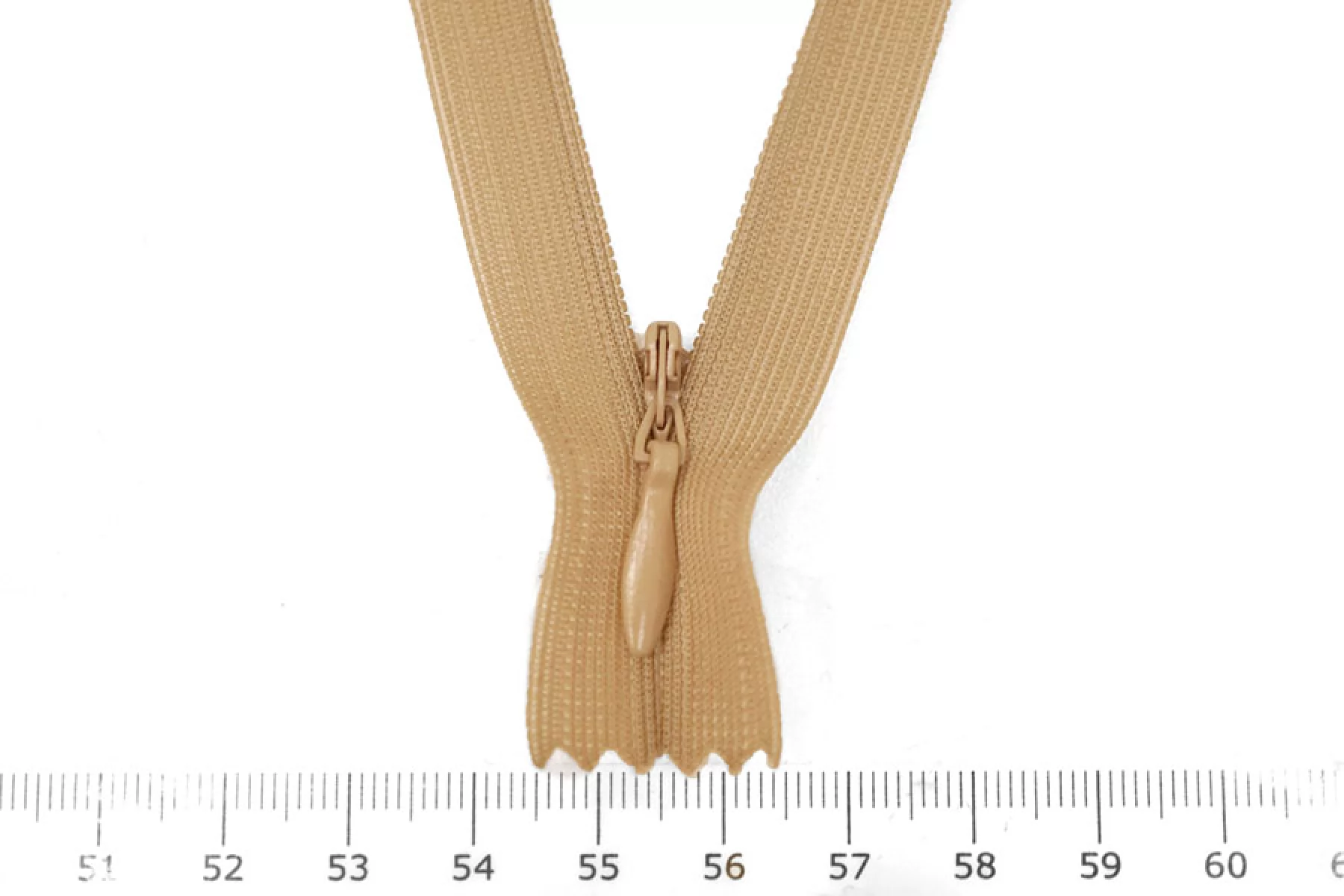 Потайная молния бежевого цвета, длина 26 см. Неразъемная. Зубцы пластиковые, слайдер и пуллер - металл бежевого цвета. Ширина молнии 2,2 см. Ширина зубцов 4 мм.