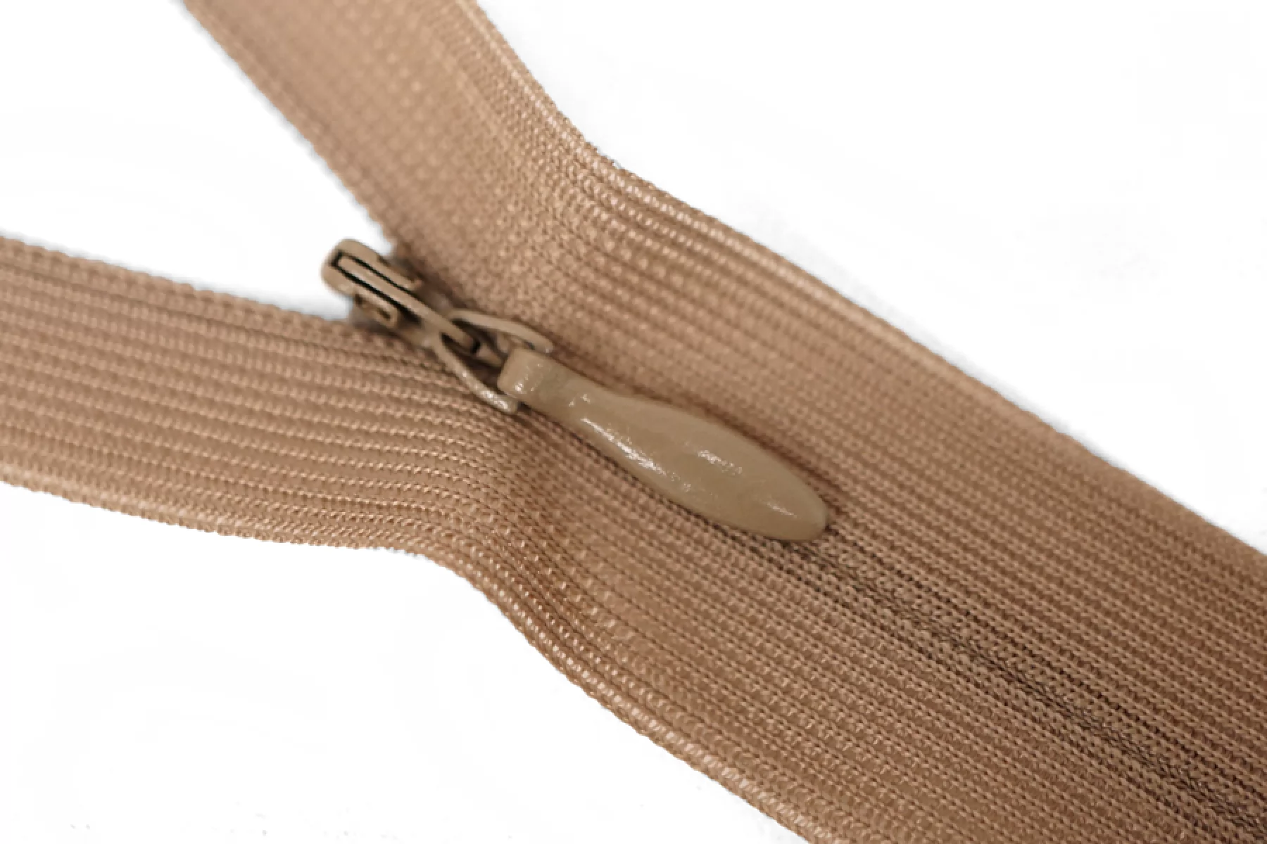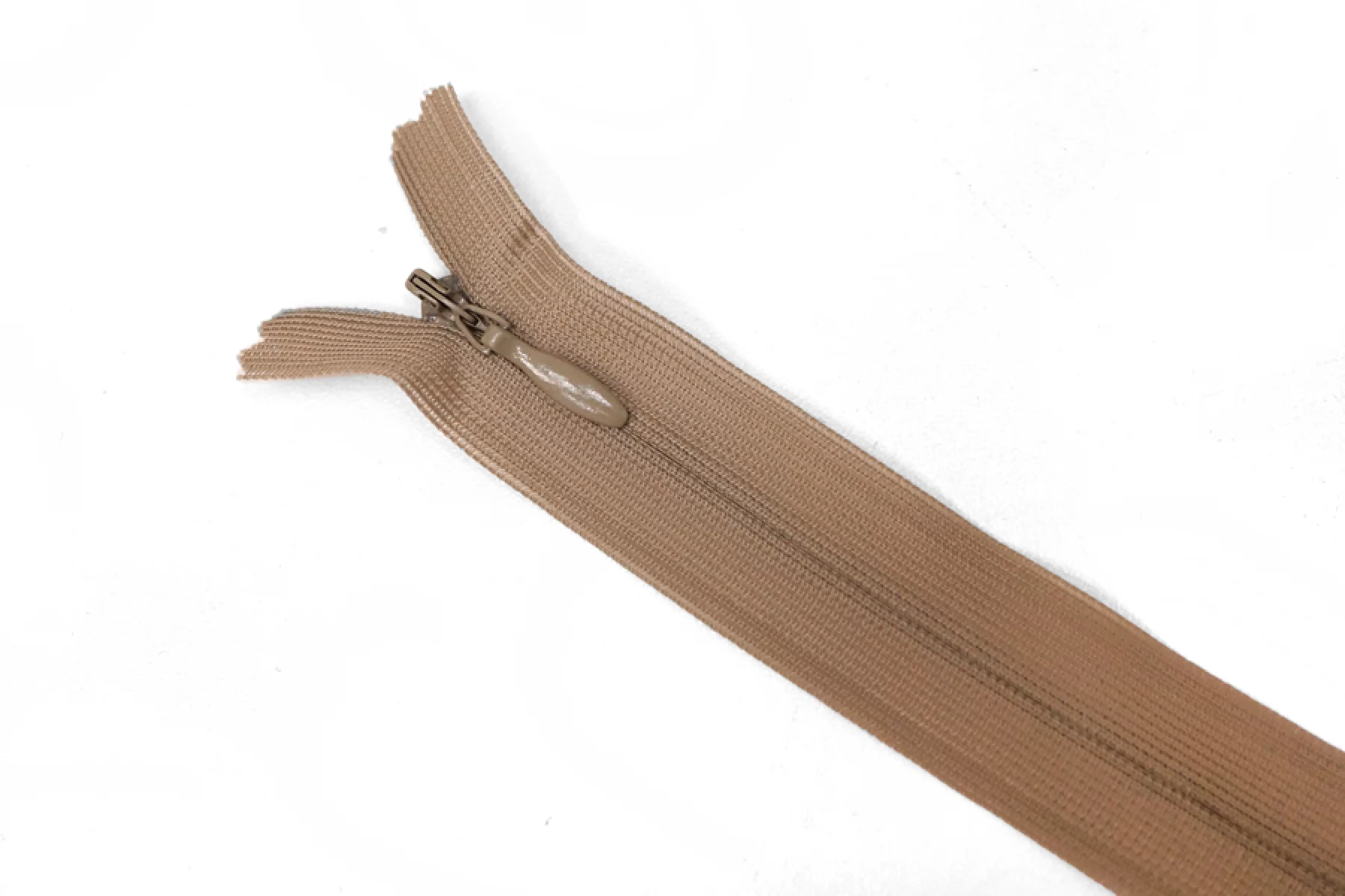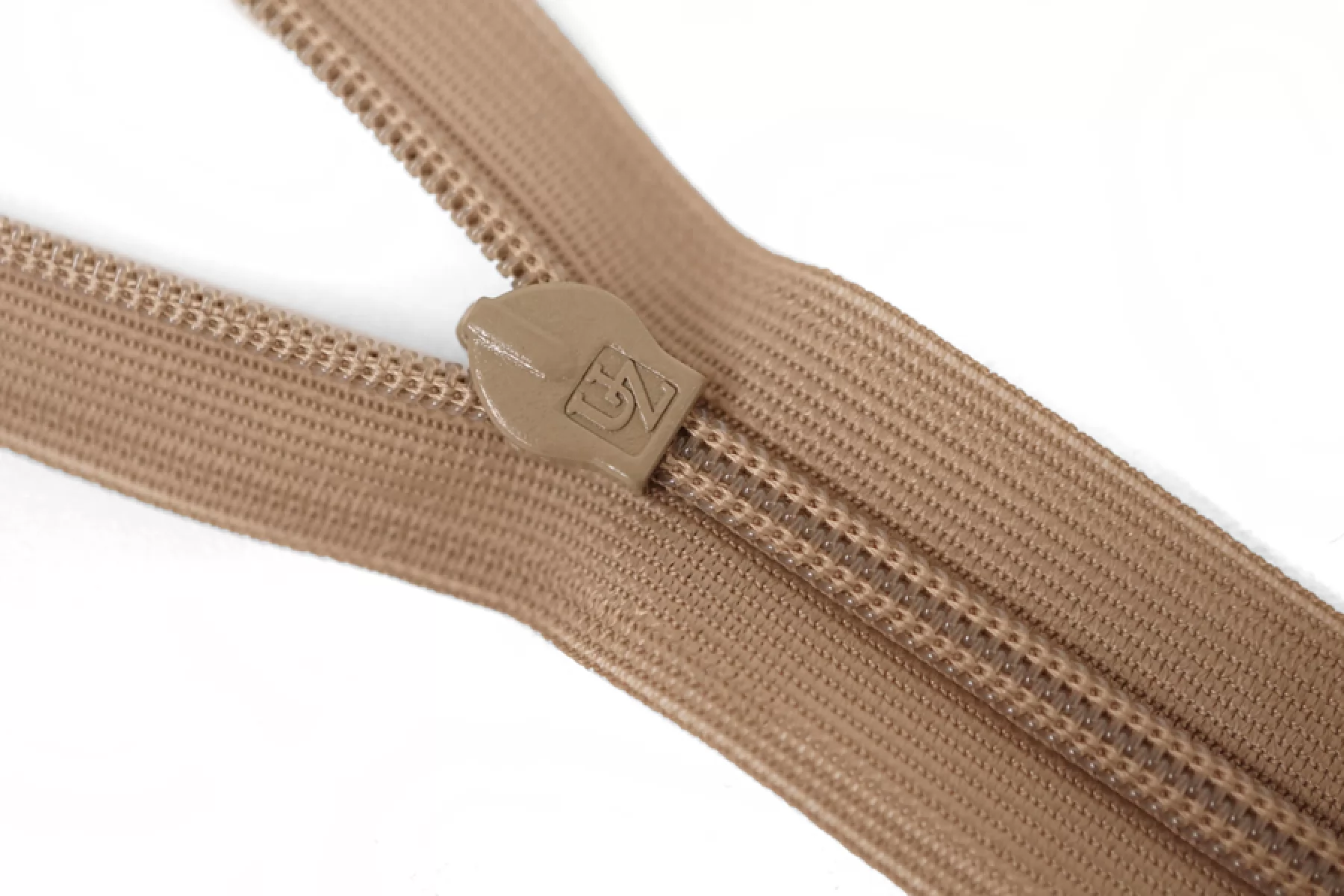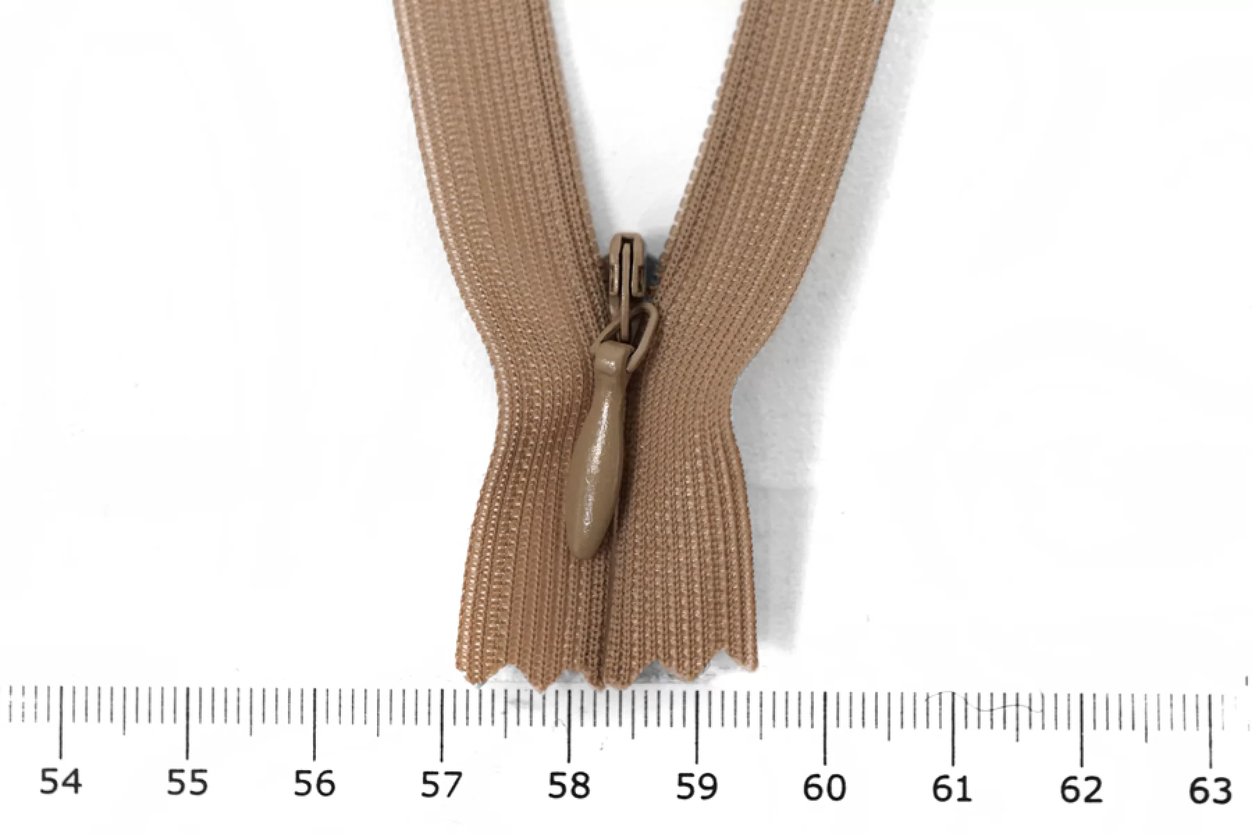 Молния потайная бежевая от бренда UZ , длина 50 см. Неразъемная. Зубцы пластиковые, слайдер и пуллер - металл вцвет молнии. Ширина молнии 2,2 см. Ширина зубцов 4 мм.
