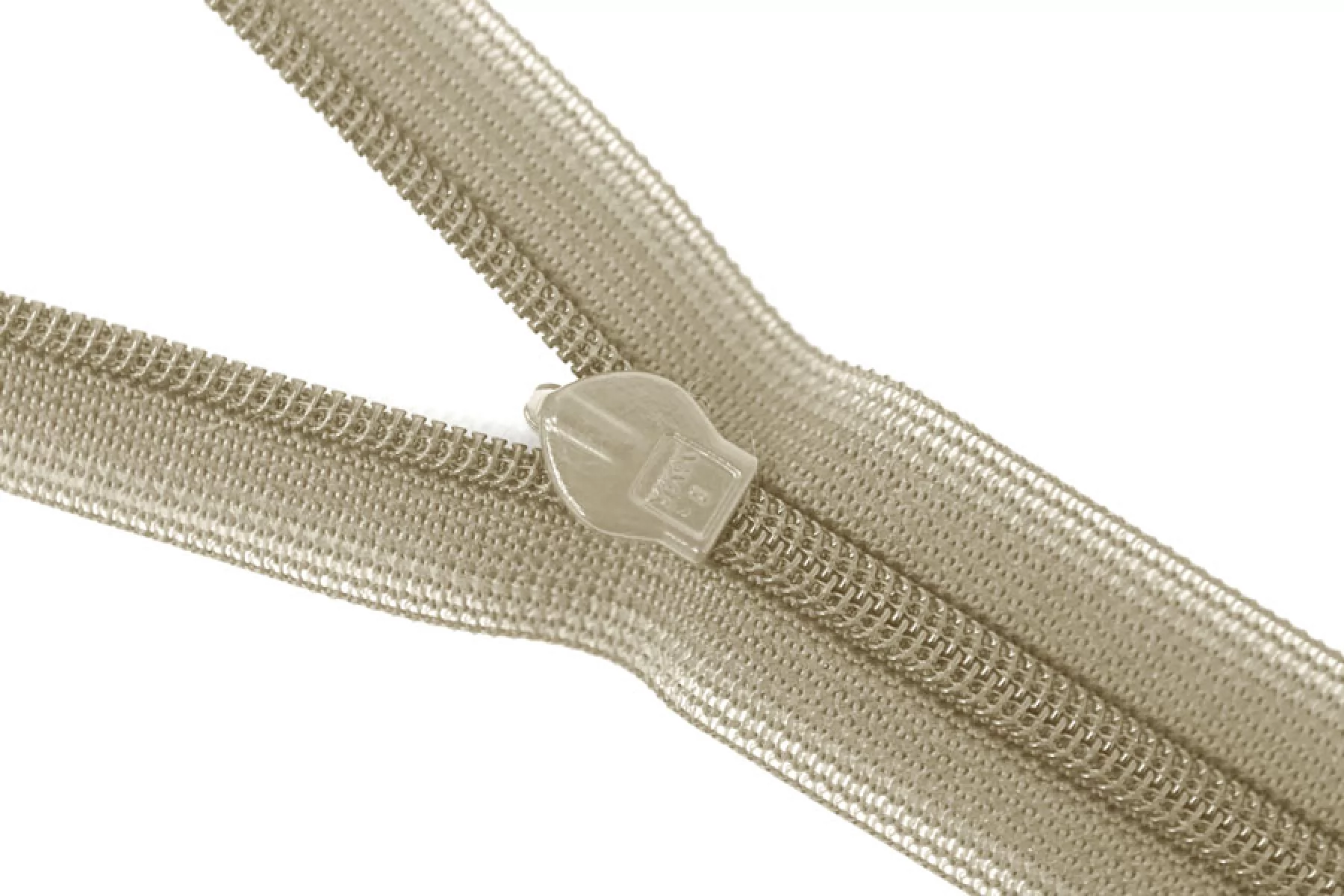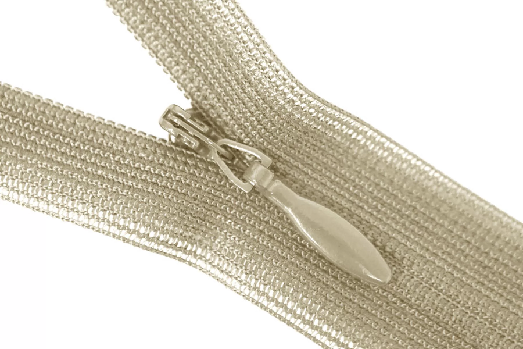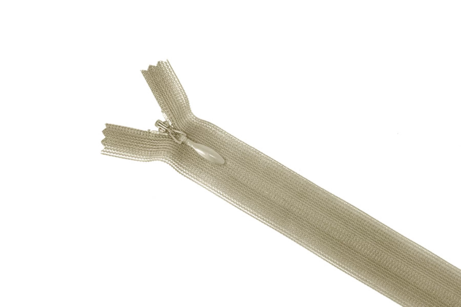 Потайная молния бежево-зеленого цвета , длина 16 см. Слайдер и пуллер - метал. в цвет молнии. Ширина молнии 2.2 см , ширина зубцов 4мм.