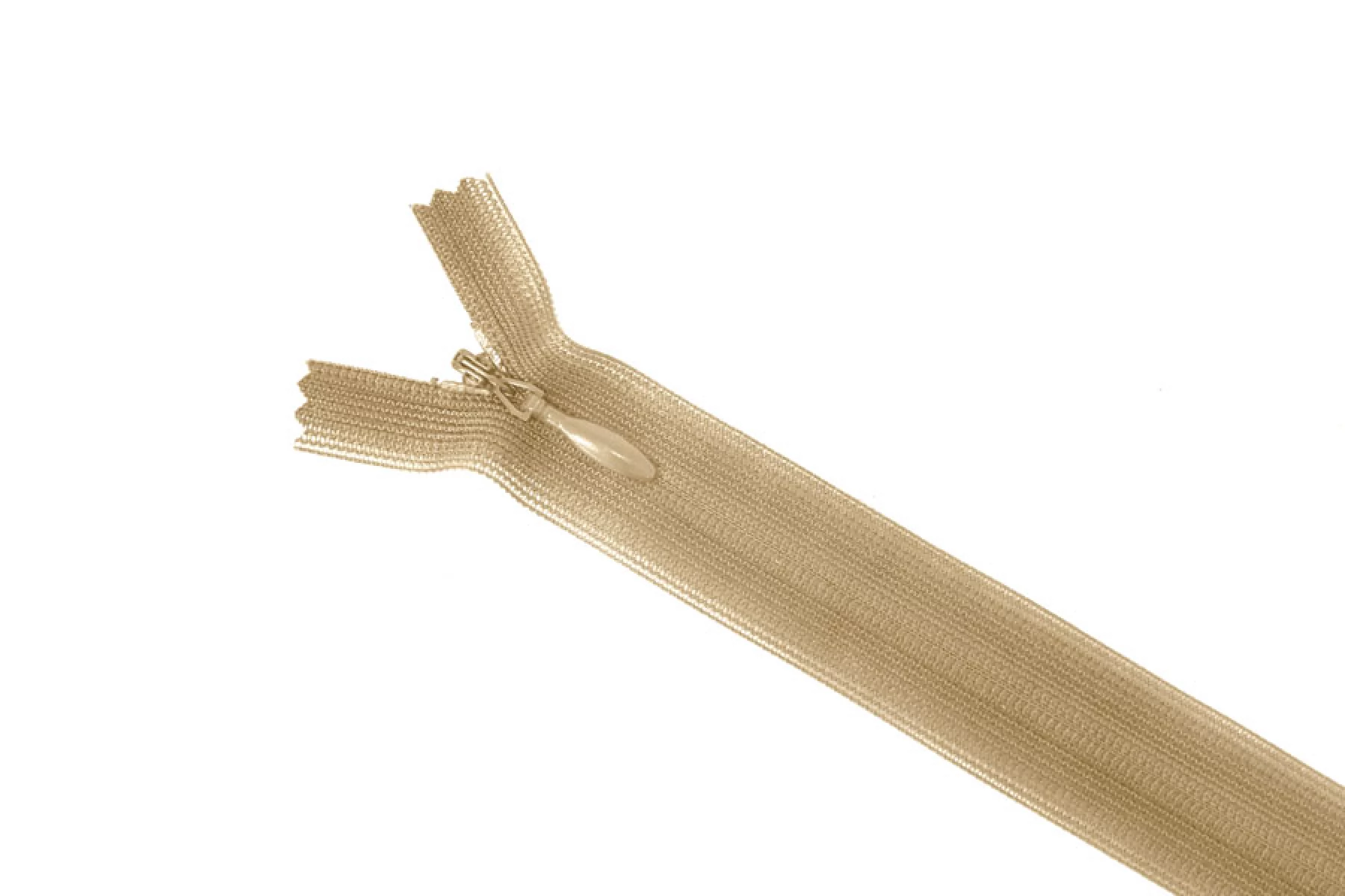 Потайная молния бежево-зеленого цвета , длина 18 см. Слайдер и пуллер - метал. в цвет молнии. Ширина молнии 2.2 см , ширина зубцов 4мм.