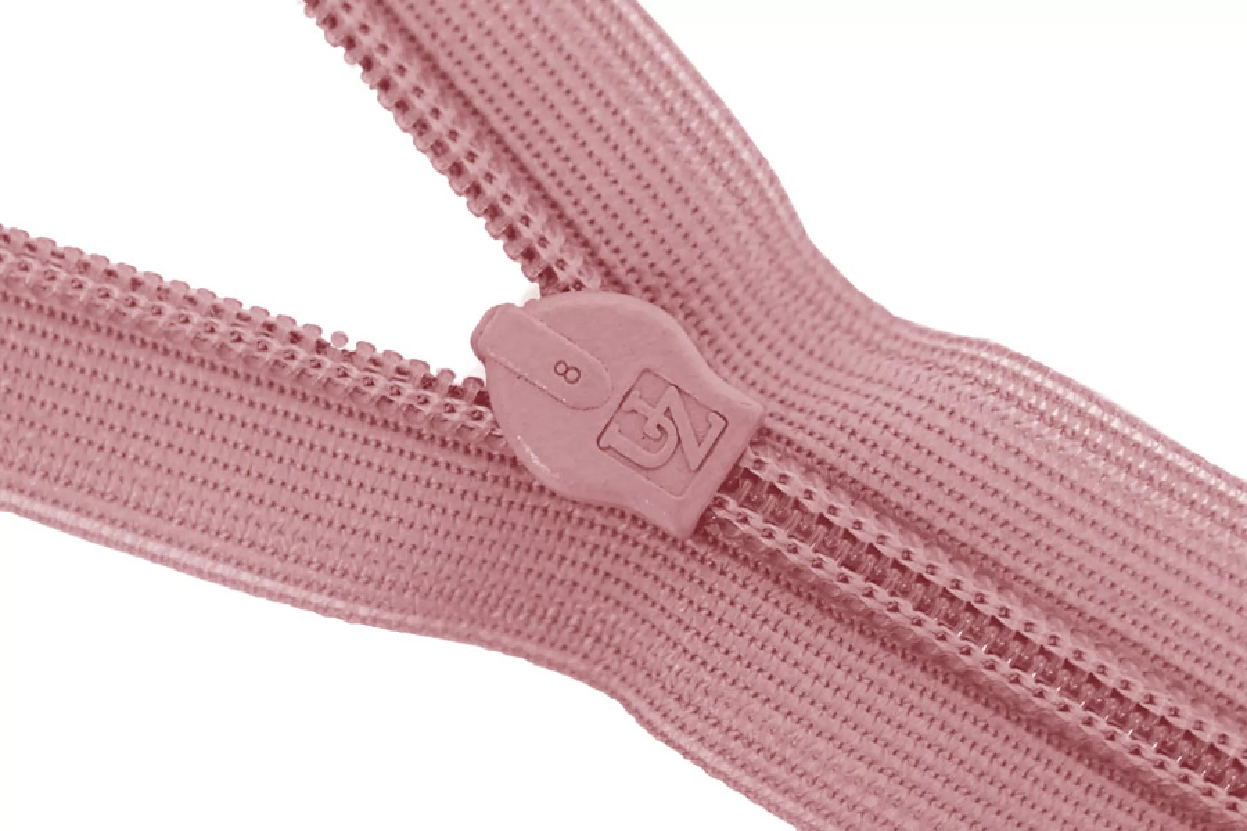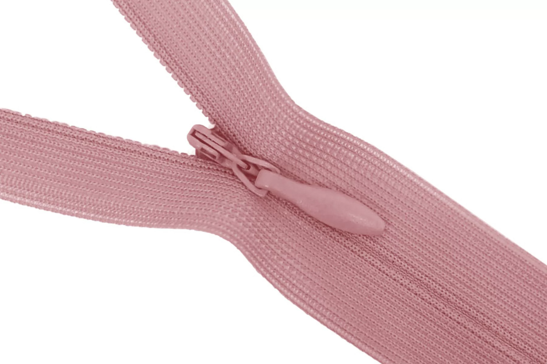 Потайная молния бледно-розового цвета , длина 18 см. Неразъемная. Зубцы пластиковые, слайдер и пуллер - металл. Ширина молнии 2 см. Ширина зубцов 4 мм.
