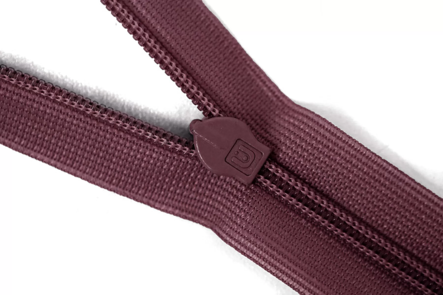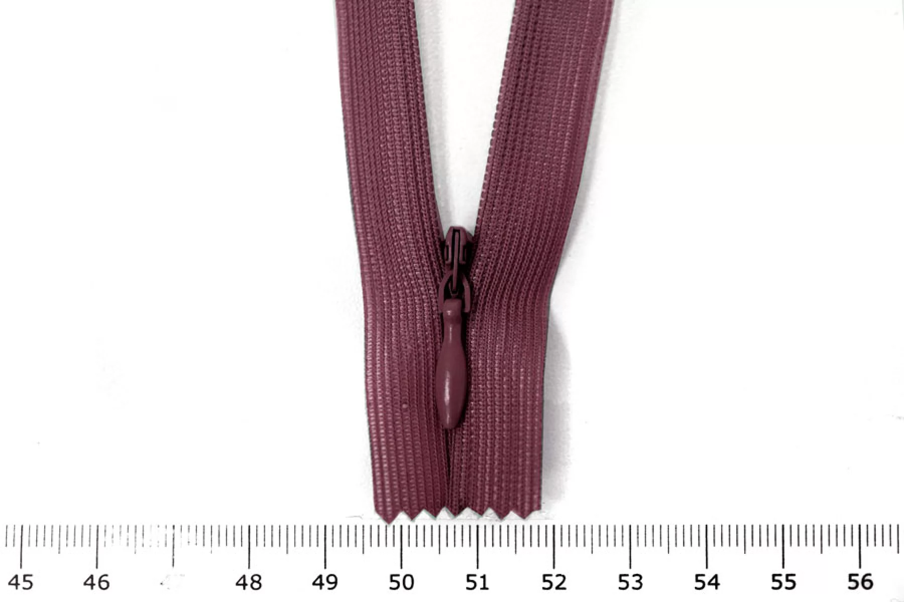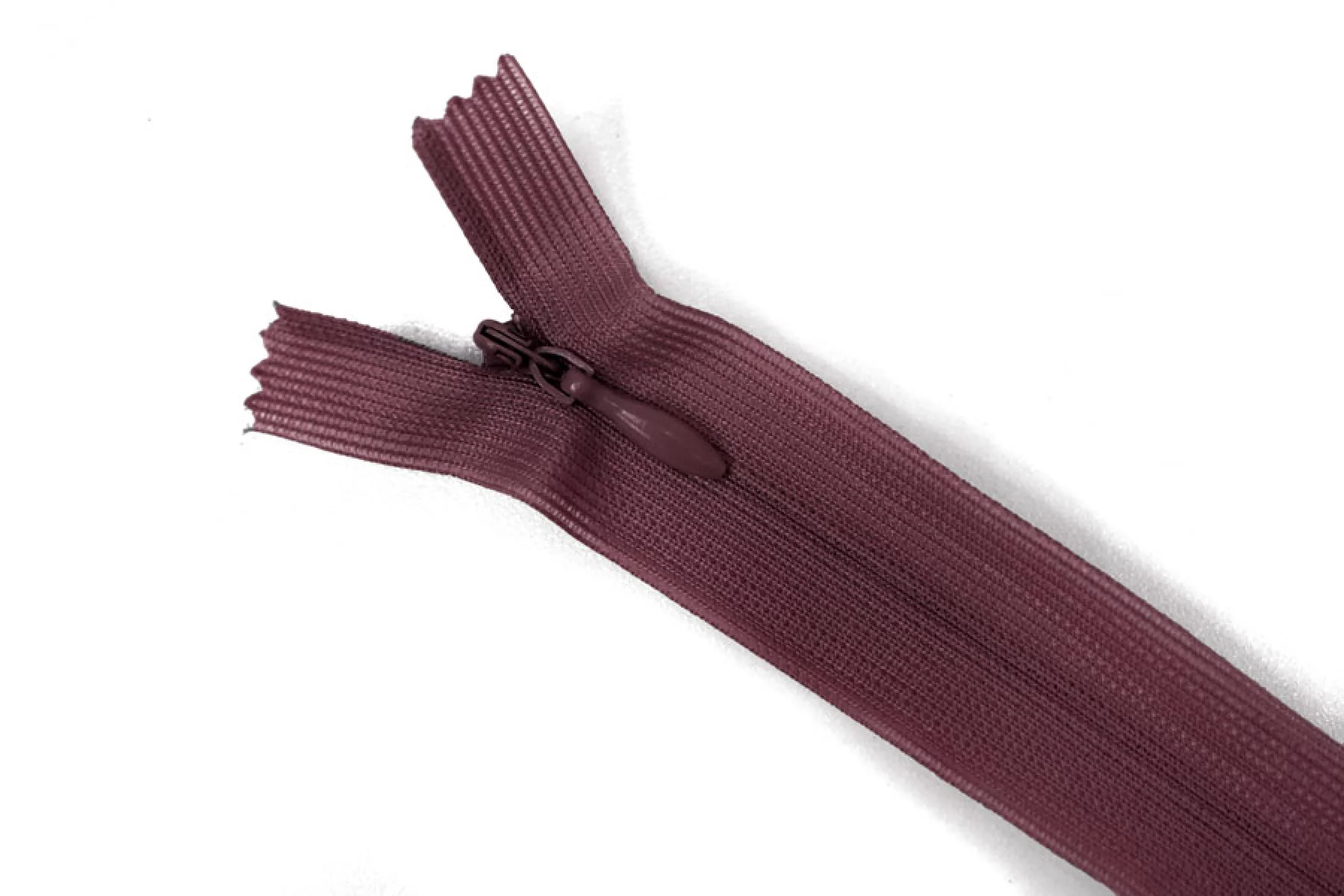 Потайная молния бордового цвета , длина 20 см. Неразъемная. Зубцы пластиковые, слайдер и пуллер - металл. Ширина молнии 2 см. Ширина зубцов 4 мм.